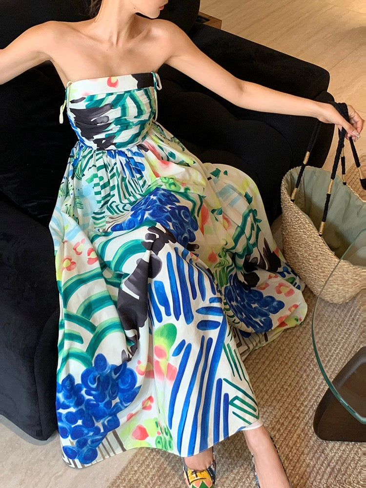 The Donatila dress is a dreamy strapless summer maxi with a hand-painted graffiti watercolor print, covered in playful, fruity florals and chic geometric lines. Vibrant yet soft, it brings a fresh, romantic vibe that’s perfect for sunny escapes or gallery strolls.