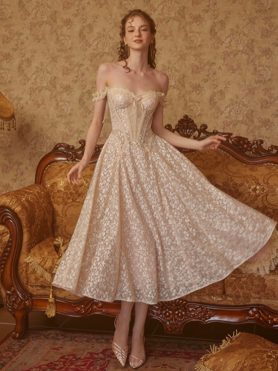 We used our signature fishbone design to sculpt and support the bodice, while adding intricate lace cutouts at the waist for a refined, 3D effect. The peach-heart neckline and molded cups naturally contour the bust, and the adjustable vintage lace straps add a playful touch. An asymmetric waistline flatters the shape, enhanced by a handmade bow for a sweet, feminine finish.