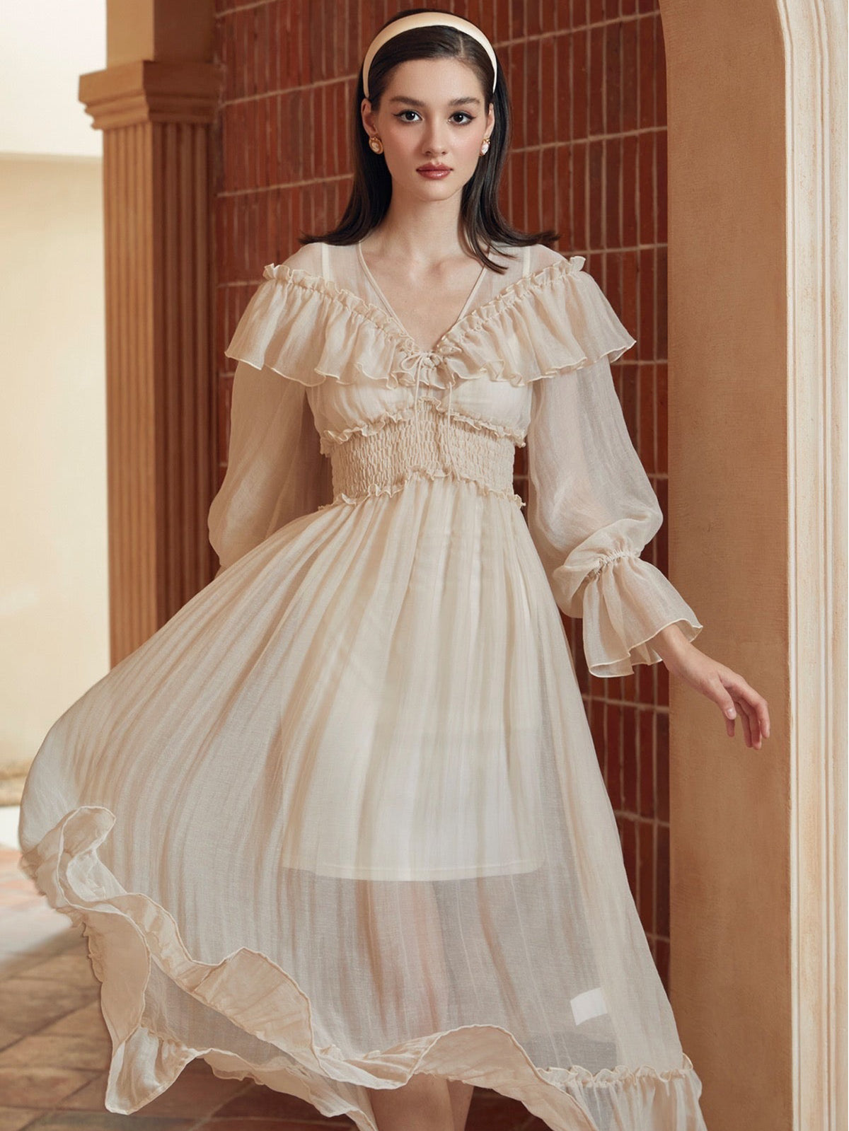 The neckline is framed by fluttery ruffles that feel effortlessly feminine, while the V-cut shows off your collarbones in the most flattering way. The double-layer gathered waist adds gentle structure and support without feeling restrictive—perfect for long days and even longer brunches.