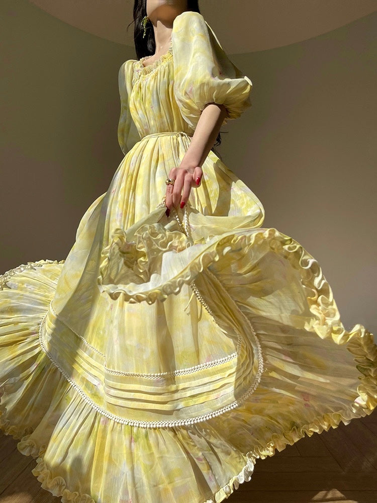 The elegant French square neckline perfectly frames your swan-like neck while revealing your collarbones, and lovely ruffles add a charming touch. Thanks to the comfy elasticized design, the neckline allows for effortless movement. Delicate lace at the hem introduces a playful twist, paired with three exquisite pleats that gracefully cascade down the skirt, enhancing the slimming effect and drape.