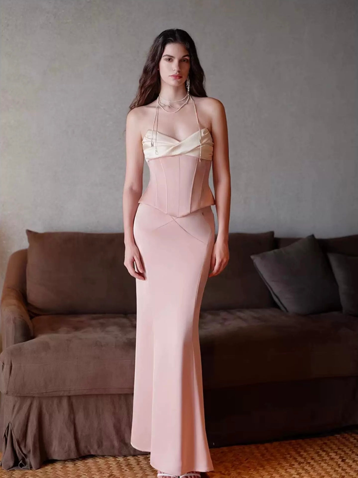 Elevate your evening wear with the Meeya 2-Piece Set, featuring a stunning combination of a sculpted corset top and a sleek, figure-hugging skirt. This elegant ensemble is designed to accentuate your curves, showcasing a luxurious satin finish and intricate detailing.