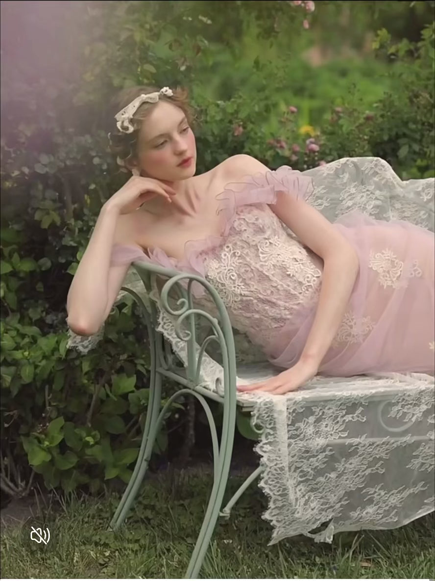The off-shoulder neckline frames the collarbones beautifully, balanced with airy ruffled mesh that flutters like petals in motion.