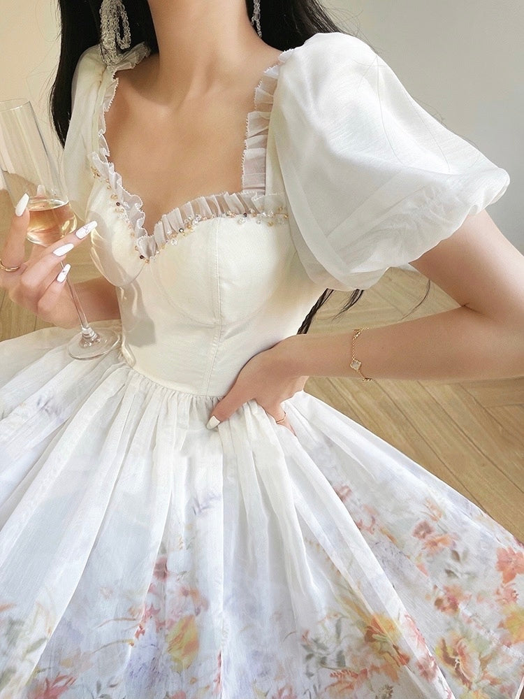 The bodice is softly structured with built-in cups that lift and shape naturally, while delicate ruffle trims and peekaboo details add a subtle flirtiness. The puff sleeves are lightly gathered with a hidden padded shoulder and elastic cuffs for volume without bulk—so charming and comfortable.