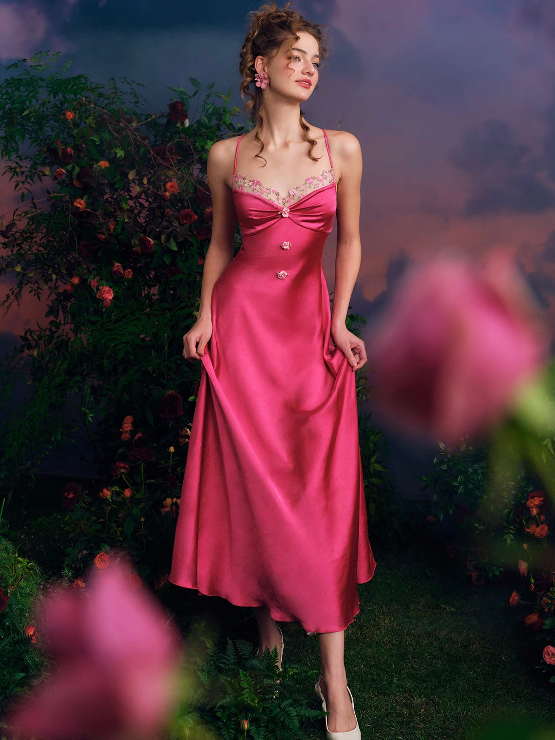 The Tiana dress embodies romantic elegance with its luxurious satin fabric, perfect for graceful evening outings. This long, flowing gown features delicate spaghetti straps and a flattering sweetheart neckline adorned with intricate floral lace, enhancing its feminine allure. The vibrant pink hue evokes a sense of playfulness, making it an ideal choice for elegant dinners, formal gatherings, or summer weddings.