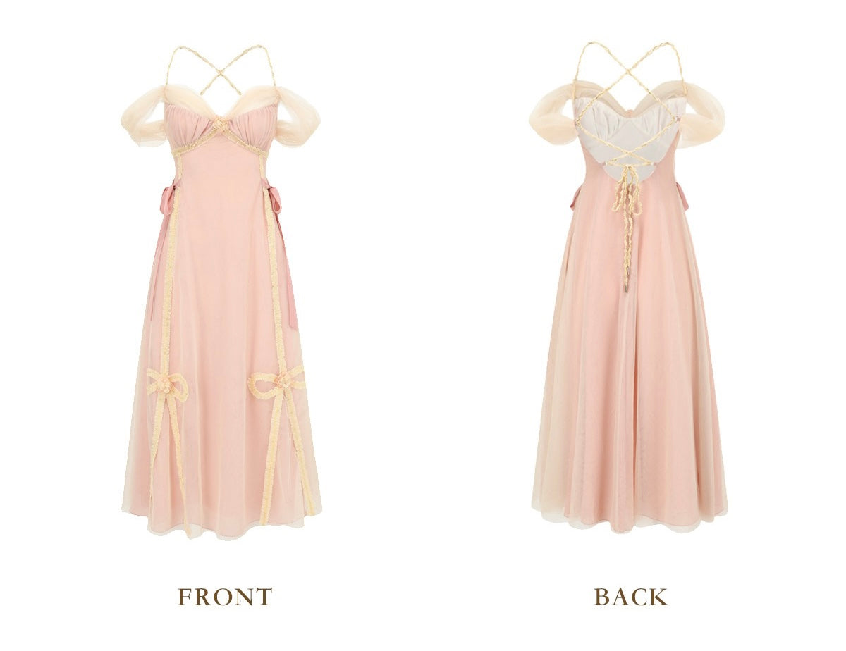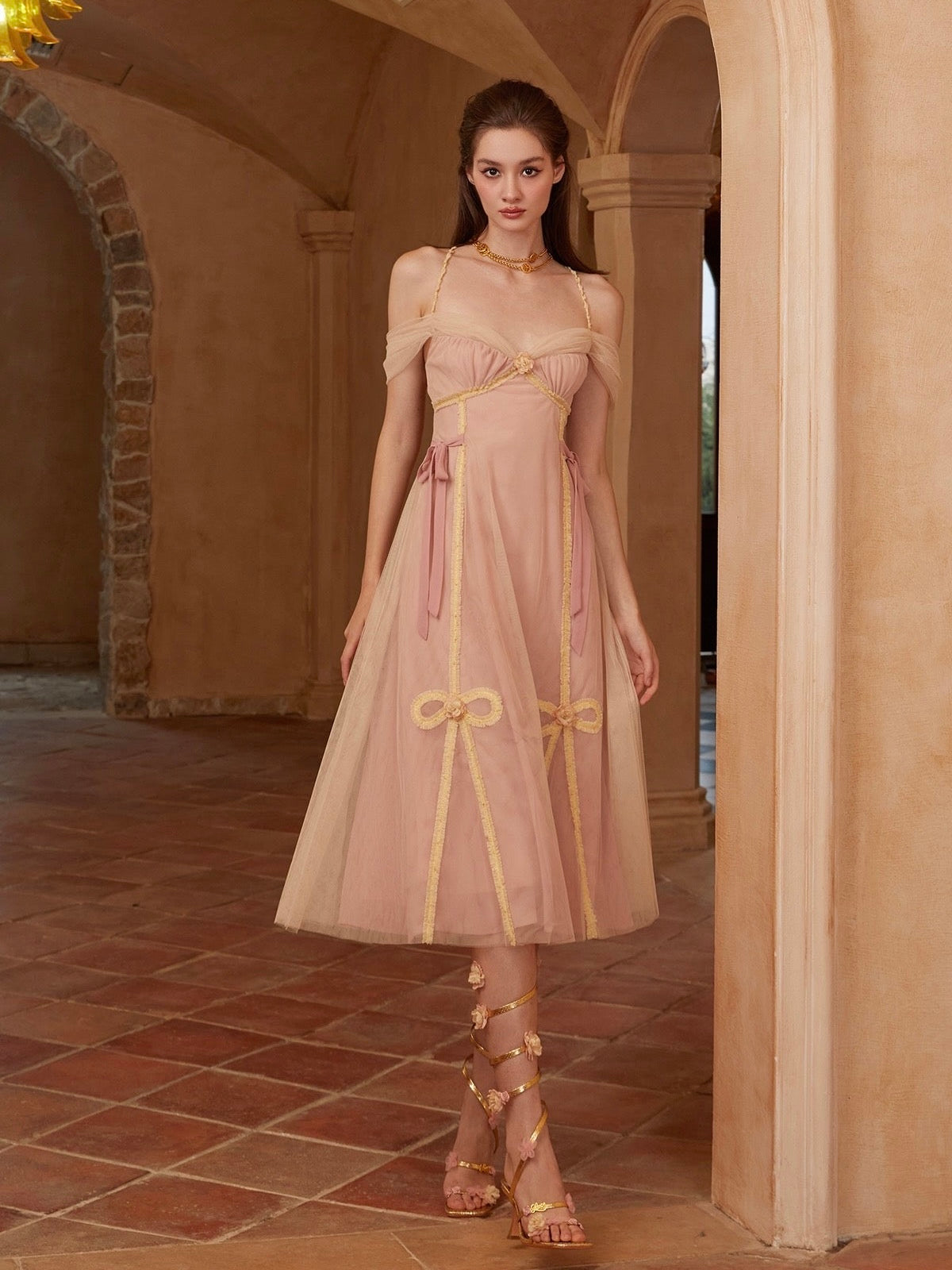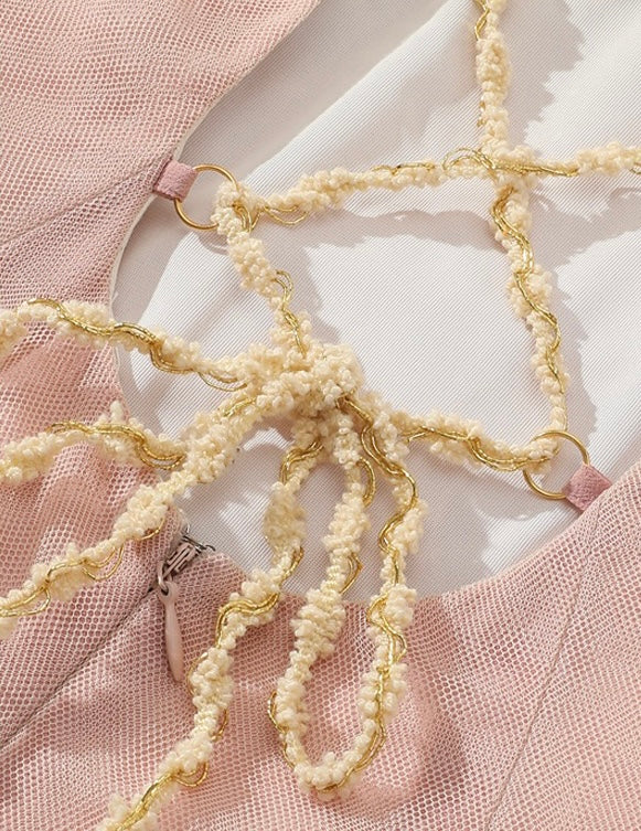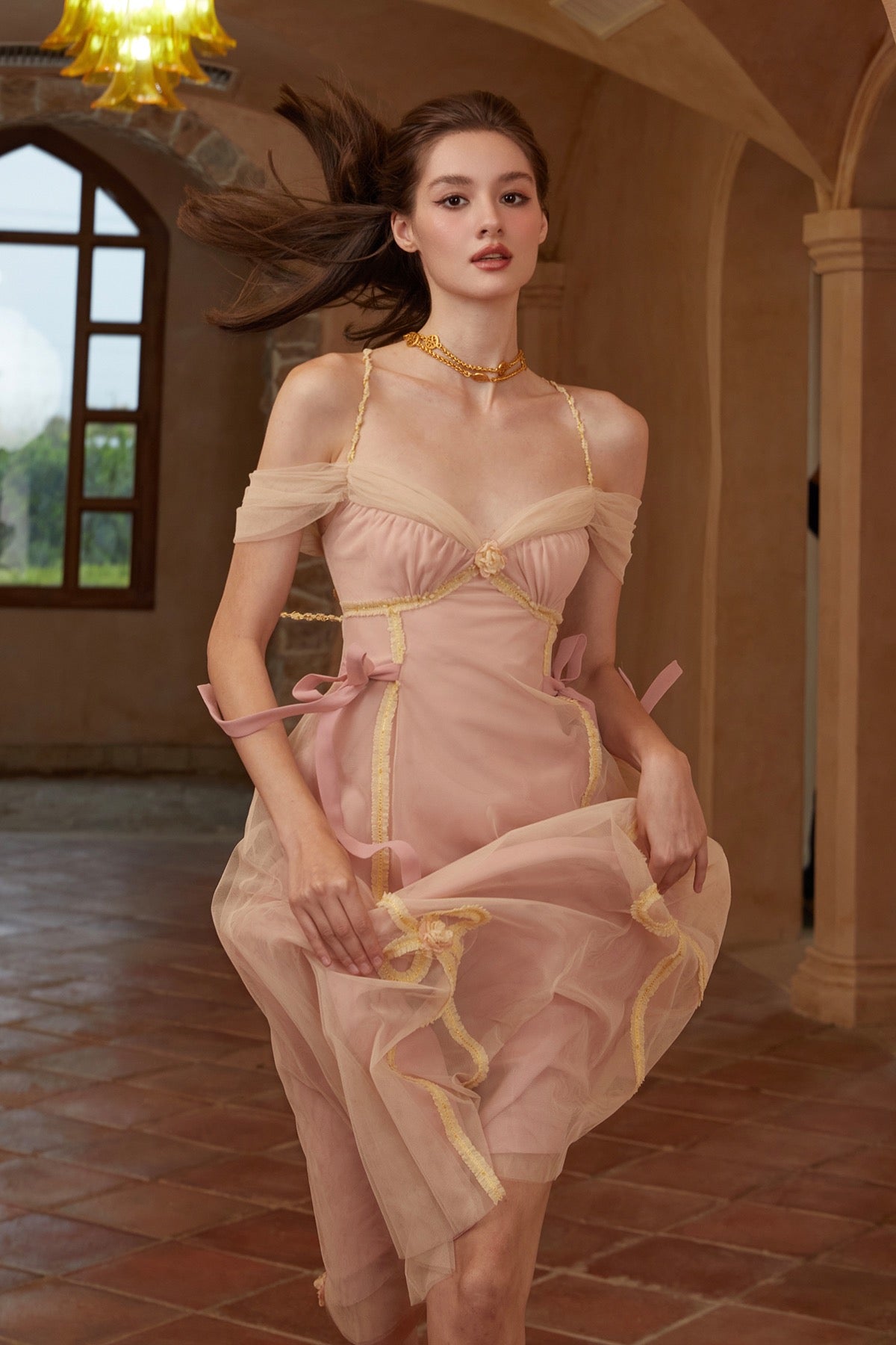 The golden thin straps are adjustable, ensuring a perfect fit tailored to your unique silhouette. Meanwhile, the mesh bodice features a lovely design that balances comfort with a sweet allure—it's that pinch of charm every princess needs! With a delightful waist tie that can be adjusted to highlight your desired shape, this dress is all about celebrating your beautiful curves.
