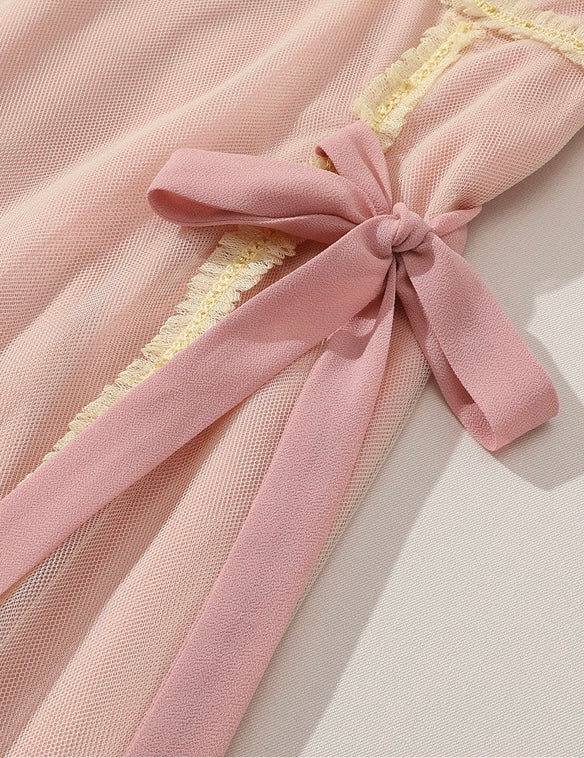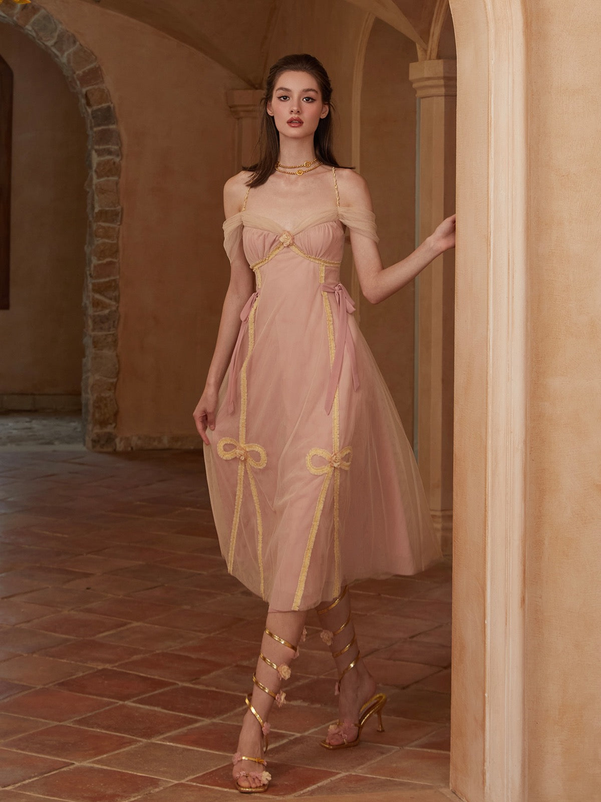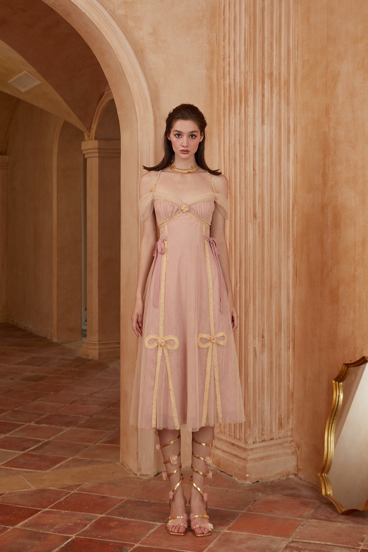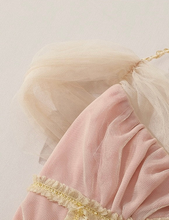 The golden thin straps are adjustable, ensuring a perfect fit tailored to your unique silhouette. Meanwhile, the mesh bodice features a lovely design that balances comfort with a sweet allure—it's that pinch of charm every princess needs! With a delightful waist tie that can be adjusted to highlight your desired shape, this dress is all about celebrating your beautiful curves.