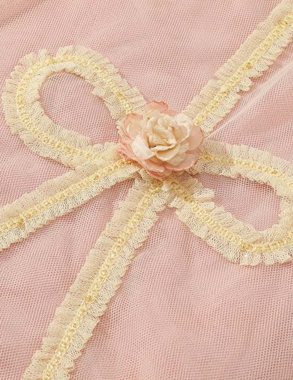 At the hem, a handcrafted ribbon bow is meticulously sewn, adding a whimsical touch that elevates the overall sweetness of the design. Flowered edges at the neckline and hem, with a slightly burnt finish, serve as the perfect vintage-inspired accent, giving a nod to classic beauty while keeping things fresh and fun.