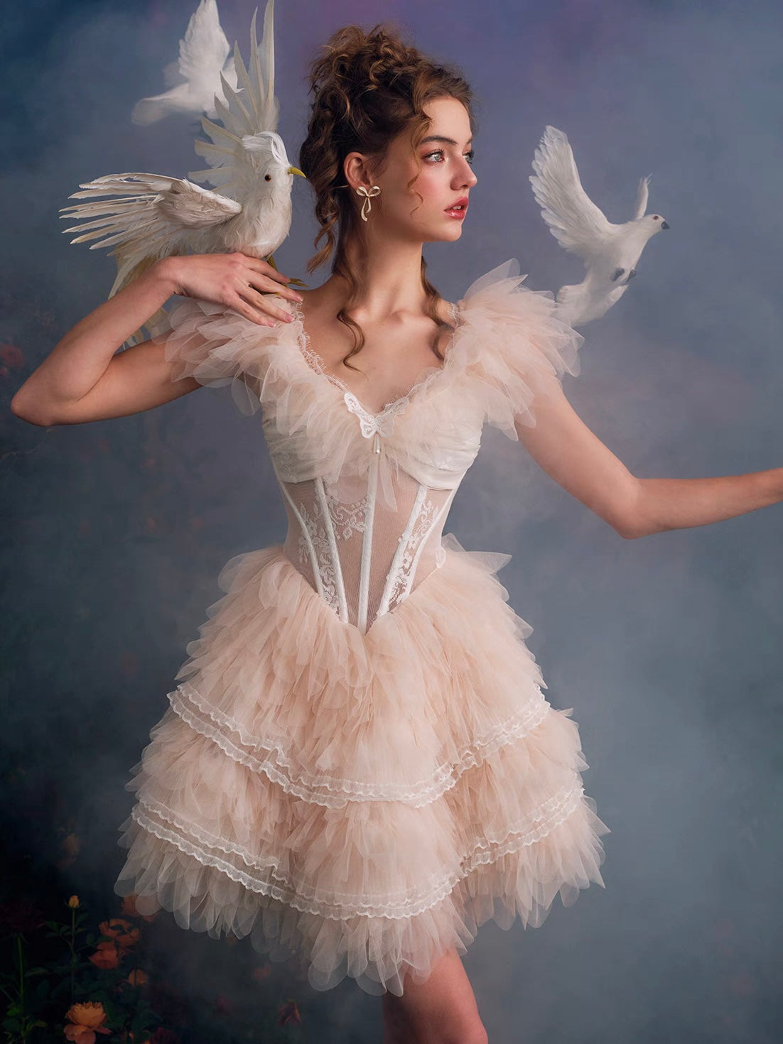 The Candace dress is a sublime embodiment of French romantic couture, featuring an enchanting light pink tulle design that transcends traditional eveningwear. This exquisite dress showcases a meticulously crafted corset-style bodice with delicate sheer panels and intricate floral embroidery, beautifully accentuates the waist, creating a dreamy, ethereal silhouette.
