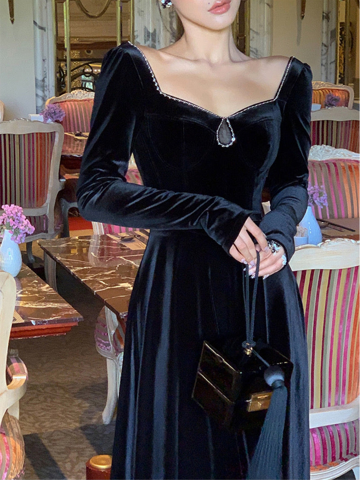 The velvet material is soft, smooth, and skin-friendly, with an elegant drape that enhances body contours. Its subtle sheen catches the light, adding a touch of vintage glamour to the overall look.