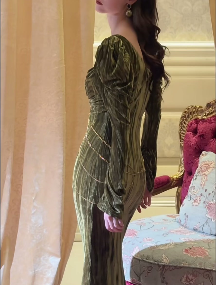 Made from lustrous pleated velvet with a soft stretch, ‘Medusa’ has that gorgeous glossy sheen that catches light like magic—rich, regal, and full of texture. The neckline plays with illusion thanks to a layered-effect panel trimmed in shimmering gold lace, giving it a statement-worthy finish that feels totally timeless.