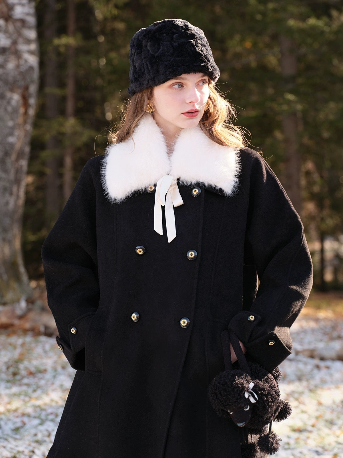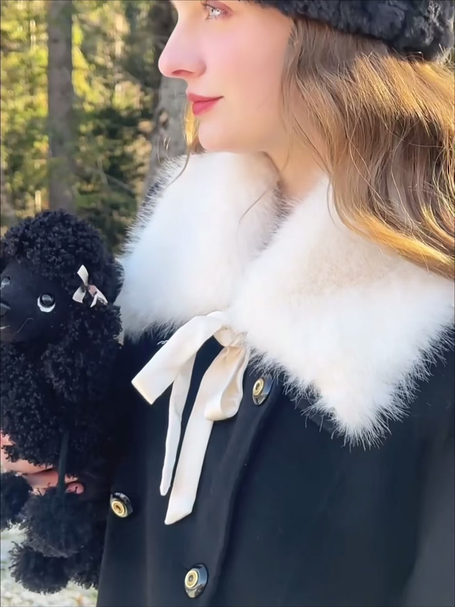 The classic lapel comes with a detachable faux fur collar, complete with a satin ribbon tie that adds just the right amount of soft drama. Whether you’re going full “old-money” or keeping things simple, ‘Pascalette’ suits any mood.