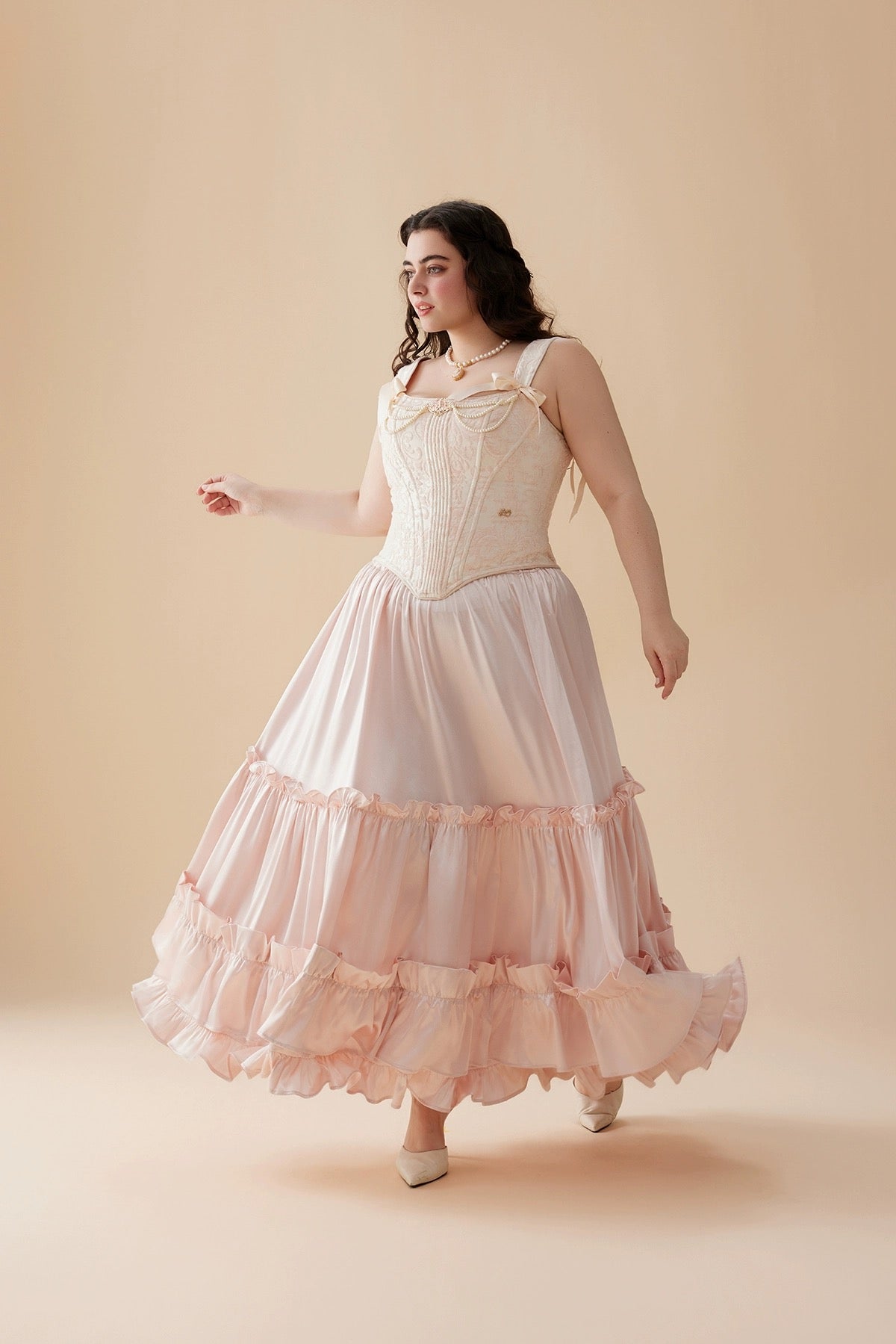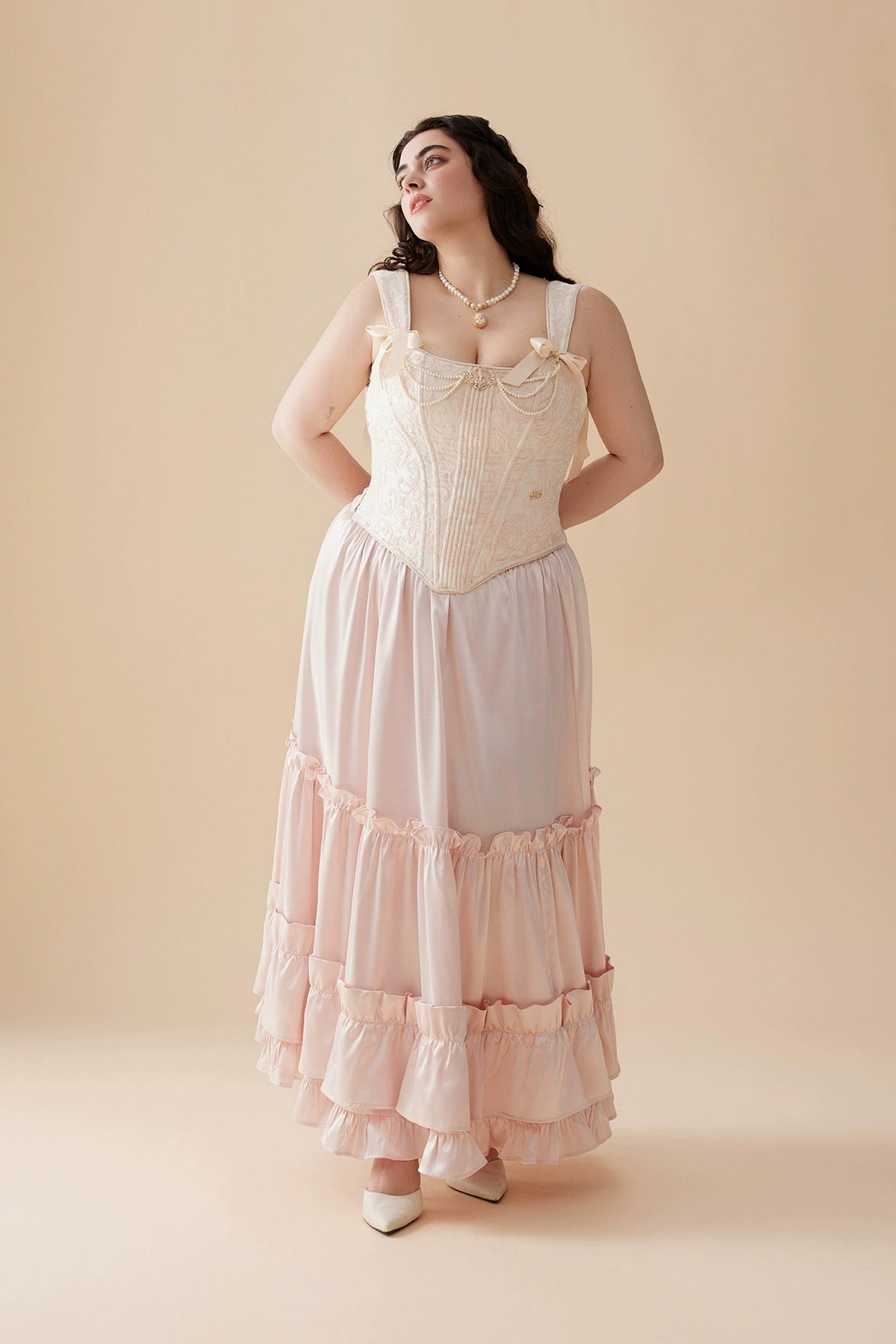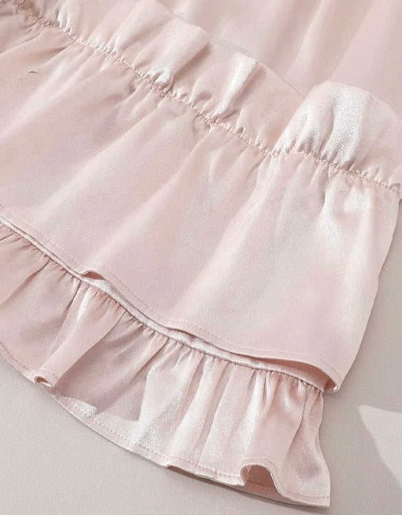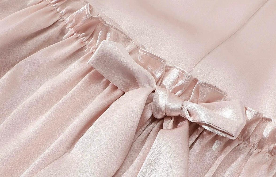 We finished the look with delicate ruffles at the hem, and a pretty bow at the back that adds a sweet surprise. The satiny sheen catches the light in all the right ways, making this one a total heart-stealer.