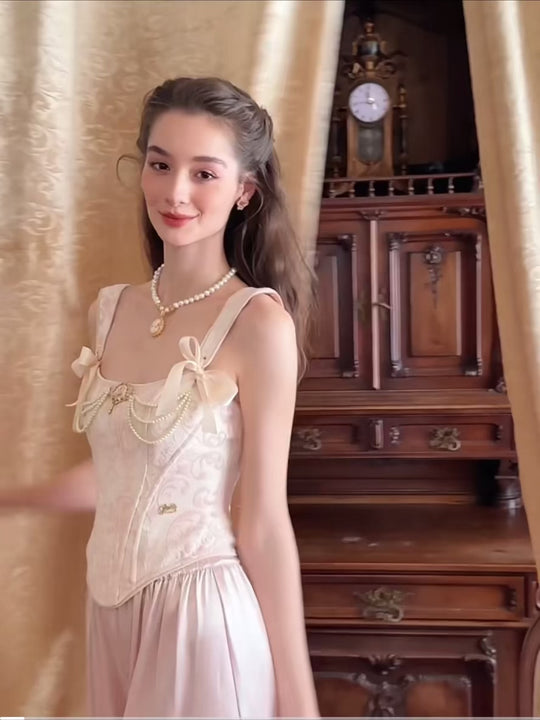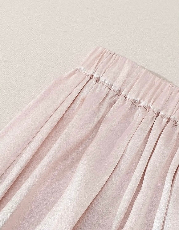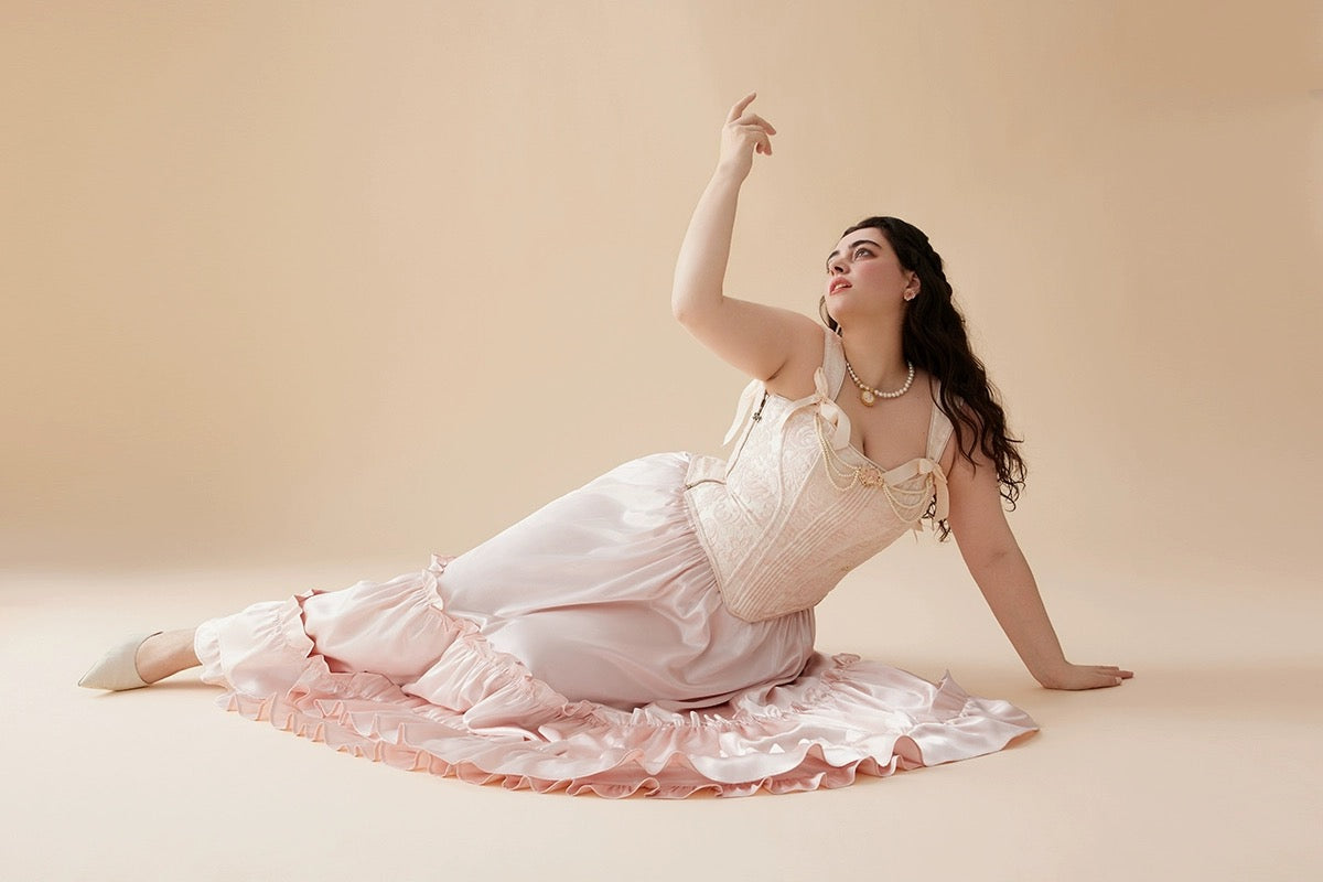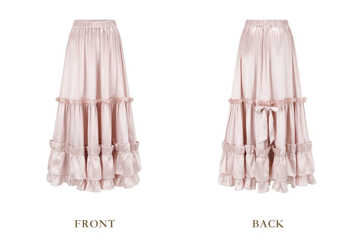 We finished the look with delicate ruffles at the hem, and a pretty bow at the back that adds a sweet surprise. The satiny sheen catches the light in all the right ways, making this one a total heart-stealer.