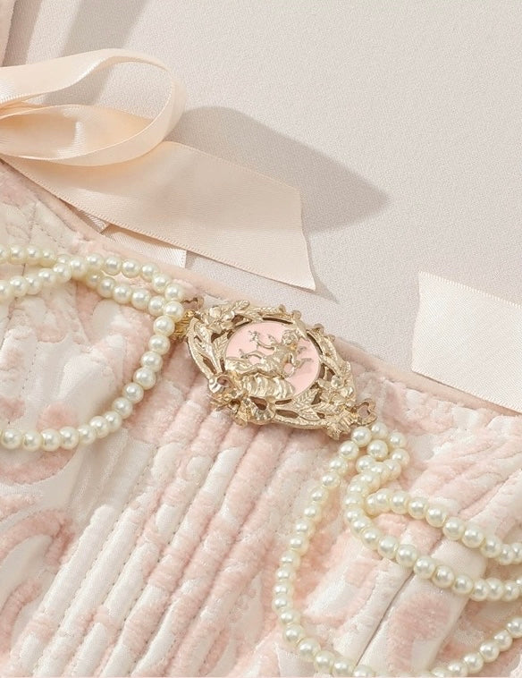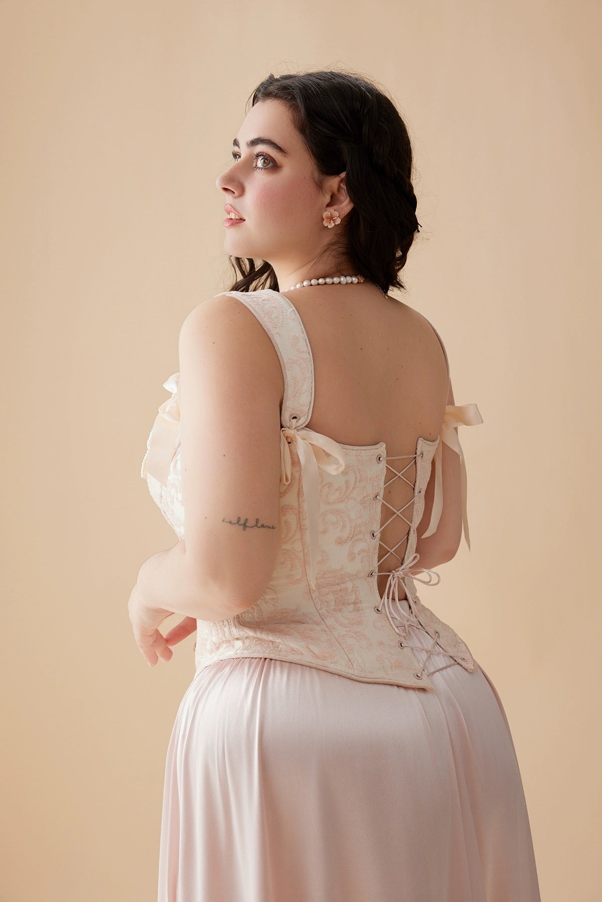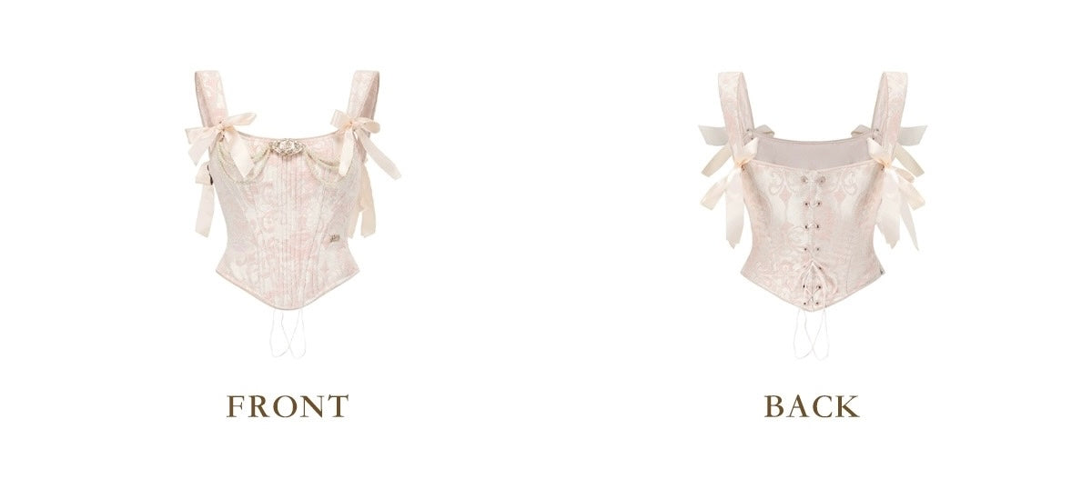 What’s the cherry on top? The intricately designed three-dimensional pearl brooch that steals the show and adds a touch of opulence. Plus, the custom logo zipper on the side ensures effortless dressing while keeping the overall aesthetic polished and the classic lace-up back design cinches the waist perfectly. This top is all about the finer things.