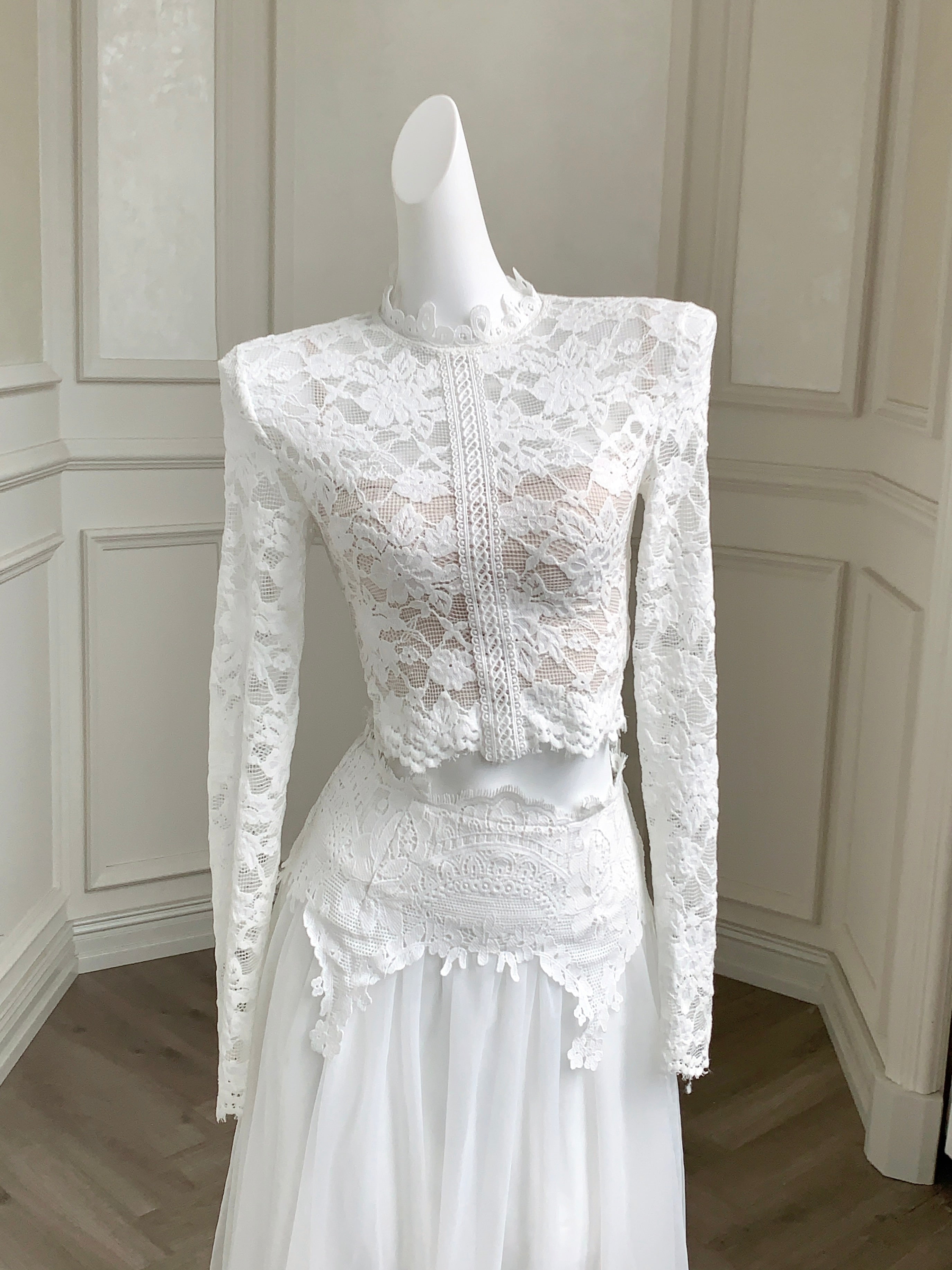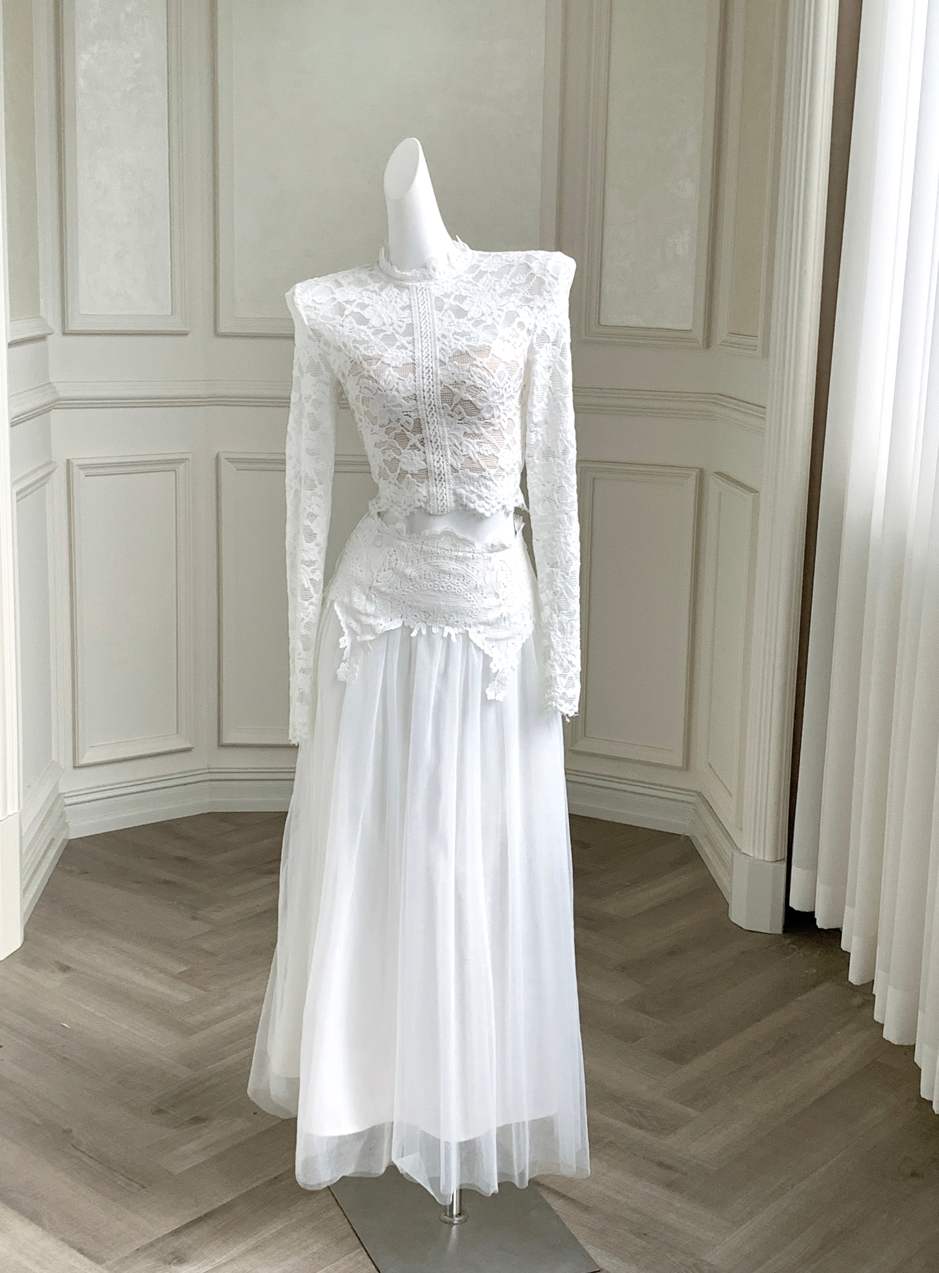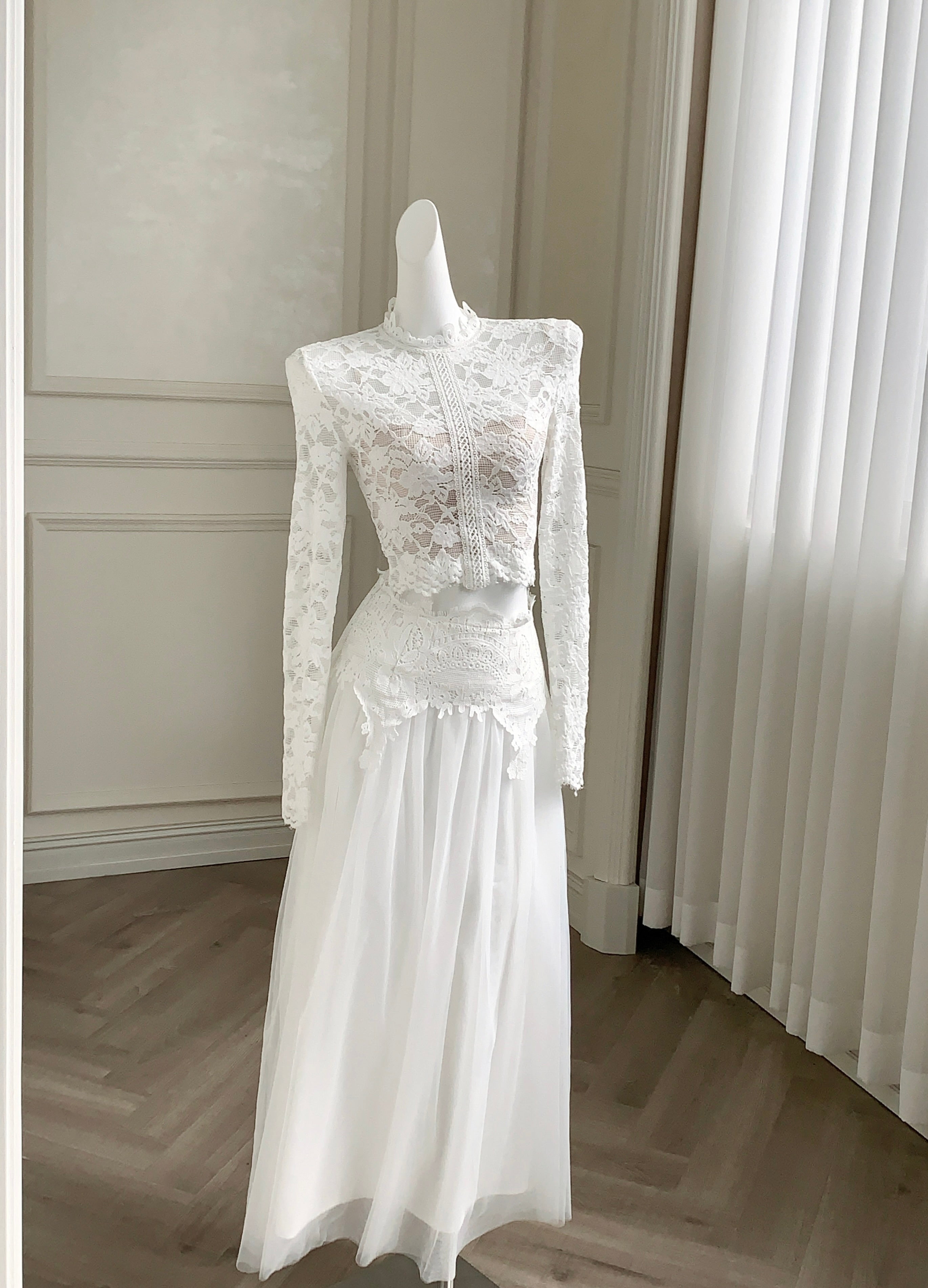A vision of refined sensuality, ‘Floravelle’ pairs a delicate lace blouse with a voluminous tulle skirt to bring your inner muse to life. The top features a high collar trimmed with vintage-style lace, designed to frame the neckline with soft structure, a romantic alternative to ordinary V or round necklines. The tonal lace detailing continues down the center, drawing the eye in and adding gentle rhythm and movement to the silhouette.