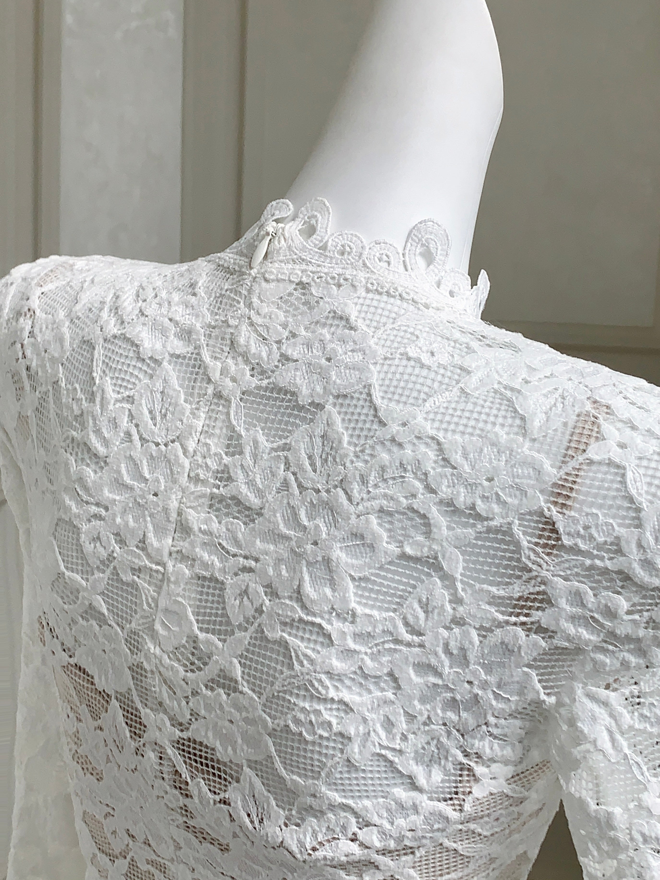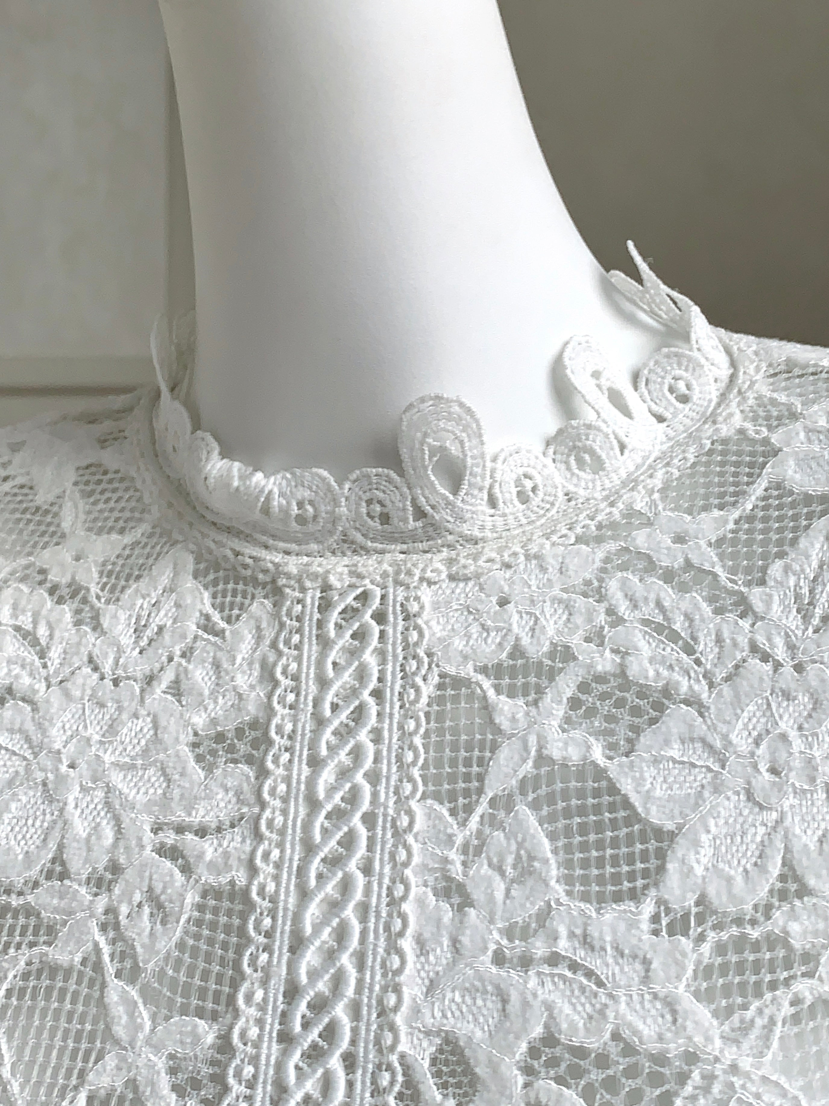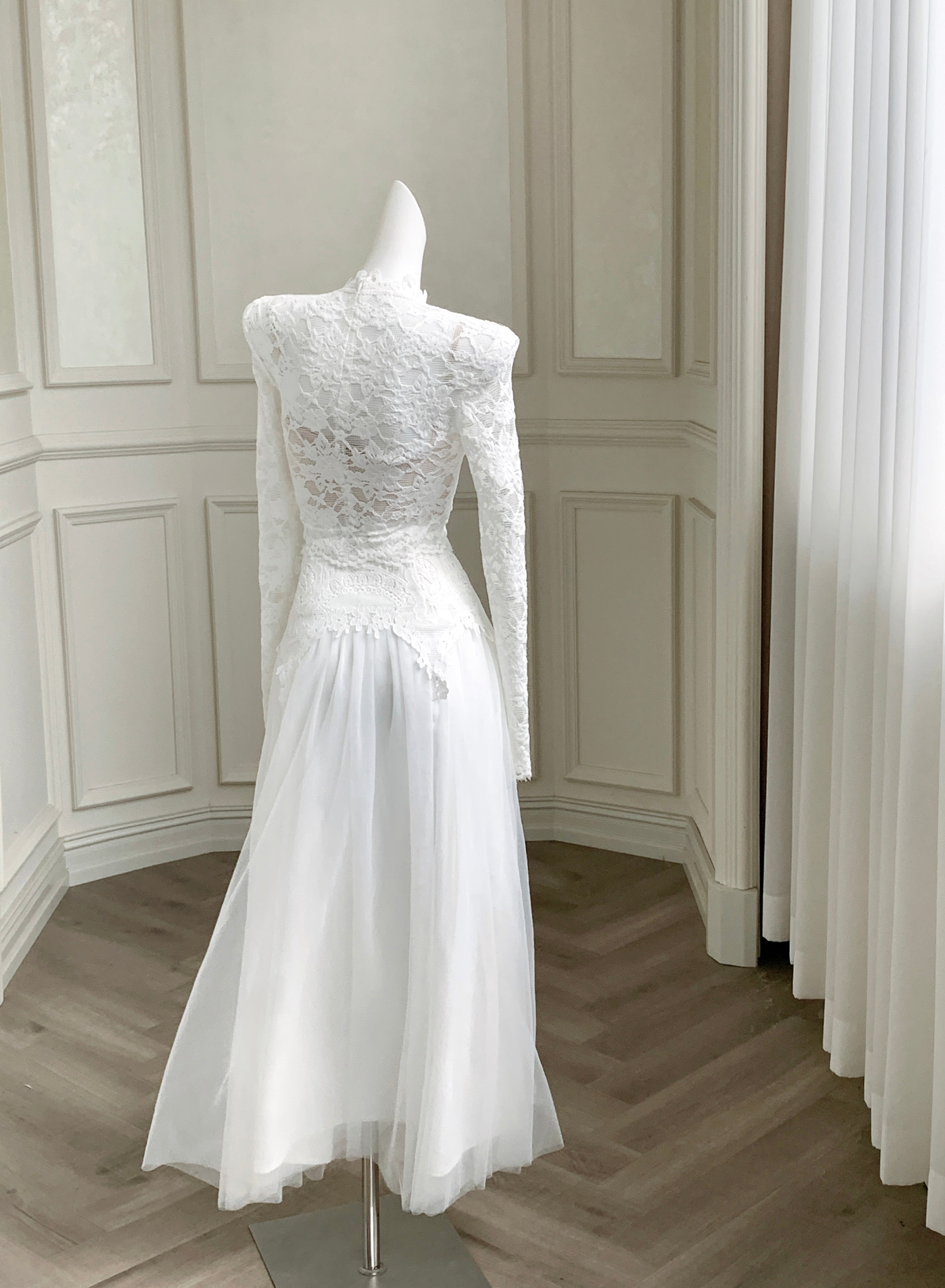 A vision of refined sensuality, ‘Floravelle’ pairs a delicate lace blouse with a voluminous tulle skirt to bring your inner muse to life. The top features a high collar trimmed with vintage-style lace, designed to frame the neckline with soft structure, a romantic alternative to ordinary V or round necklines. The tonal lace detailing continues down the center, drawing the eye in and adding gentle rhythm and movement to the silhouette.