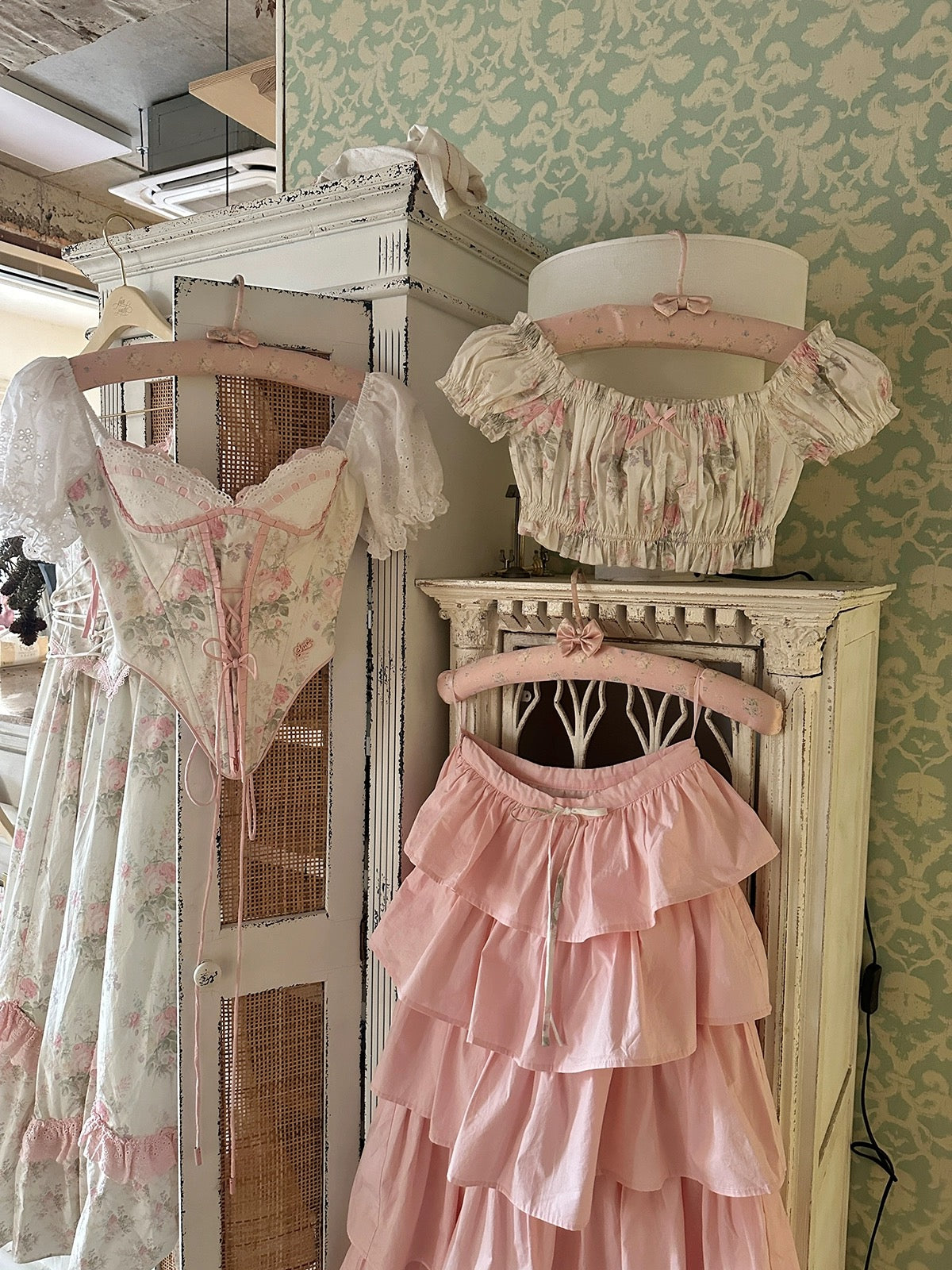 The design showcases elegant puff sleeves that can be styled in two ways, beautifully enhancing the arm line while adding a sweet, feminine charm. The classic Basque waistline highlights the silhouette, accentuating a slim waist with rich, layered pink contrasting stitching for added visual appeal.