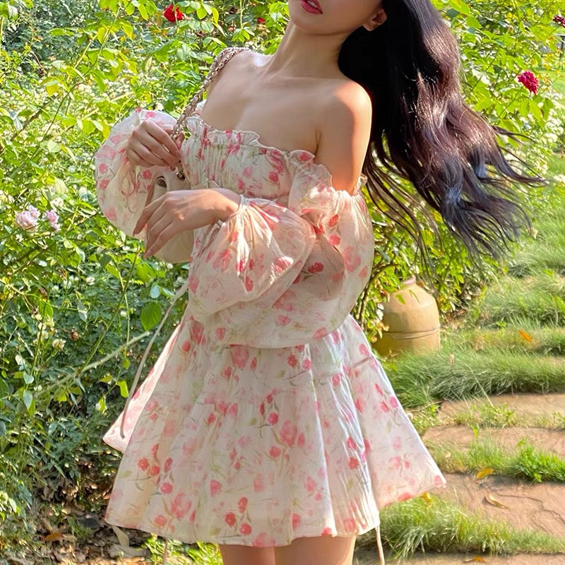 The off-shoulder neckline shows off your collarbones with subtle charm, trimmed with dainty ruffles for that extra softness. We added gentle ruching across the chest to flatter your shape, and continued the detail with delicate pleats at the waist—everything working together for a naturally contoured, cinched-in look.