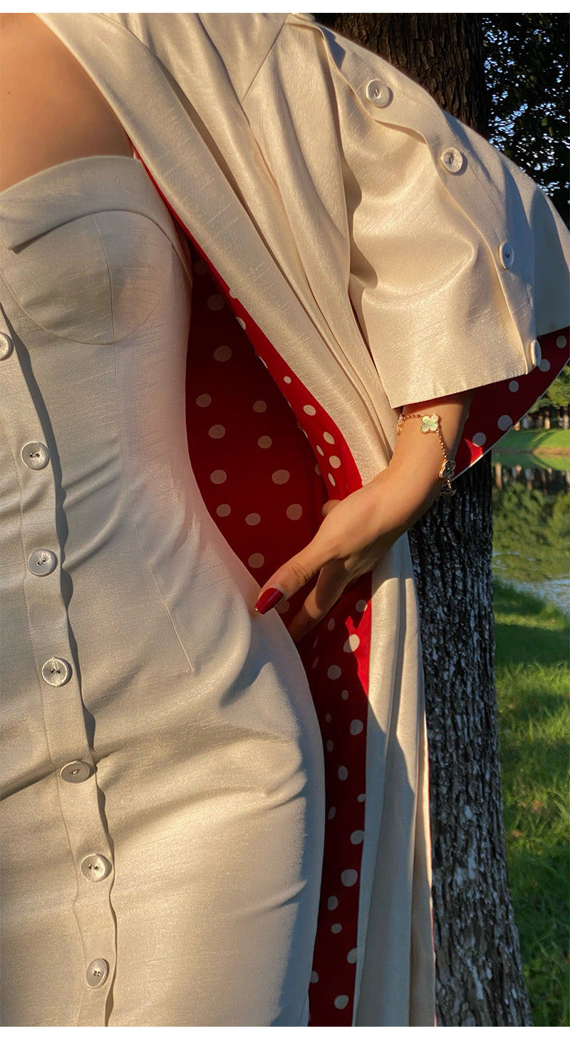 We played with the ordinary to make it unforgettable. The swing of the hem hides a secret: a rich red lining dotted with playful white polka dots—this bold contrast breaks the neutral palette in the most unexpected way, adding depth, colour, and a hint of playfulness. It’s the kind of twist that makes people look twice.