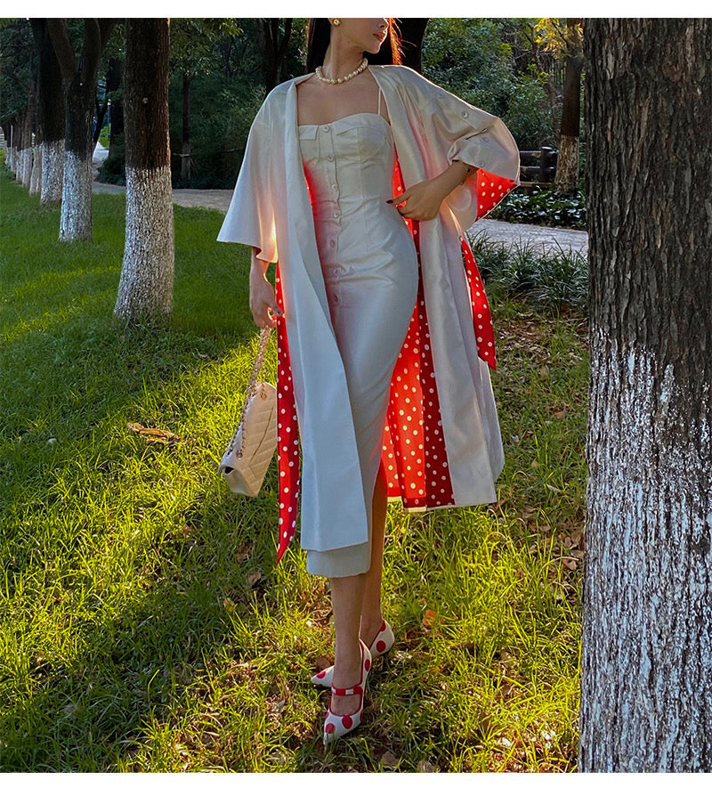 Our favorite part? That detachable belt, double-sided with a polka-dot backing that mirrors the lining—so you can wear it clean or show a flash of contrast, depending on your mood.