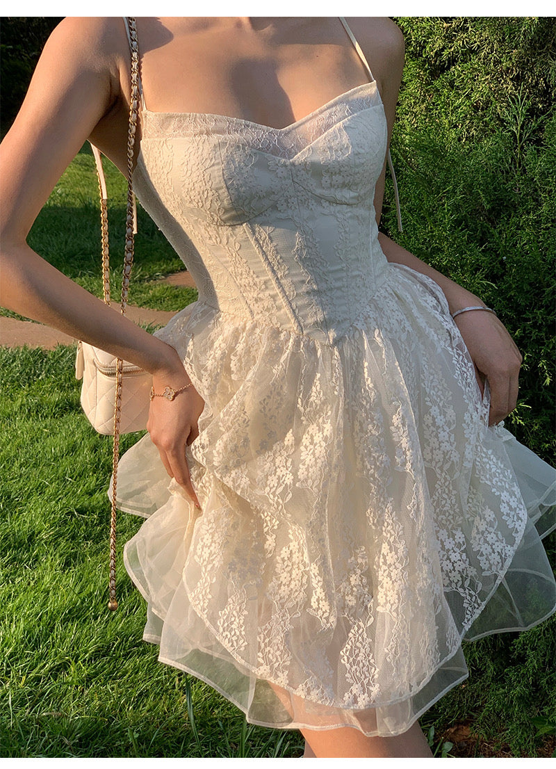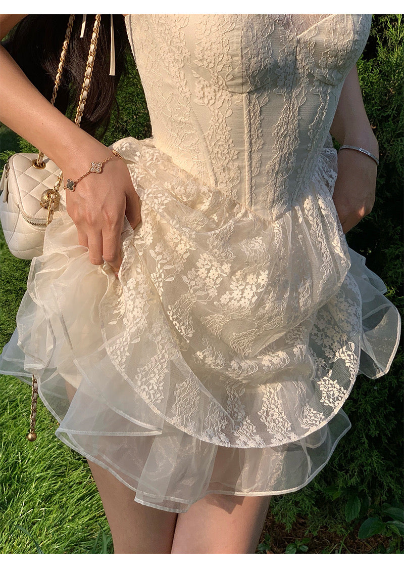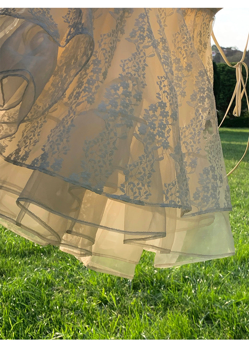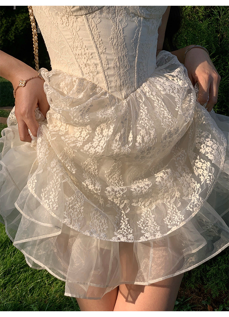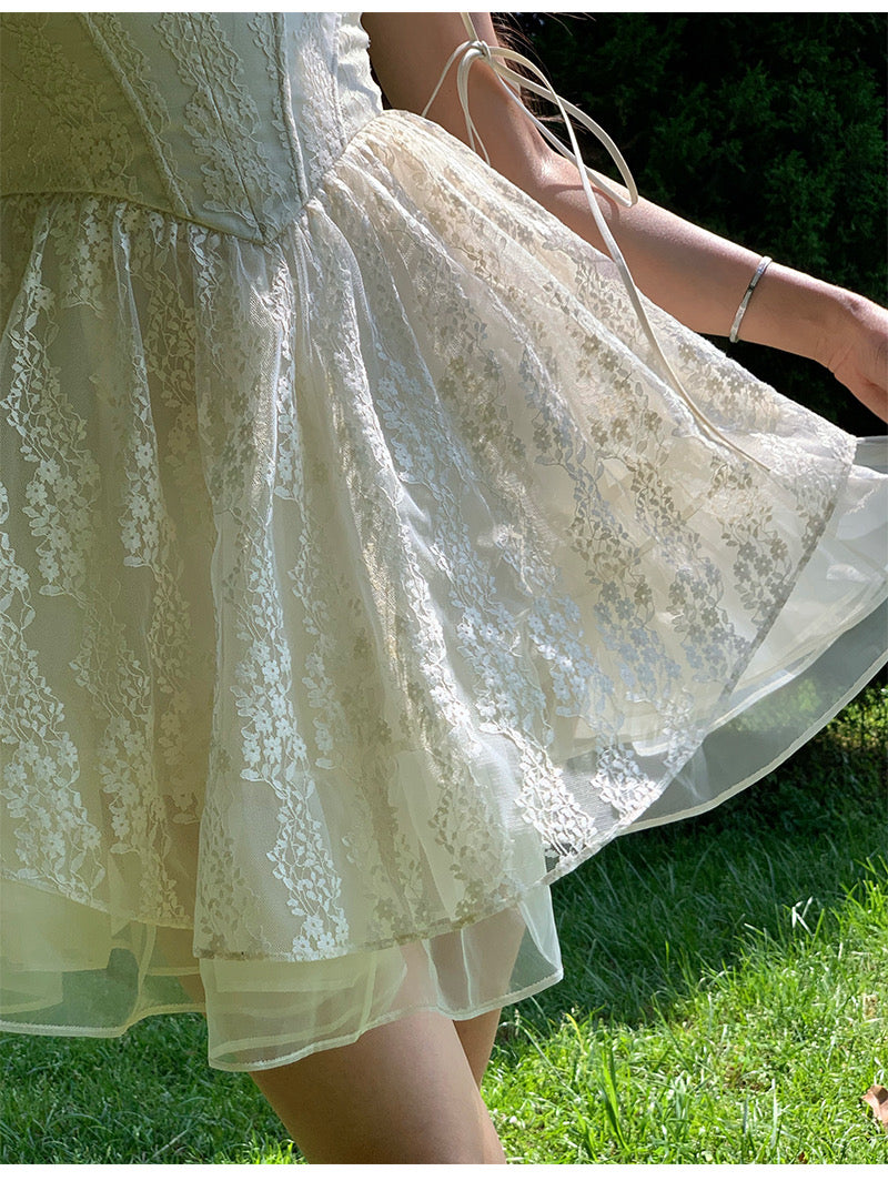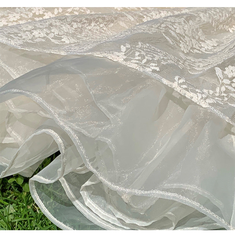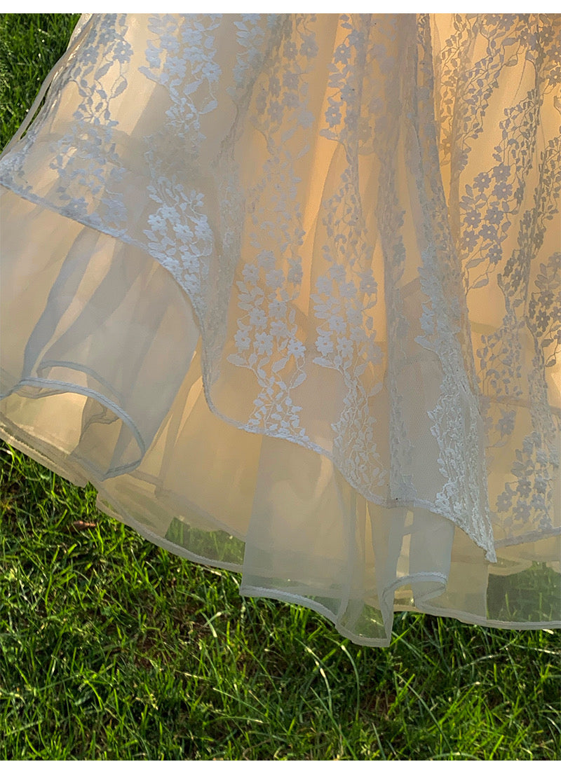 In a soft, warm ivory shade, the dress exudes both charm and elegance. The lace patterns, combined with the flowing layers of gauze, evoke a sense of timeless romance, reminiscent of a dream bridal gown, full of grace and delicate beauty.