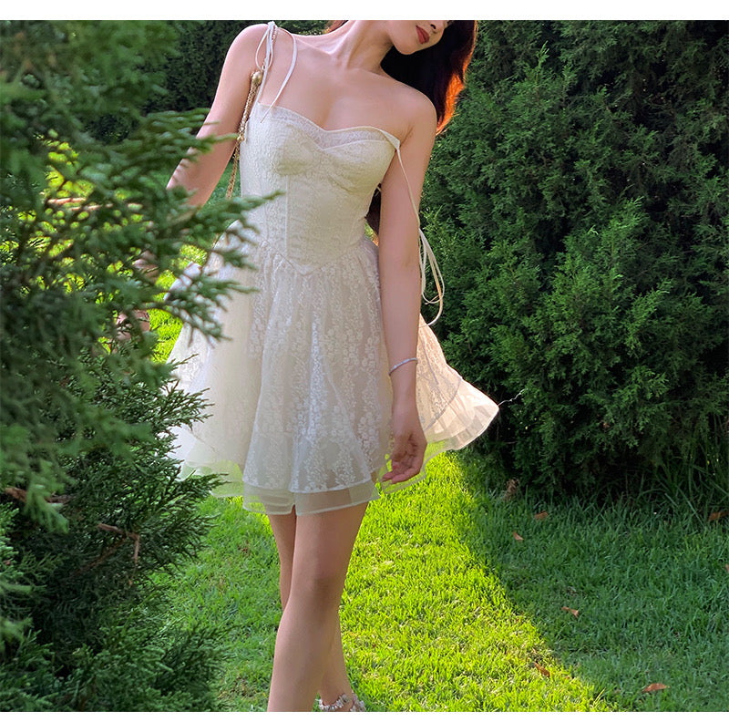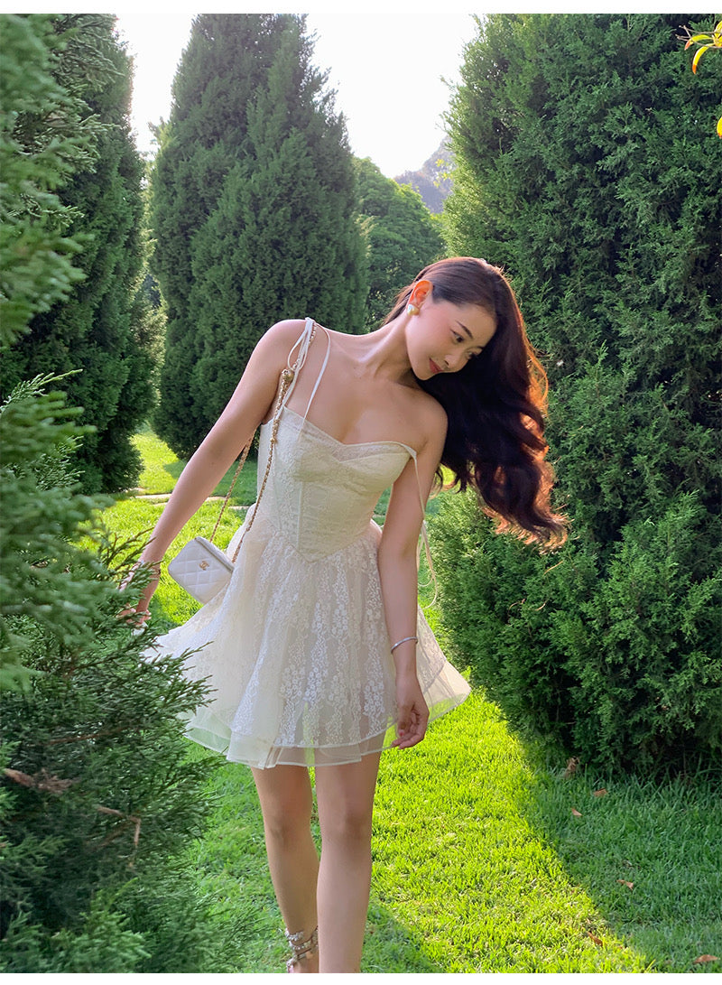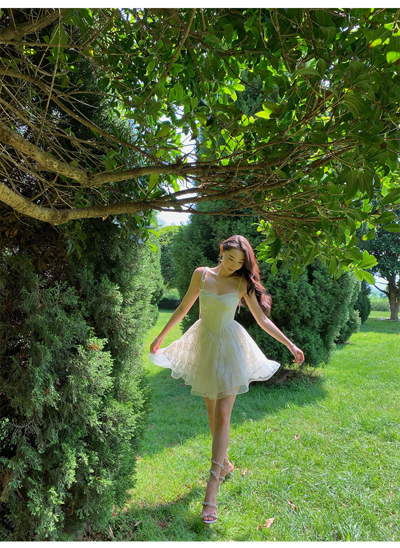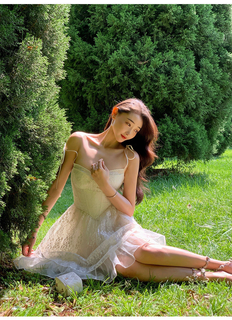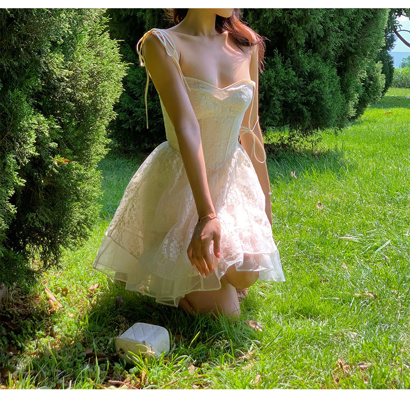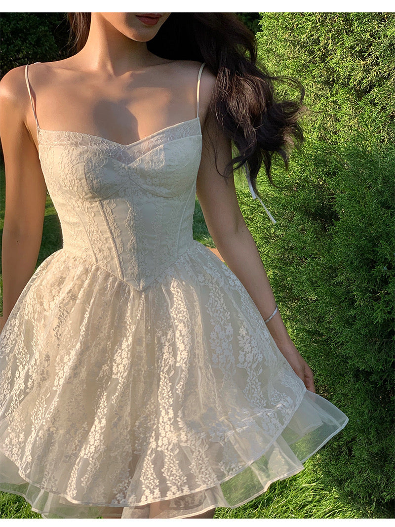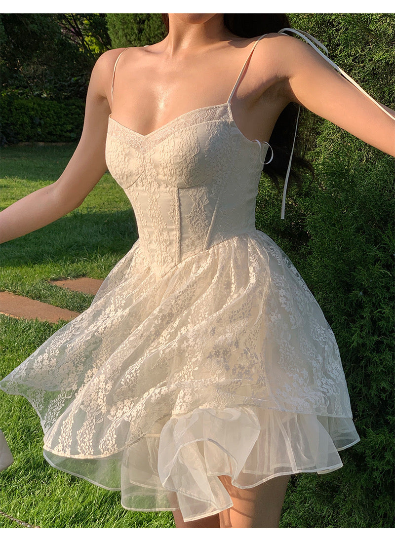 In a soft, warm ivory shade, the dress exudes both charm and elegance. The lace patterns, combined with the flowing layers of gauze, evoke a sense of timeless romance, reminiscent of a dream bridal gown, full of grace and delicate beauty.