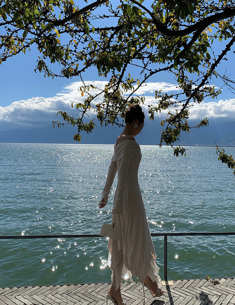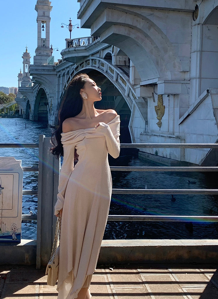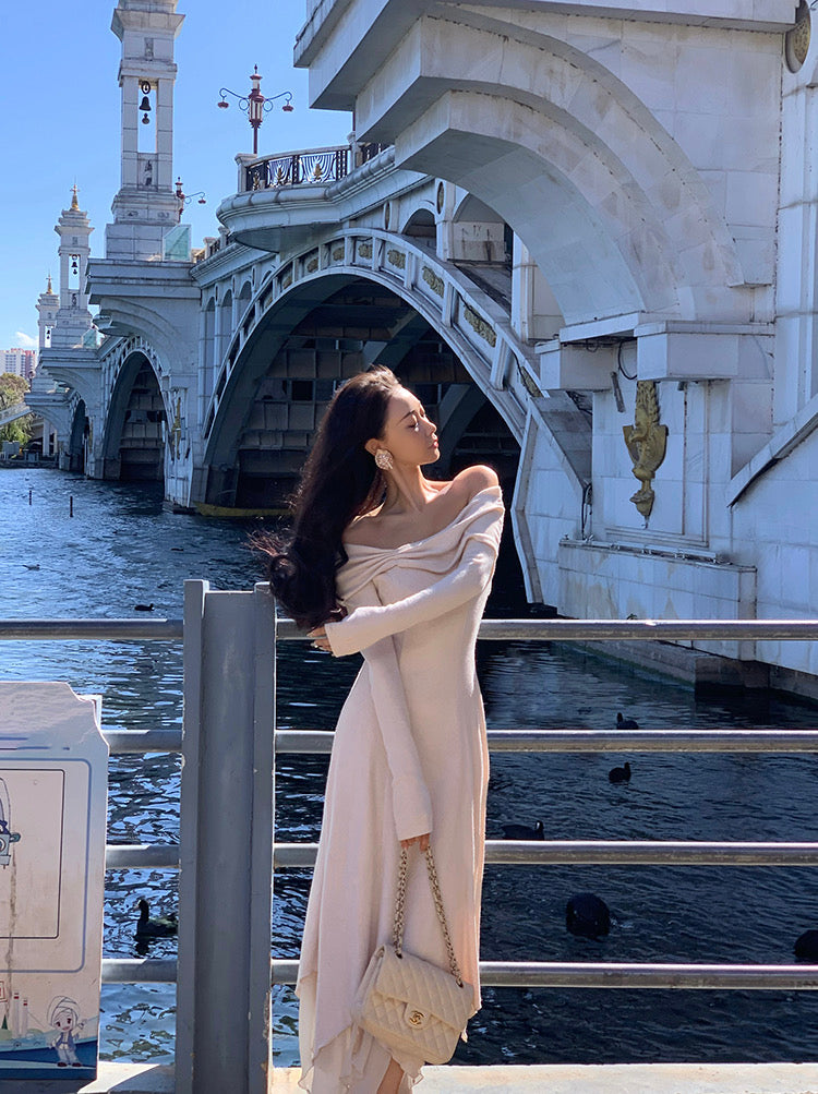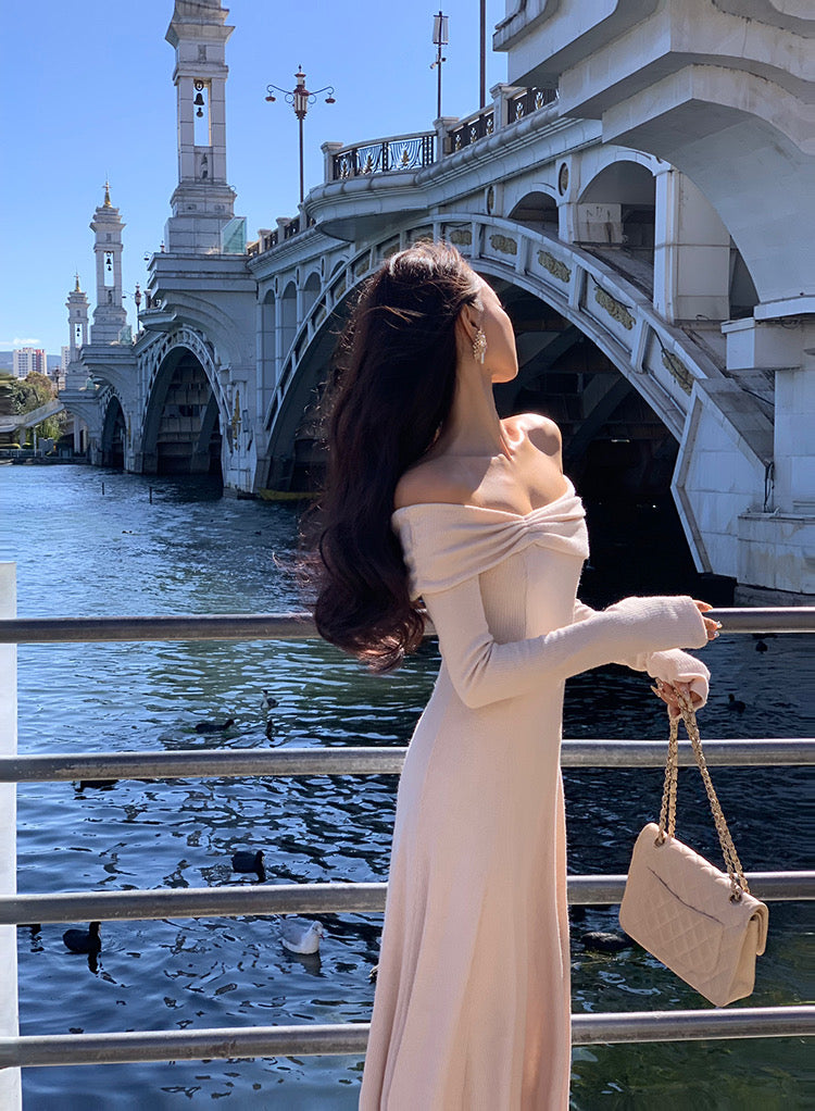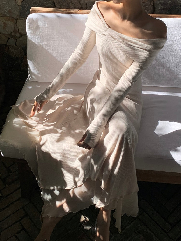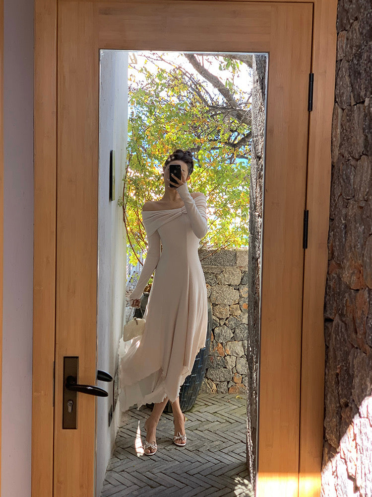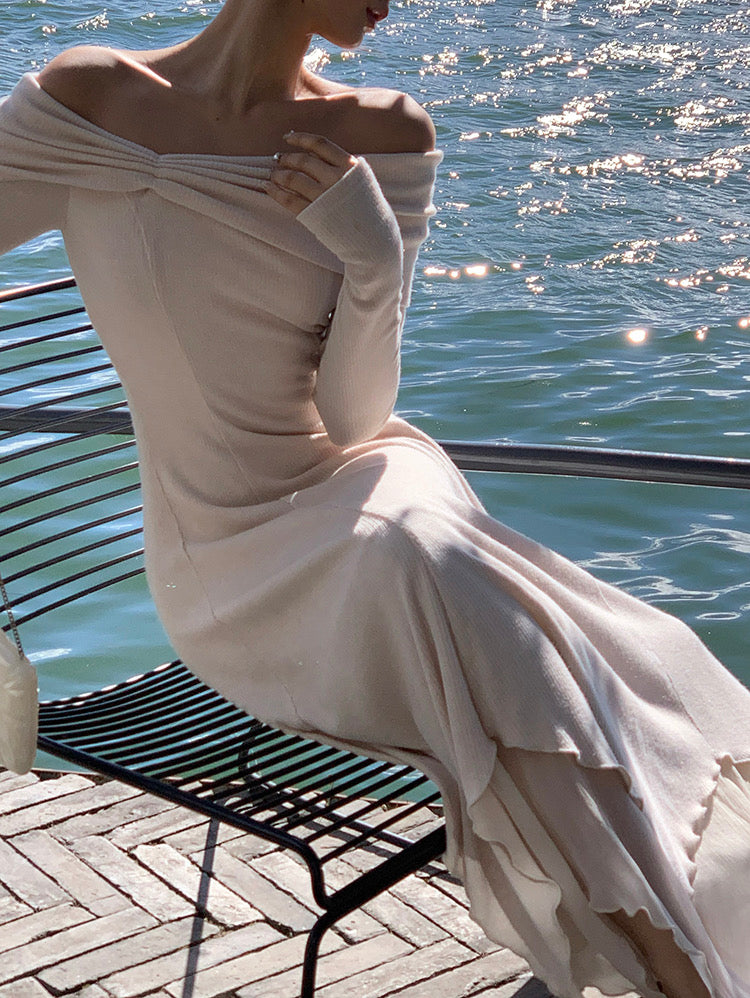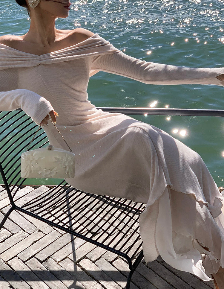 Designed in a stretch knit fabric with a naturally flattering drape, it hugs gently while feeling easy and breathable on the skin. The neckline gives you options: wear it as a sweet U-shape on the shoulders, or let it fall softly into an off-shoulder shape to show off your collarbones.