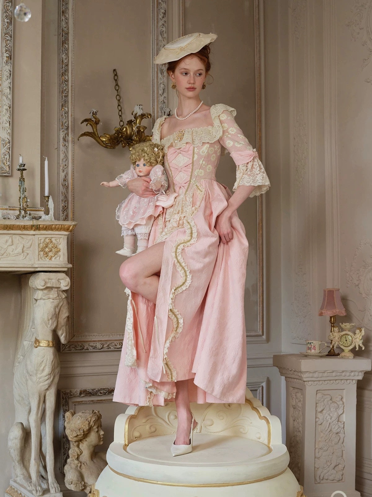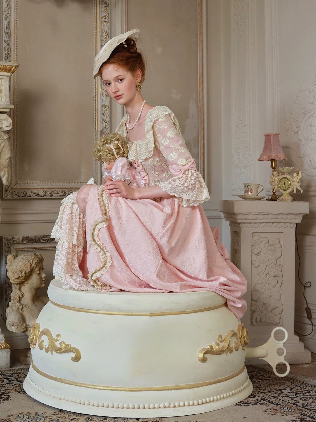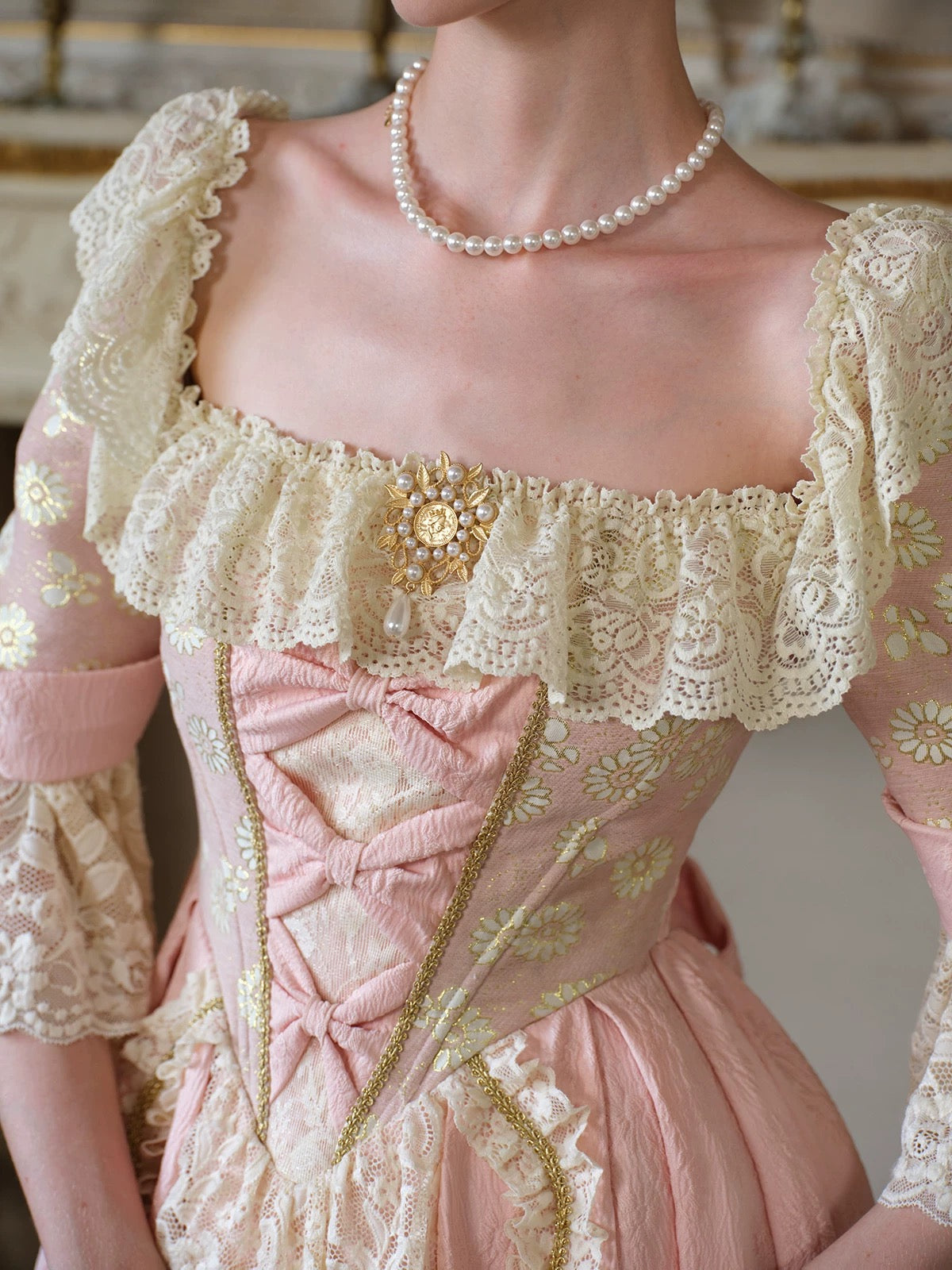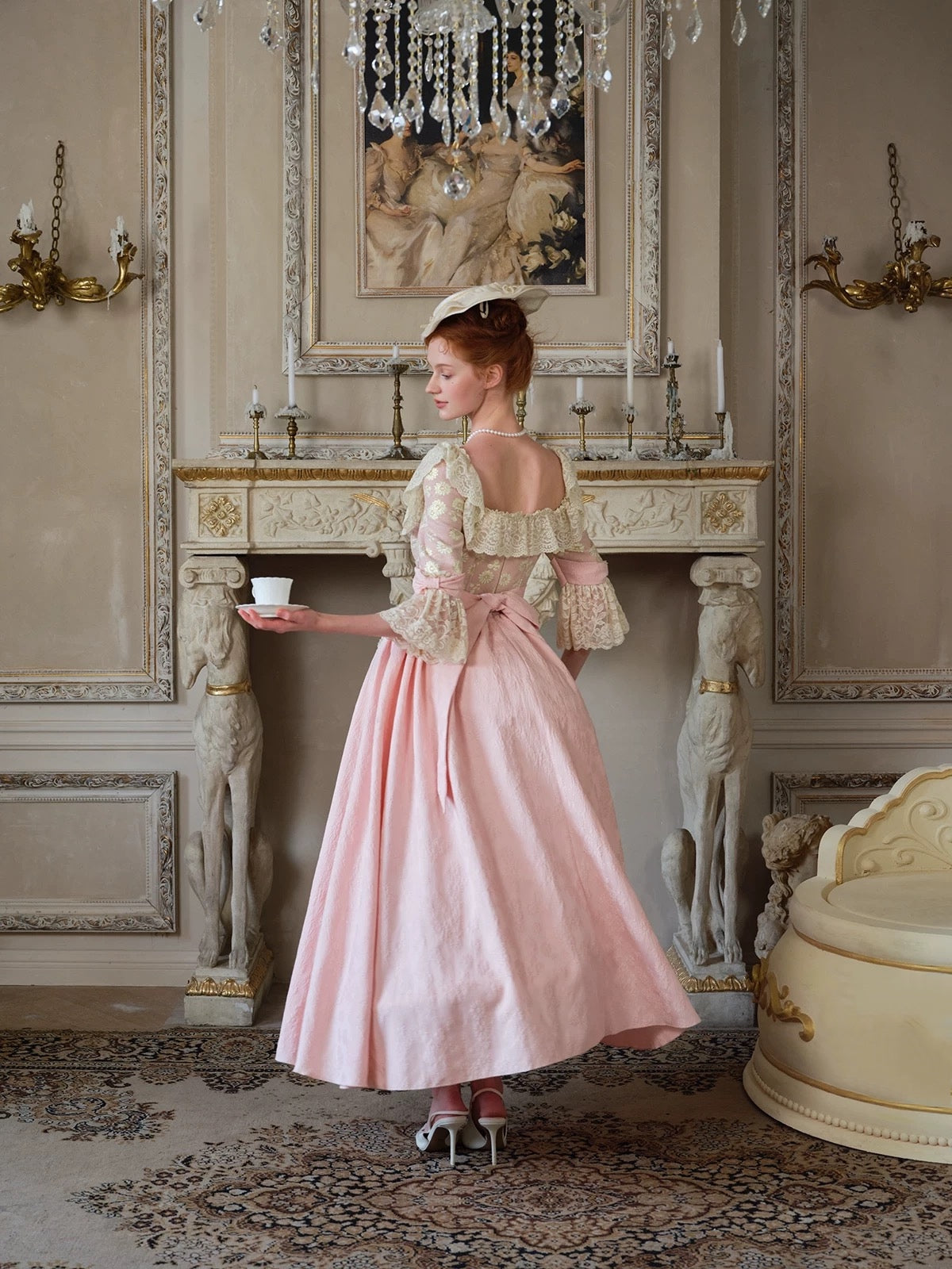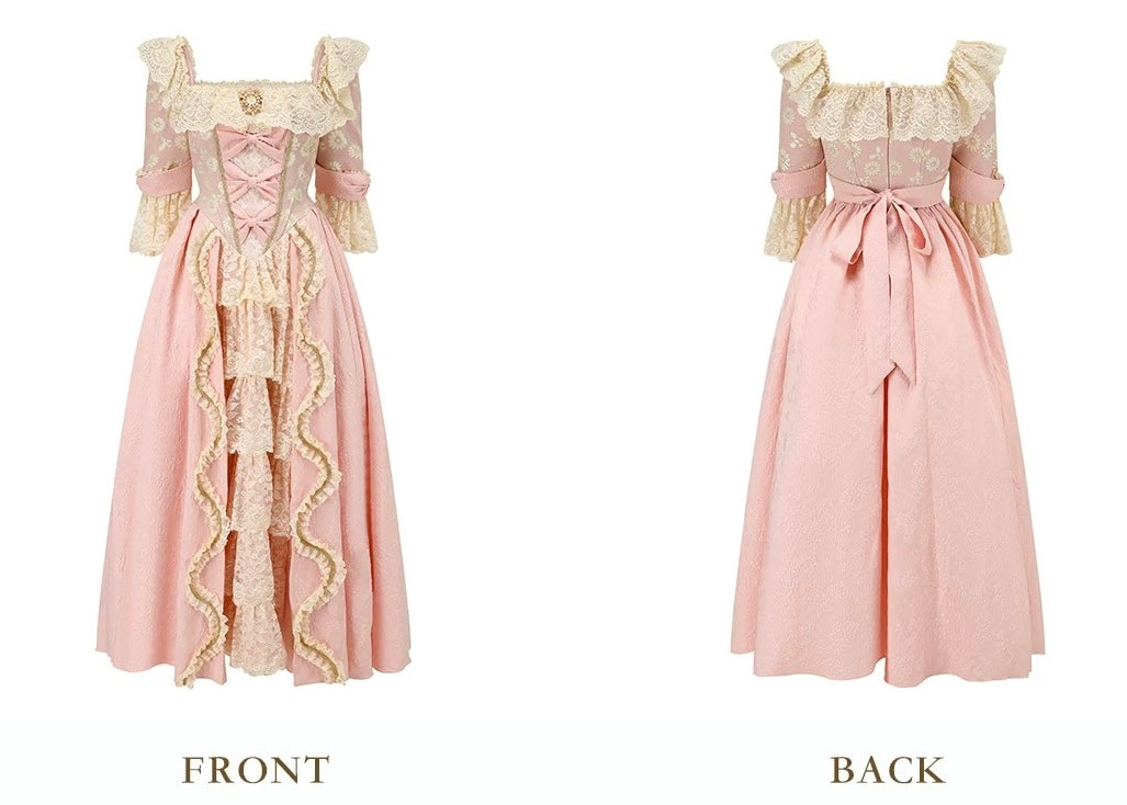 The neckline is finished with a regal lace trim and topped off with a vintage golden brooch for a touch of baroque elegance. At the waist, a tie ribbon lets you cinch it just right, while the hidden zip at the back makes it easy to slip on. And the best part? Discreet loops sewn inside the hem allow you to transform the skirt into different shapes – from grand ballgown swish to soft folded layers.