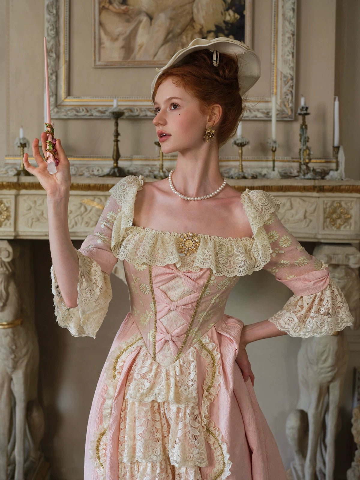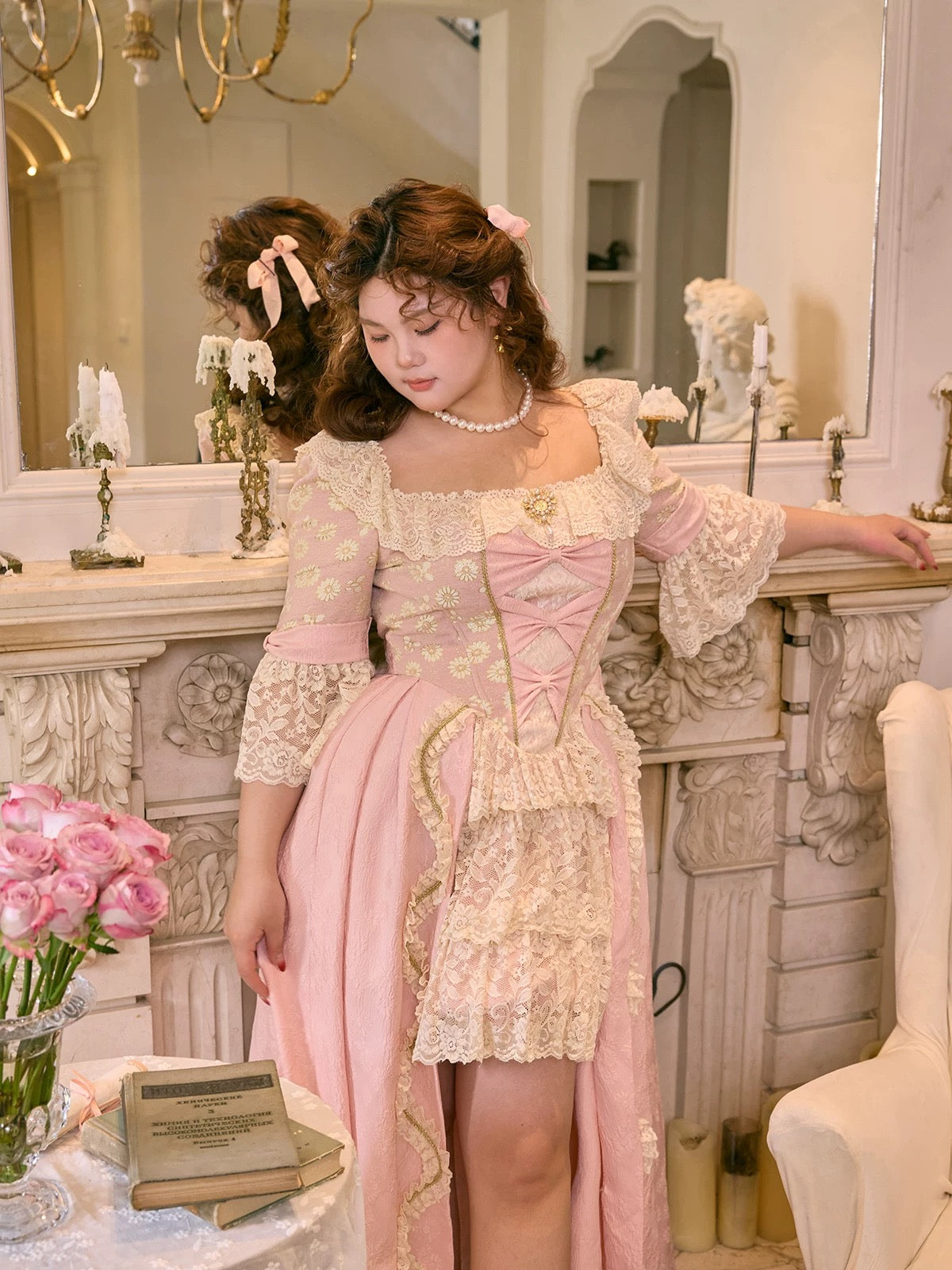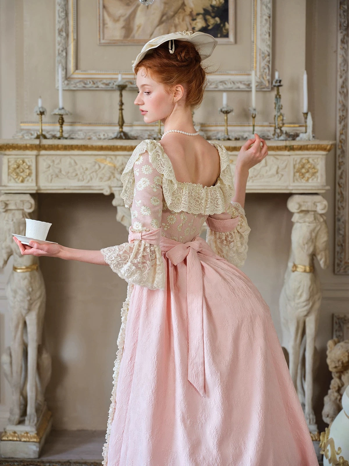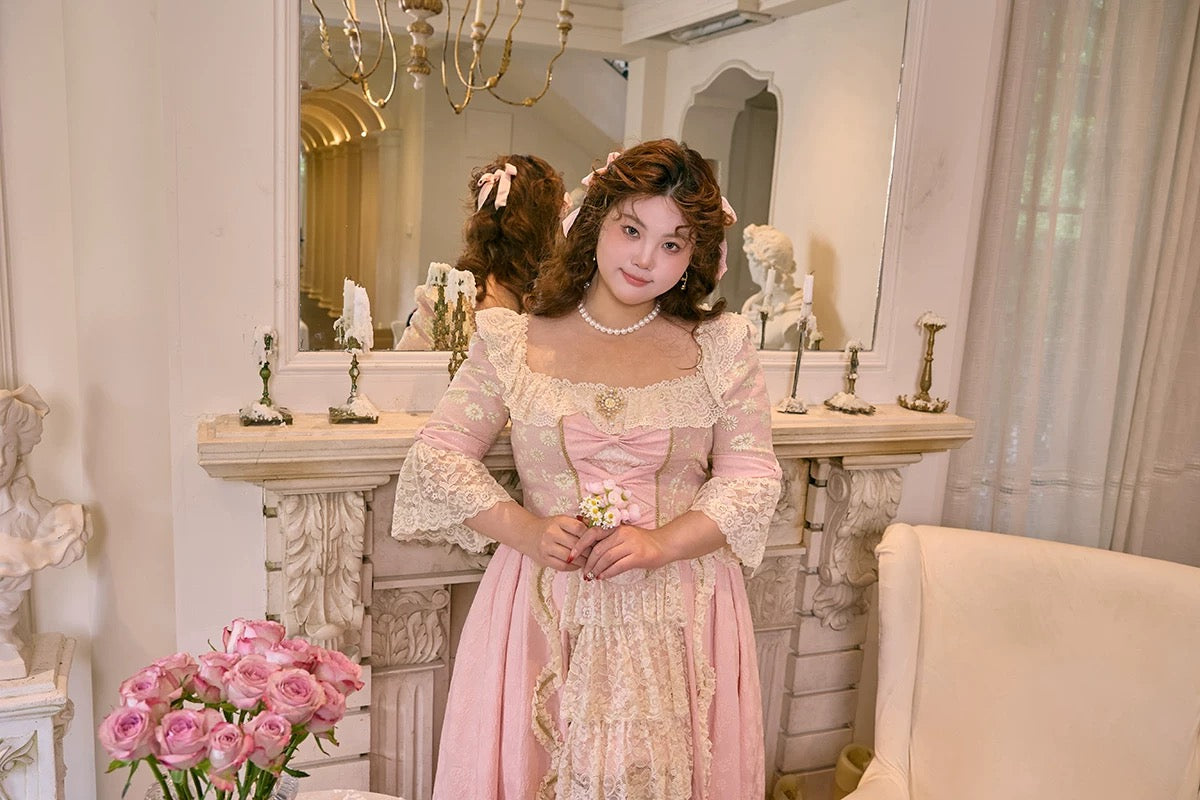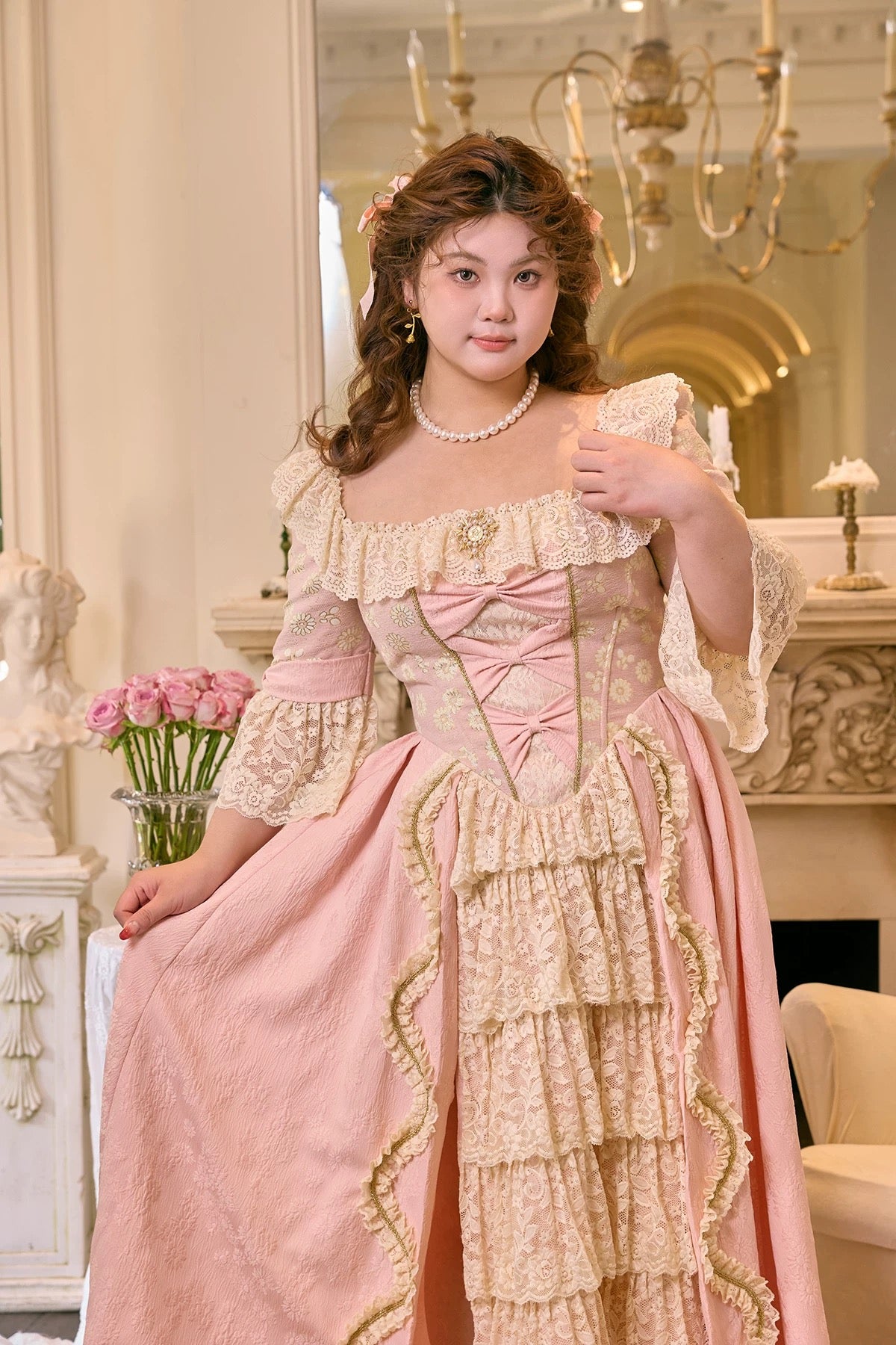 The neckline is finished with a regal lace trim and topped off with a vintage golden brooch for a touch of baroque elegance. At the waist, a tie ribbon lets you cinch it just right, while the hidden zip at the back makes it easy to slip on. And the best part? Discreet loops sewn inside the hem allow you to transform the skirt into different shapes – from grand ballgown swish to soft folded layers.