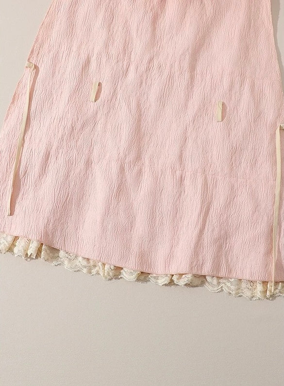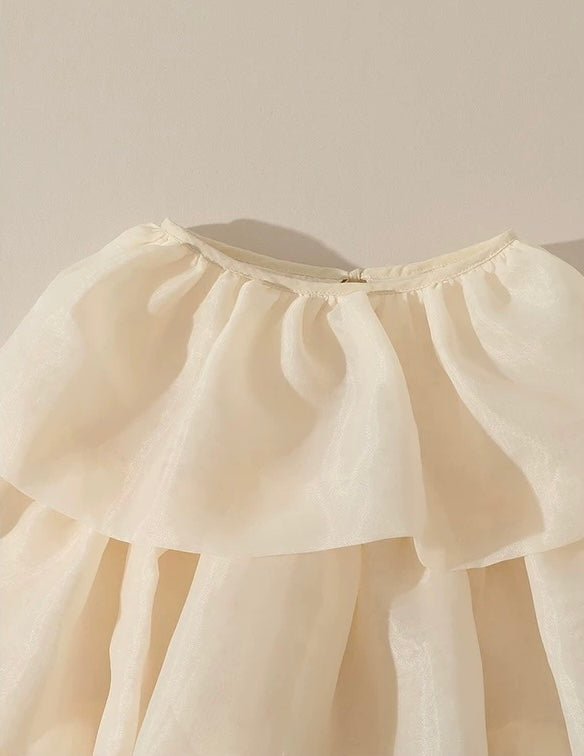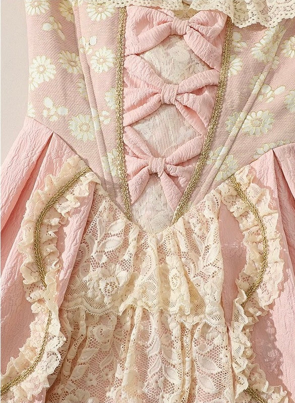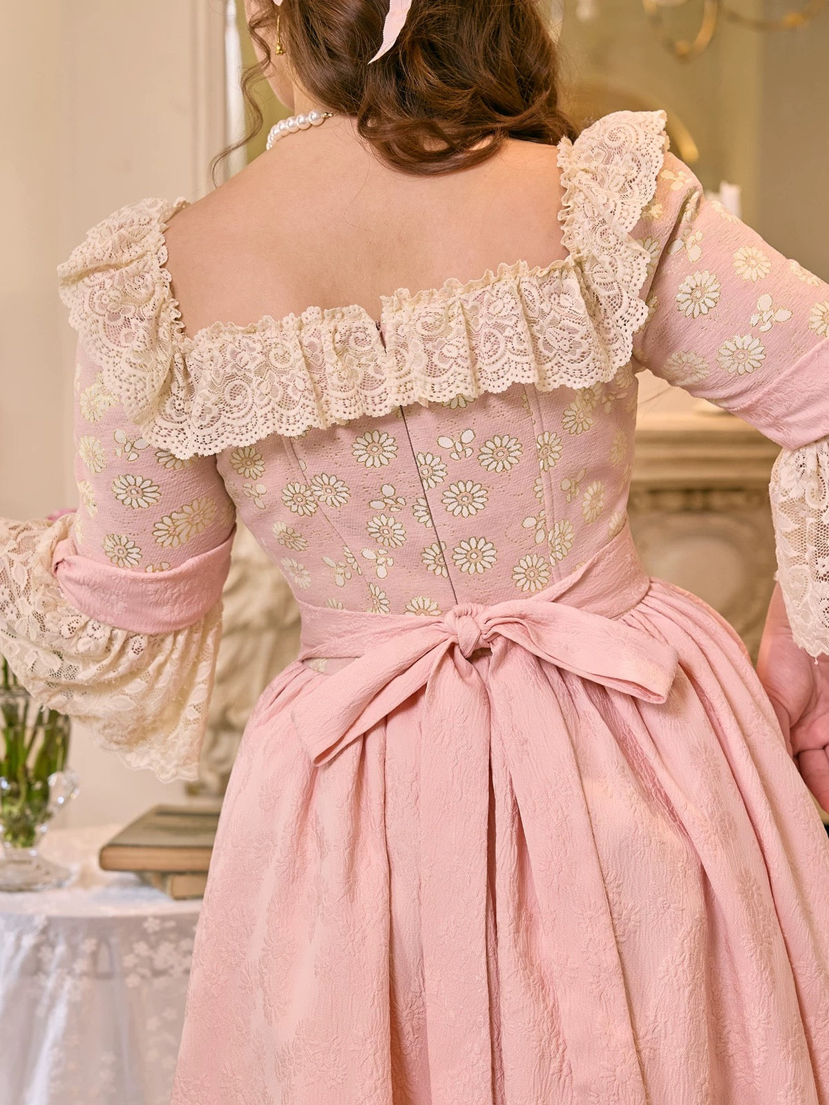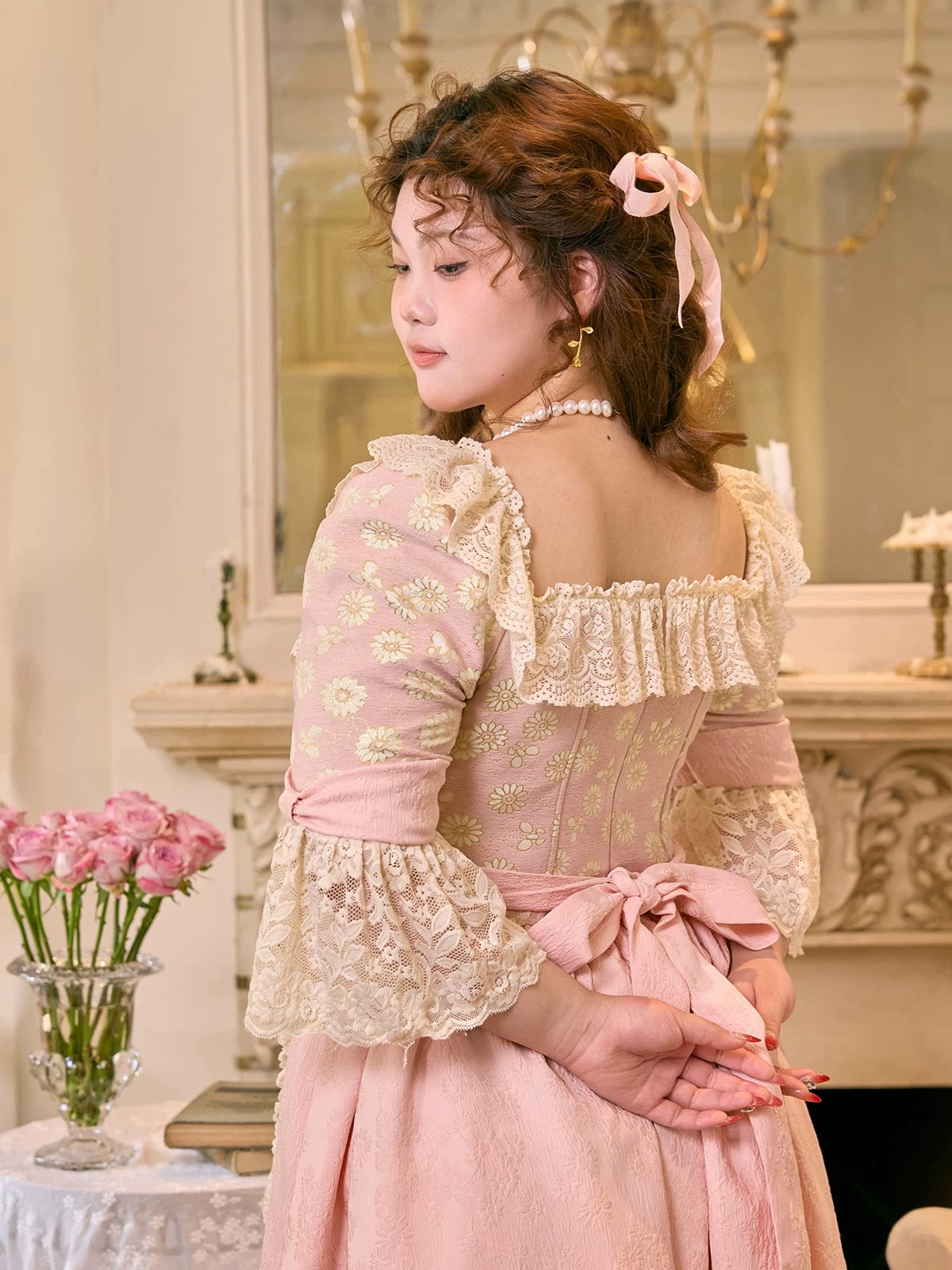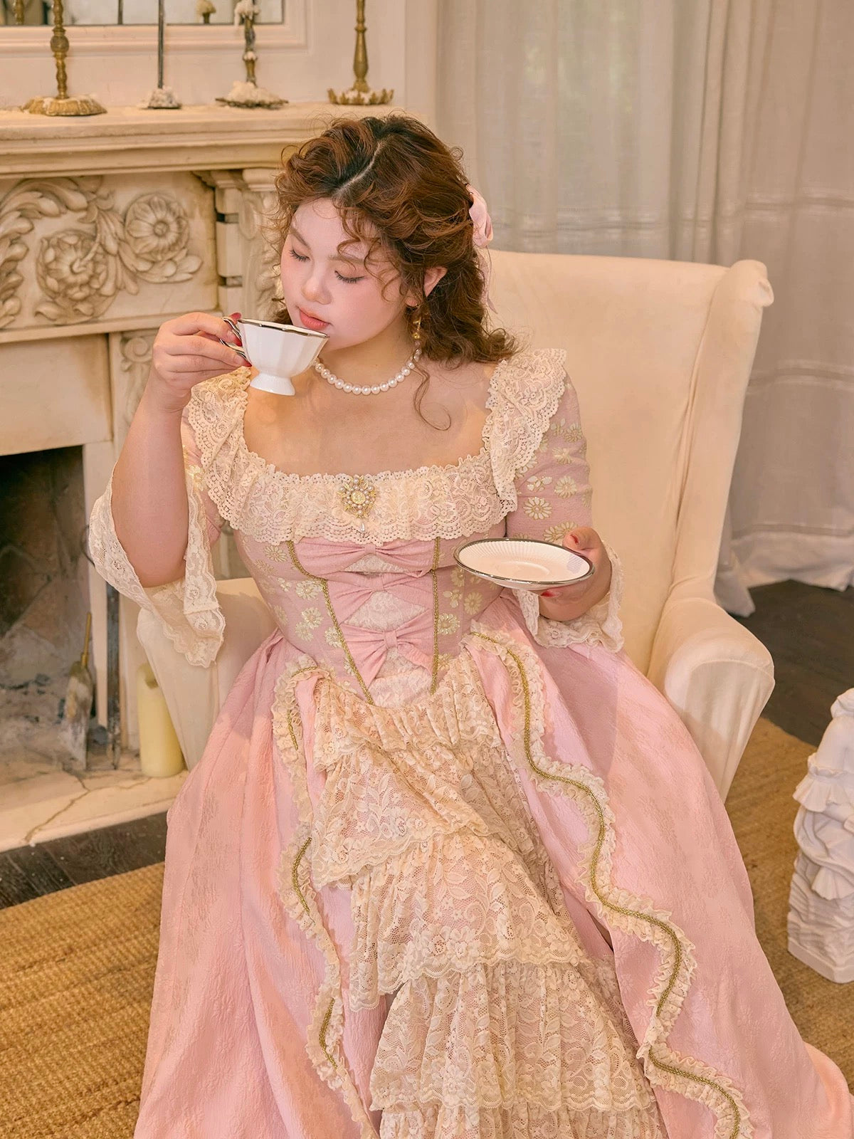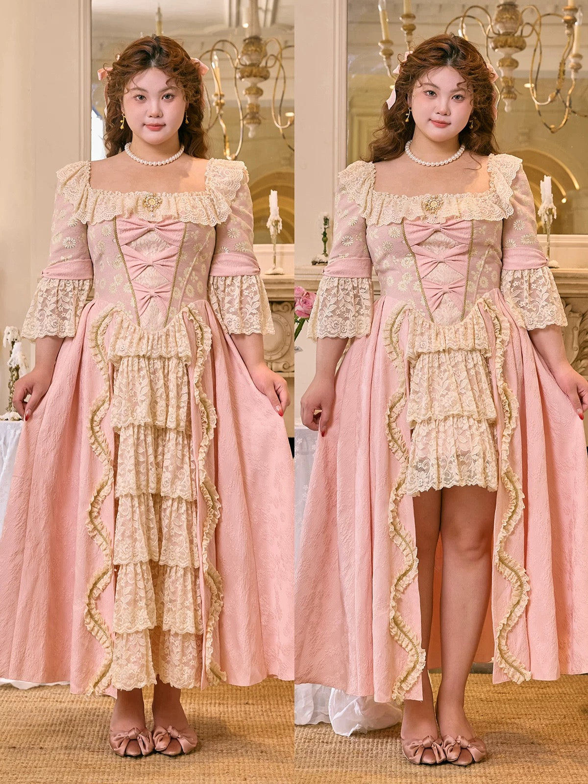 The neckline is finished with a regal lace trim and topped off with a vintage golden brooch for a touch of baroque elegance. At the waist, a tie ribbon lets you cinch it just right, while the hidden zip at the back makes it easy to slip on. And the best part? Discreet loops sewn inside the hem allow you to transform the skirt into different shapes – from grand ballgown swish to soft folded layers.