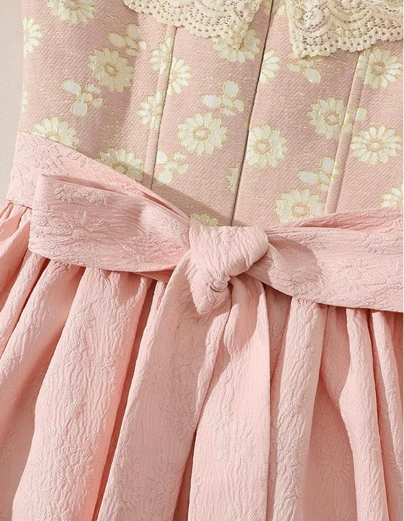 The bodice shimmers with gold-threaded jacquard, rich in texture and full of drama, while the skirt flows in a beautifully sculpted jacquard that mimics the feel of carved relief, thick enough to hold its shape, but still soft to wear. We’ve lined the interior with a smooth cotton-blend for all-day comfort, and yes, a petticoat will take the volume up a notch.