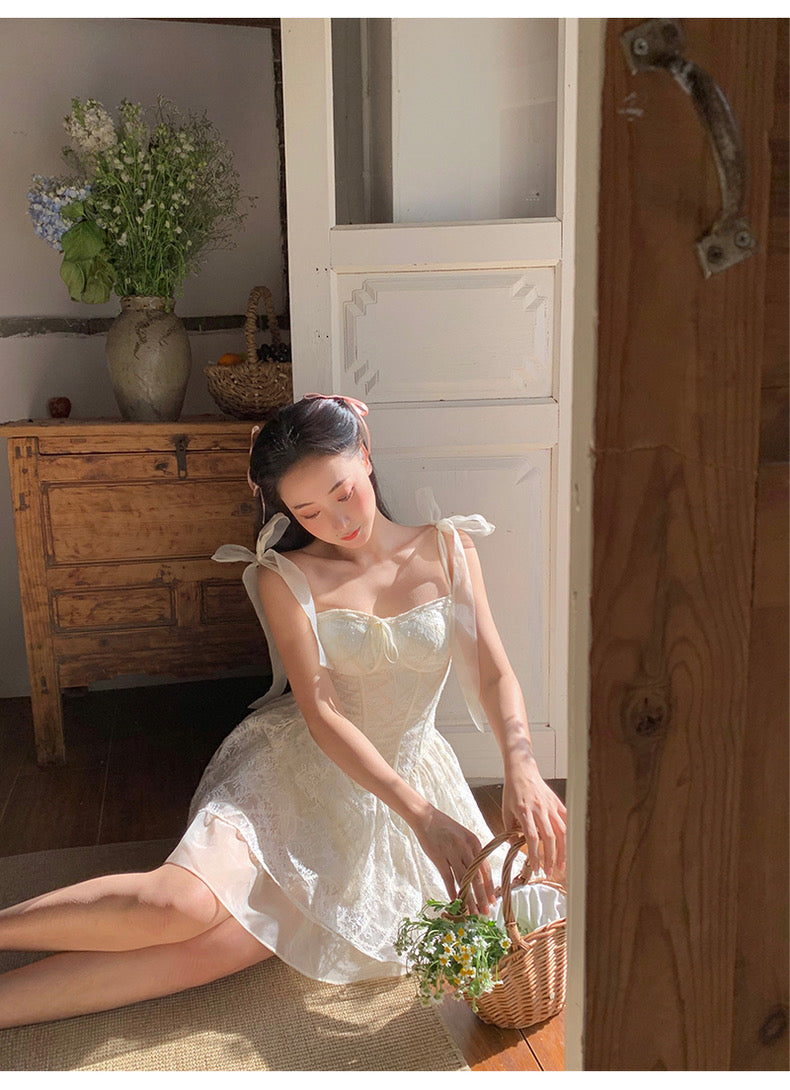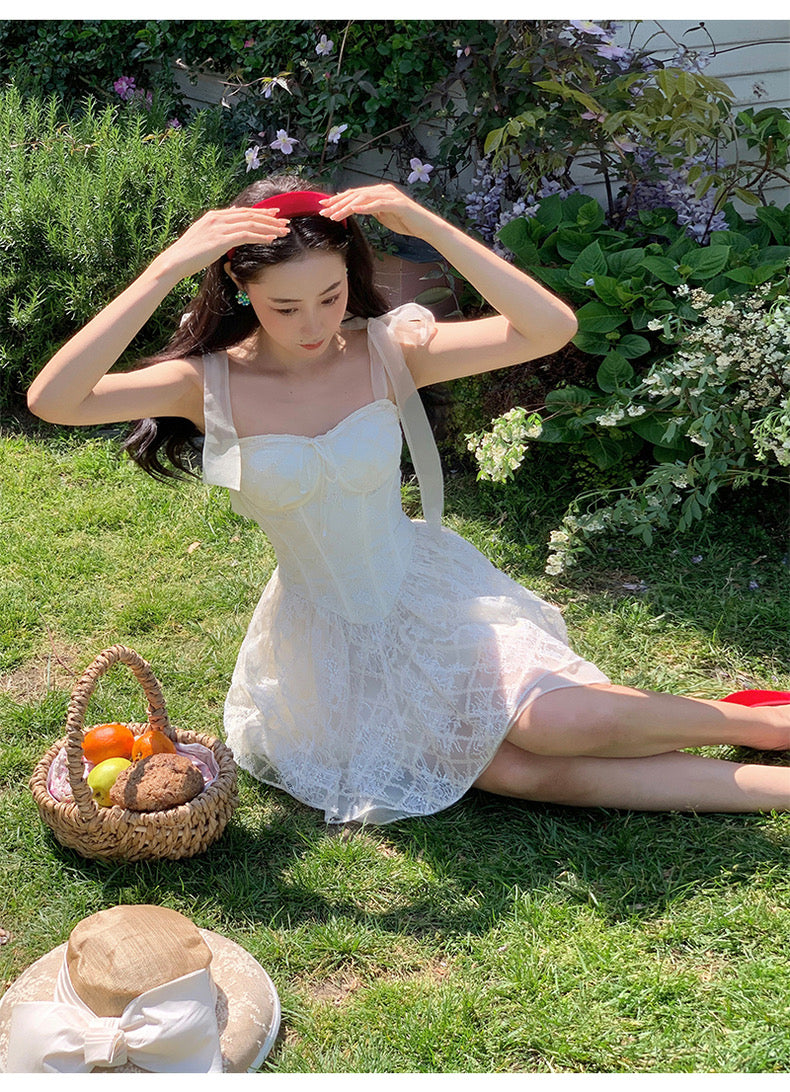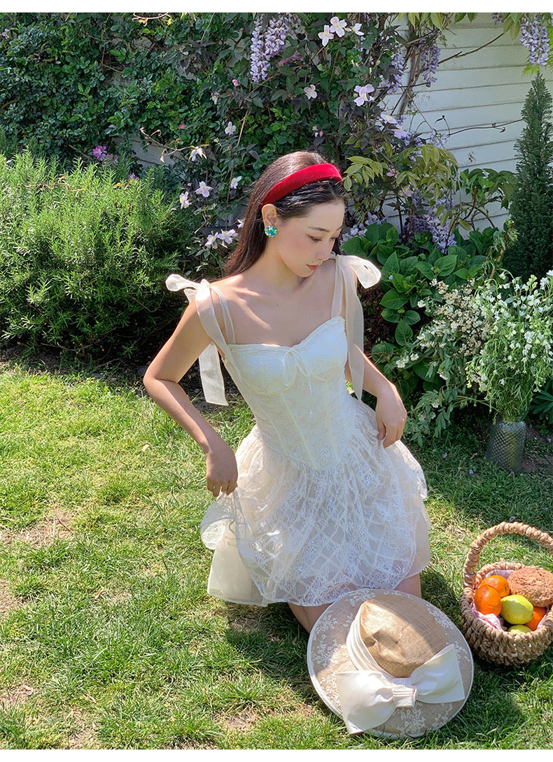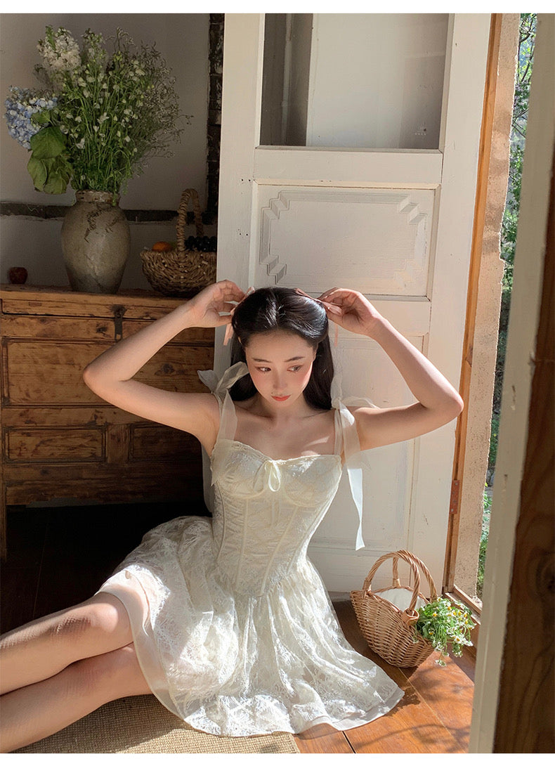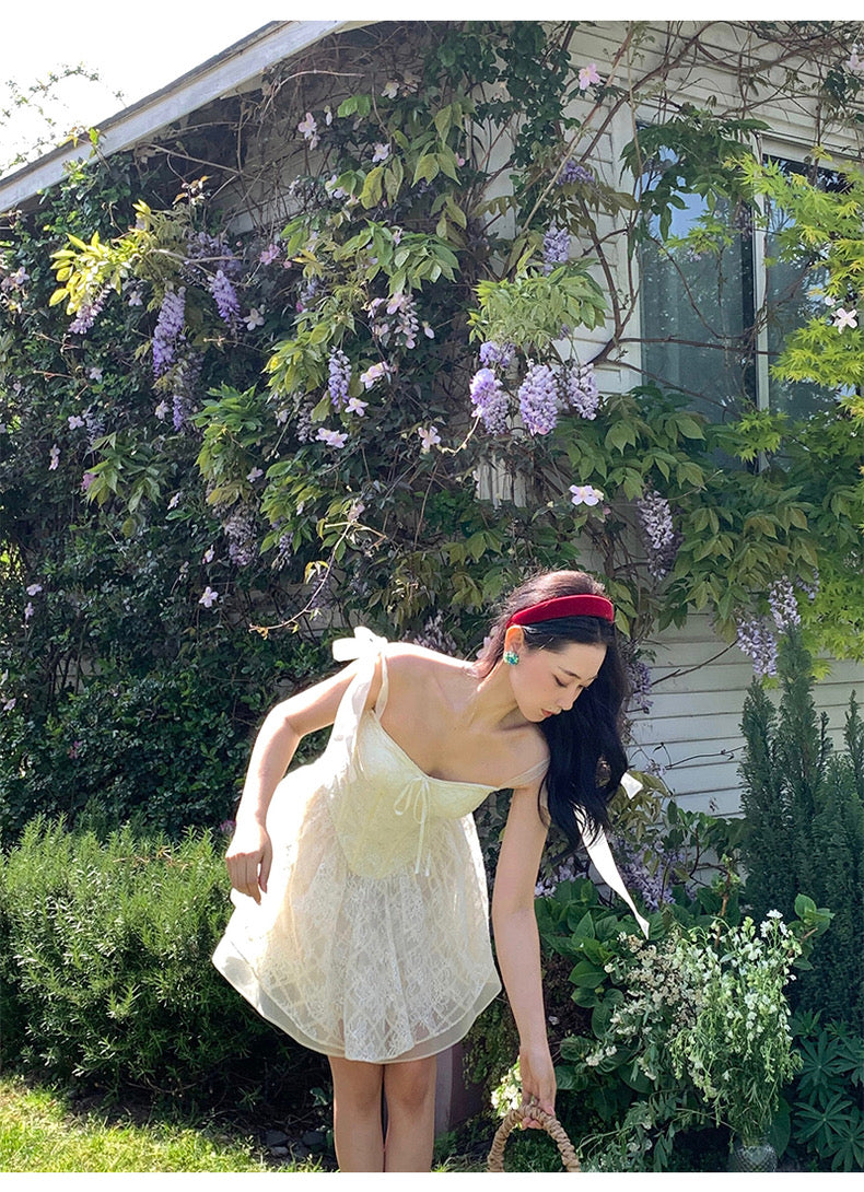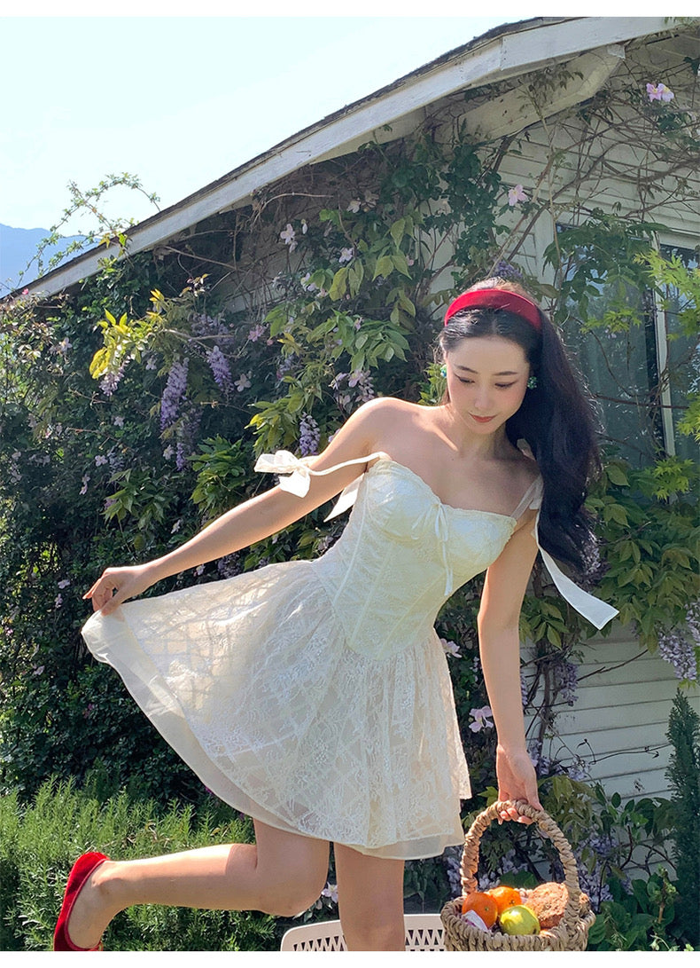 Lace intertwines with matching satin ribbons, forming sweet little bows that dance across the chest and back. The bodice is lightly padded for shape and support, while our signature fishbone design—eight lines in total—sculpts the waist and enhances that coveted hourglass silhouette.