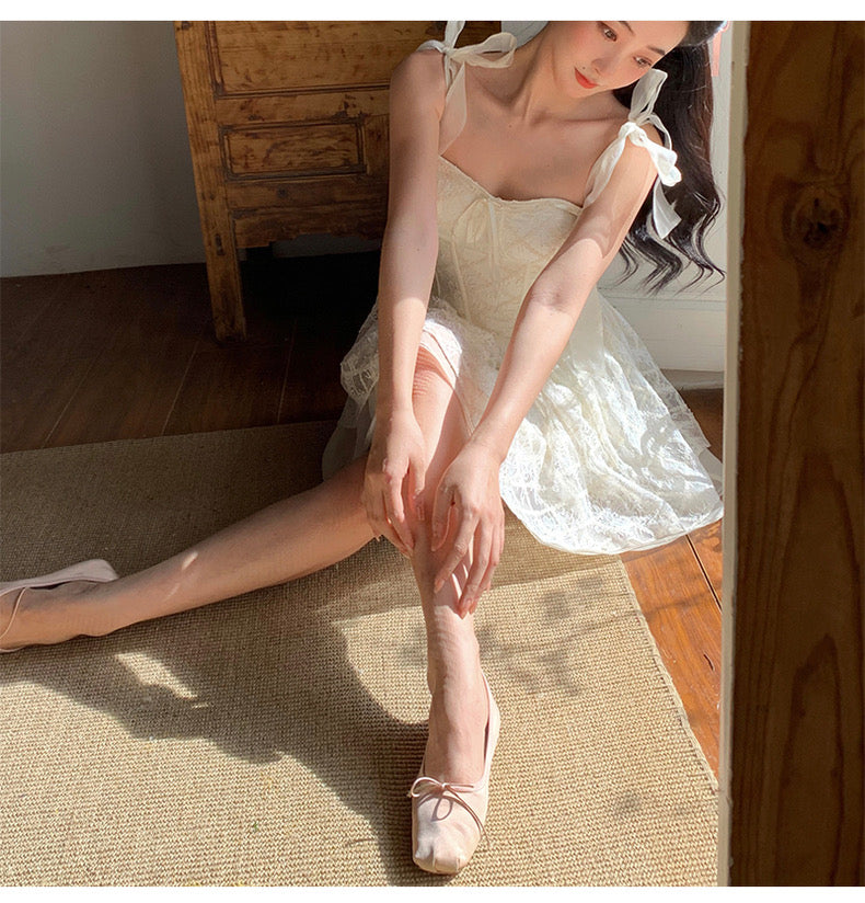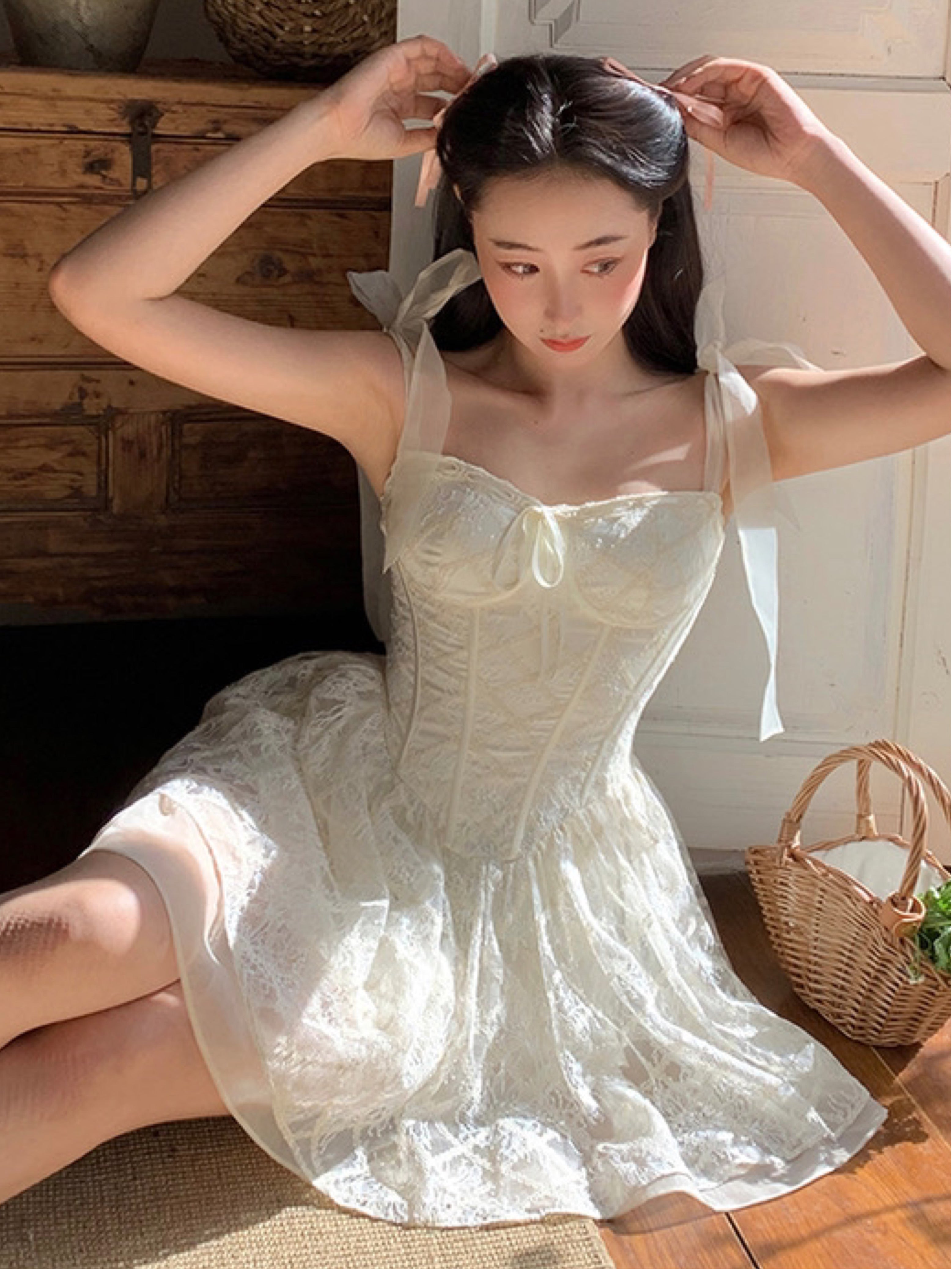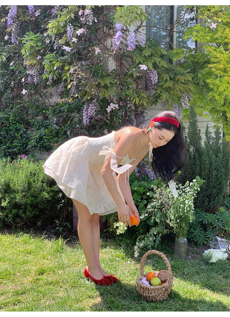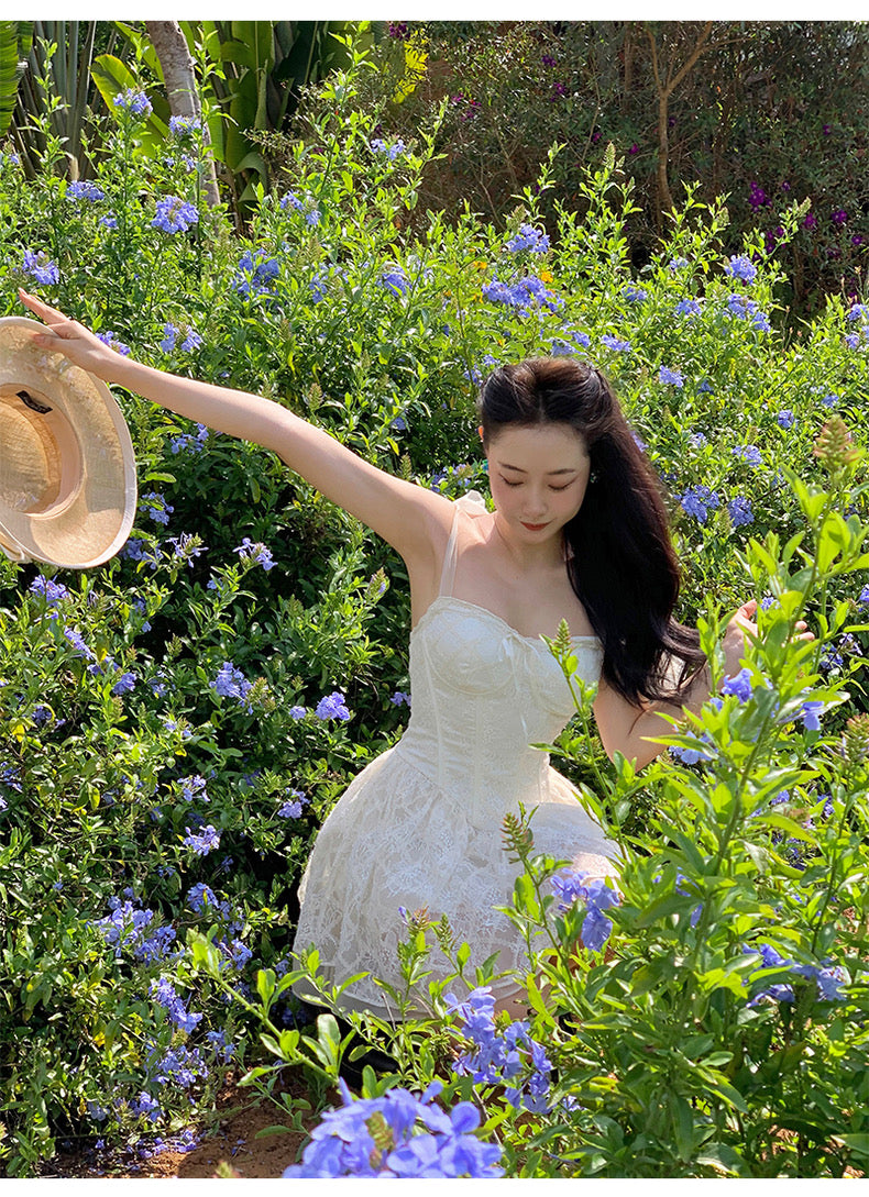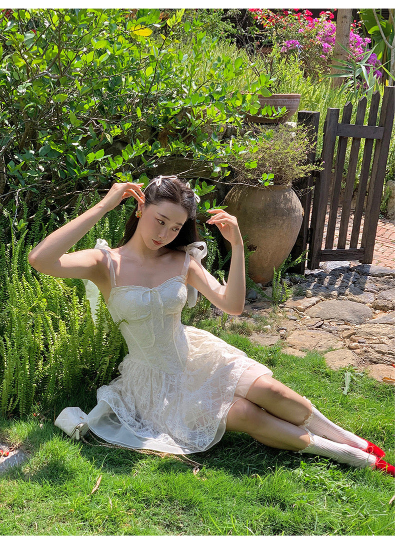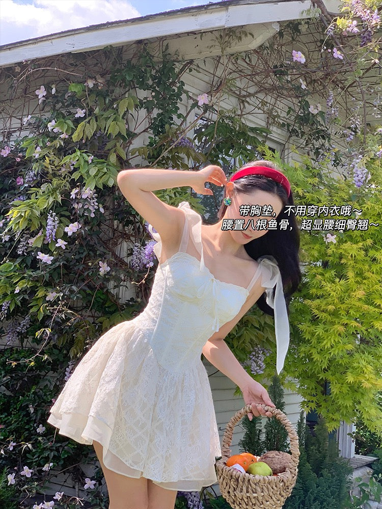 Lace intertwines with matching satin ribbons, forming sweet little bows that dance across the chest and back. The bodice is lightly padded for shape and support, while our signature fishbone design—eight lines in total—sculpts the waist and enhances that coveted hourglass silhouette.