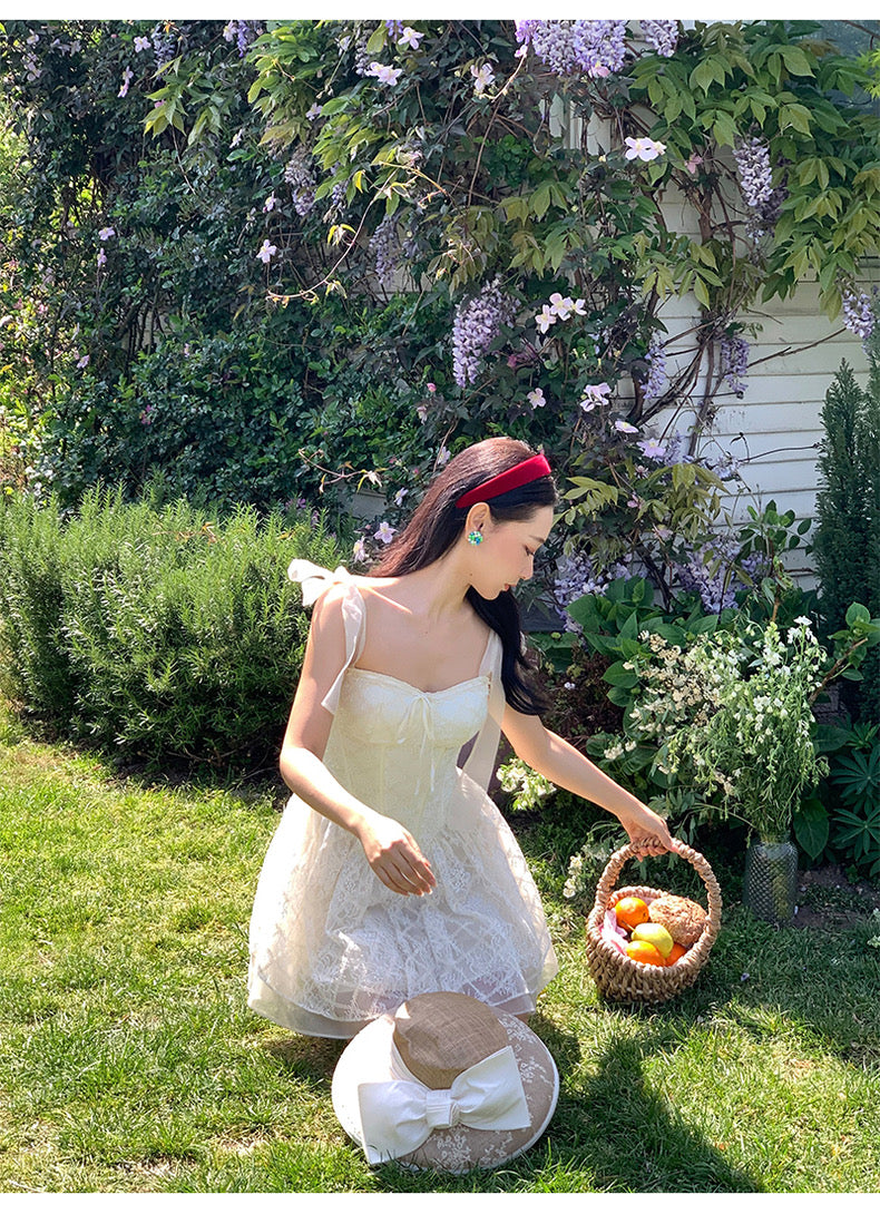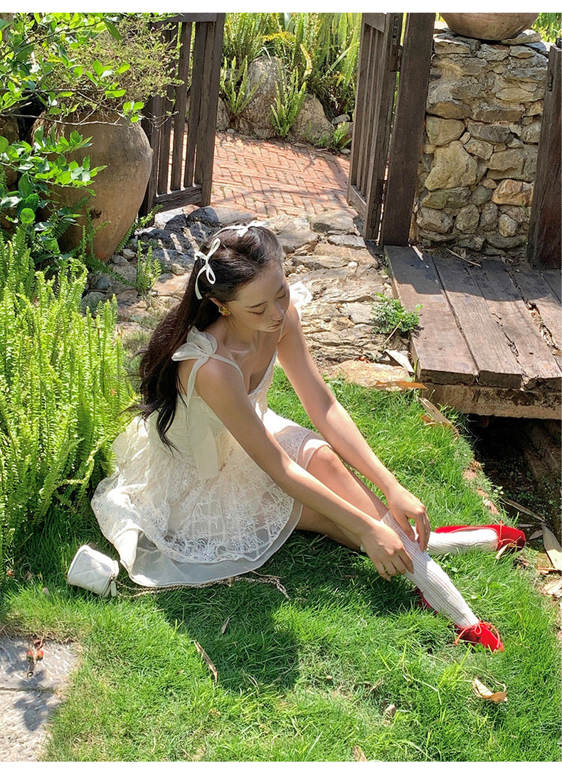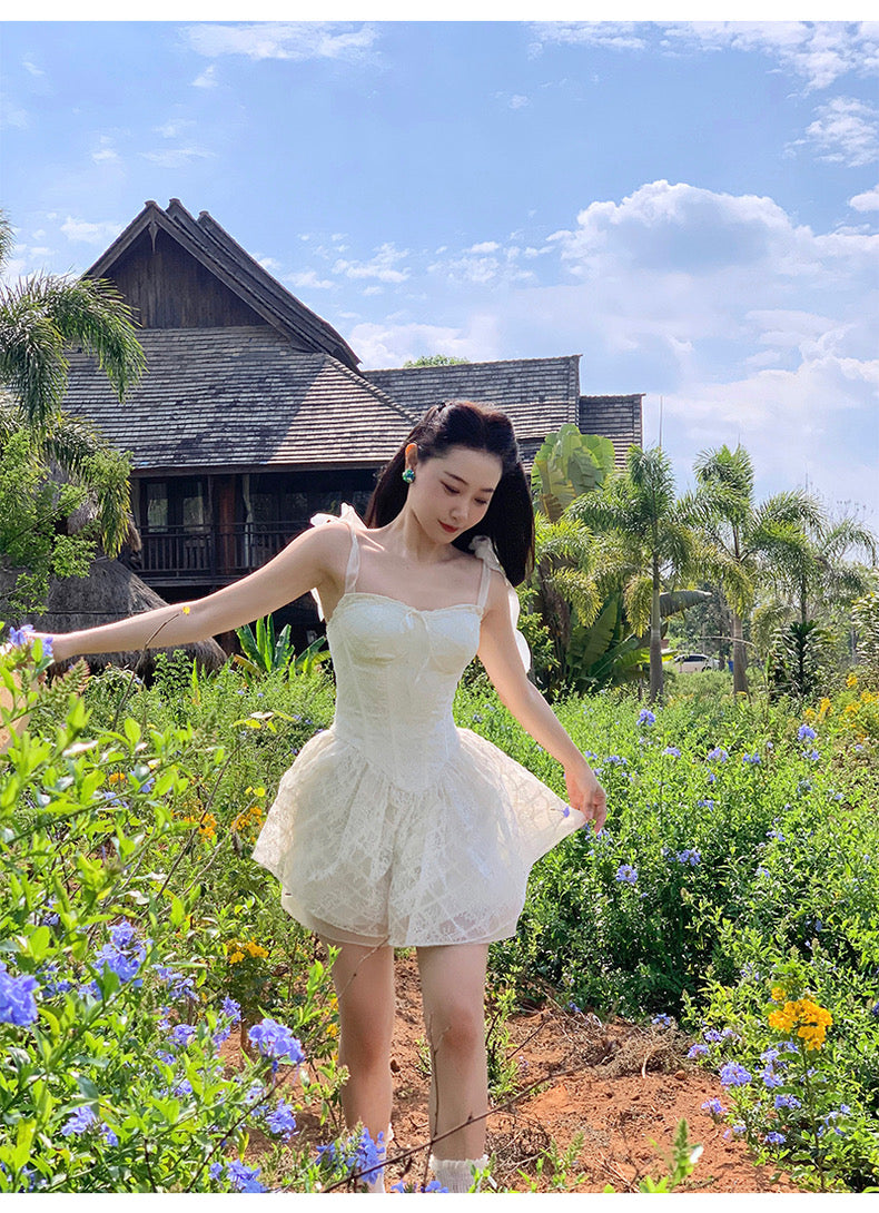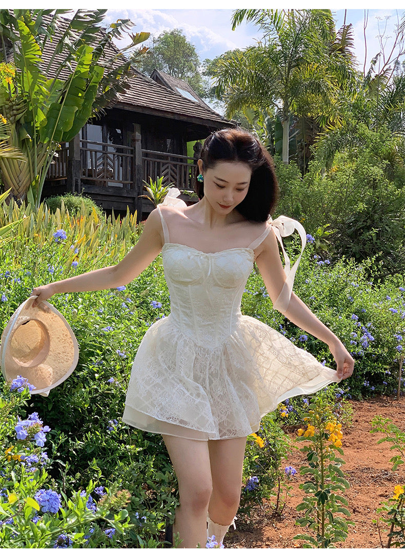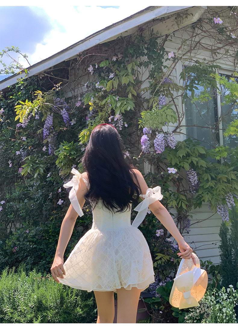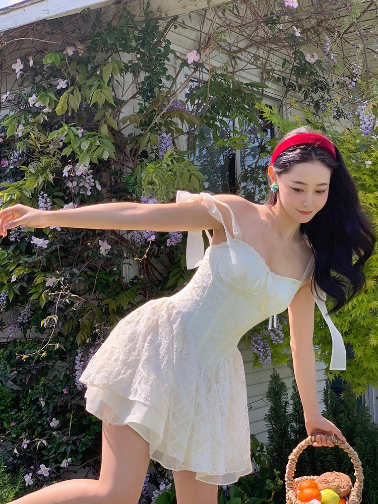 Lace intertwines with matching satin ribbons, forming sweet little bows that dance across the chest and back. The bodice is lightly padded for shape and support, while our signature fishbone design—eight lines in total—sculpts the waist and enhances that coveted hourglass silhouette.