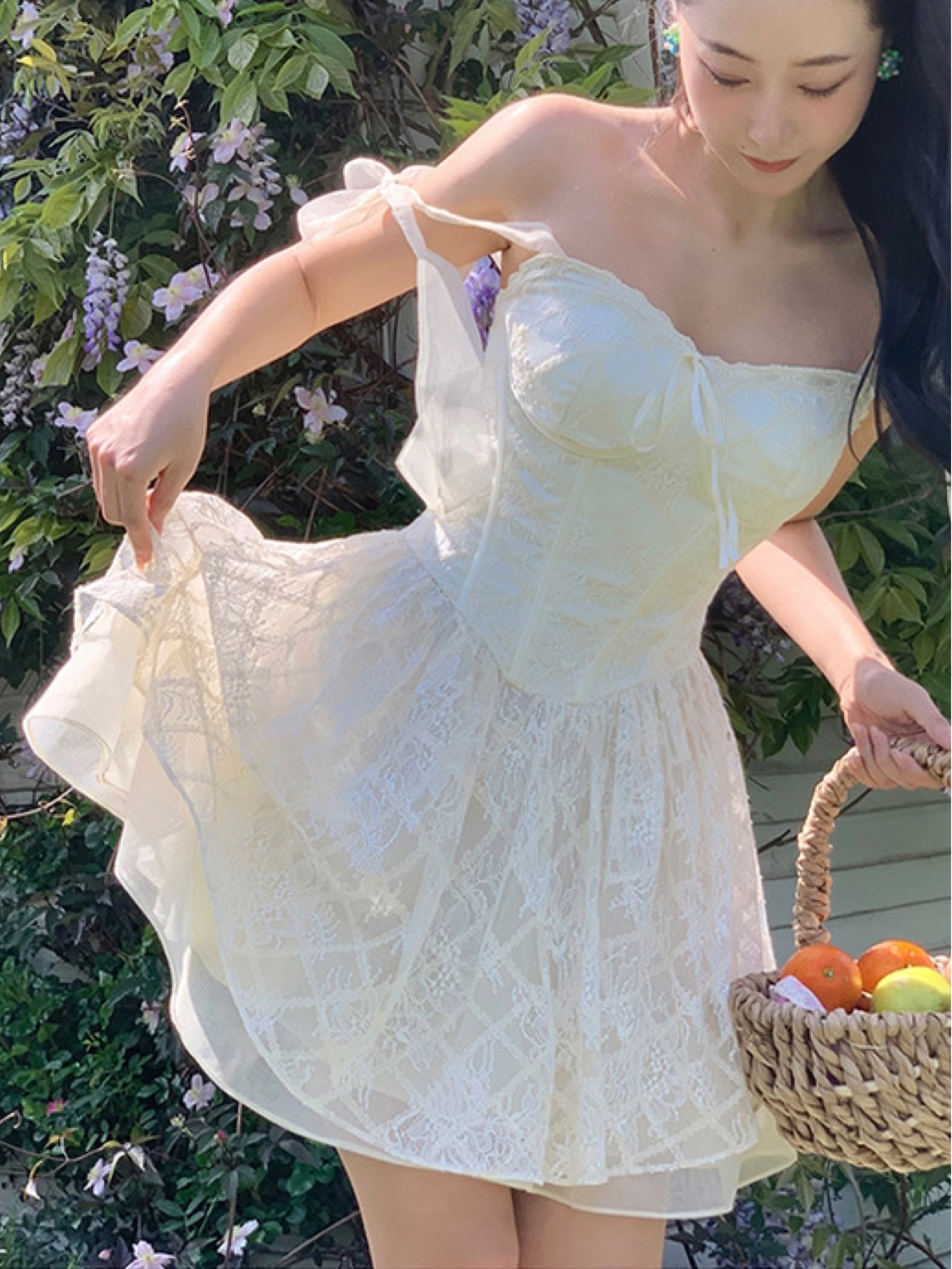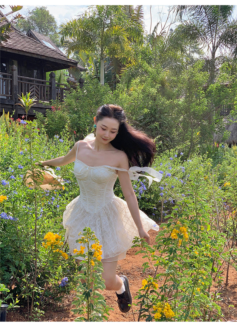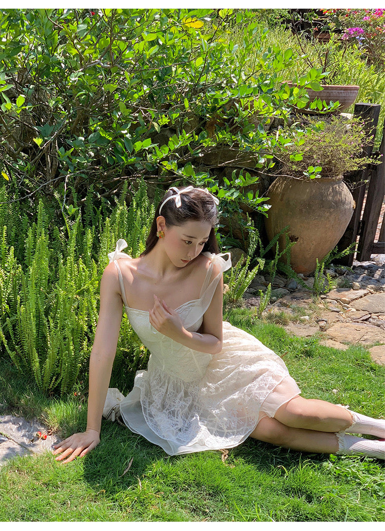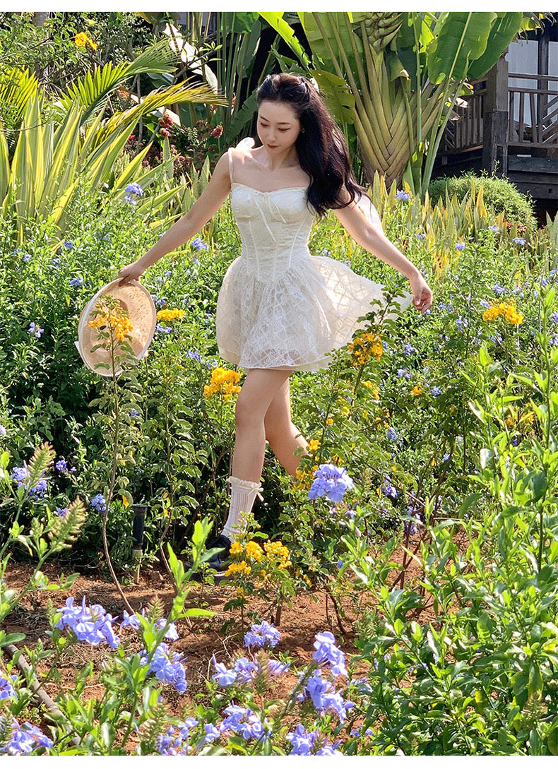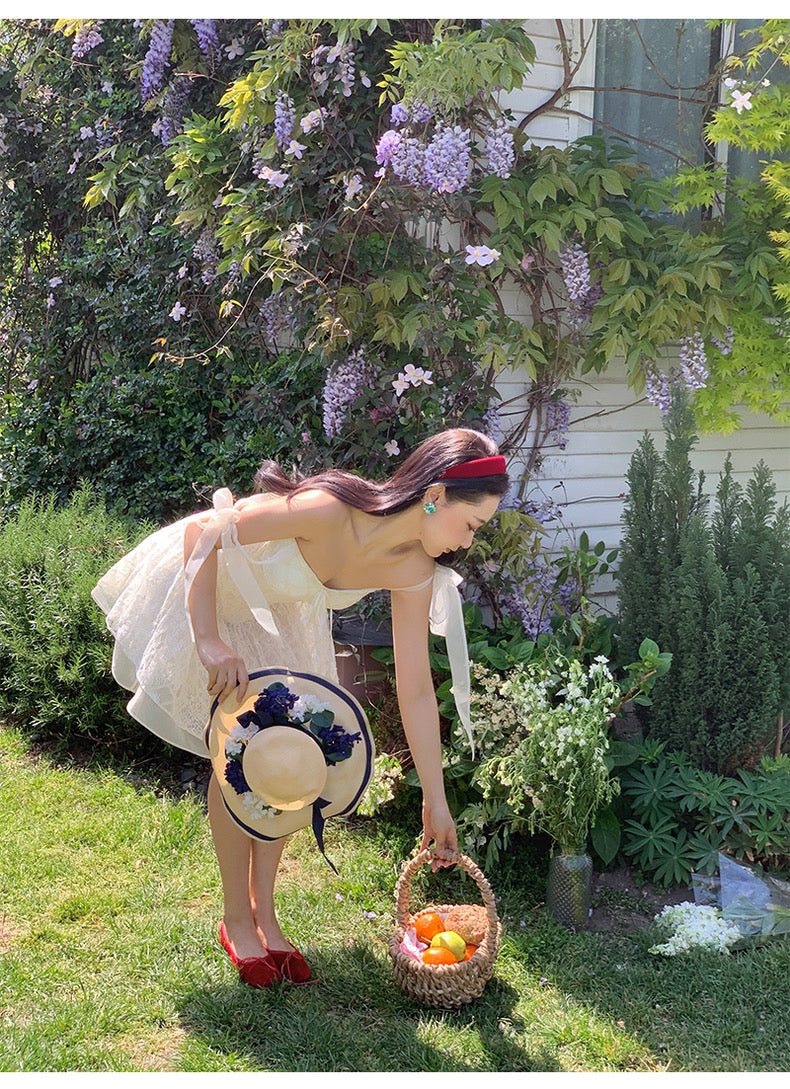 Lace intertwines with matching satin ribbons, forming sweet little bows that dance across the chest and back. The bodice is lightly padded for shape and support, while our signature fishbone design—eight lines in total—sculpts the waist and enhances that coveted hourglass silhouette.