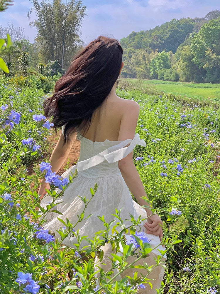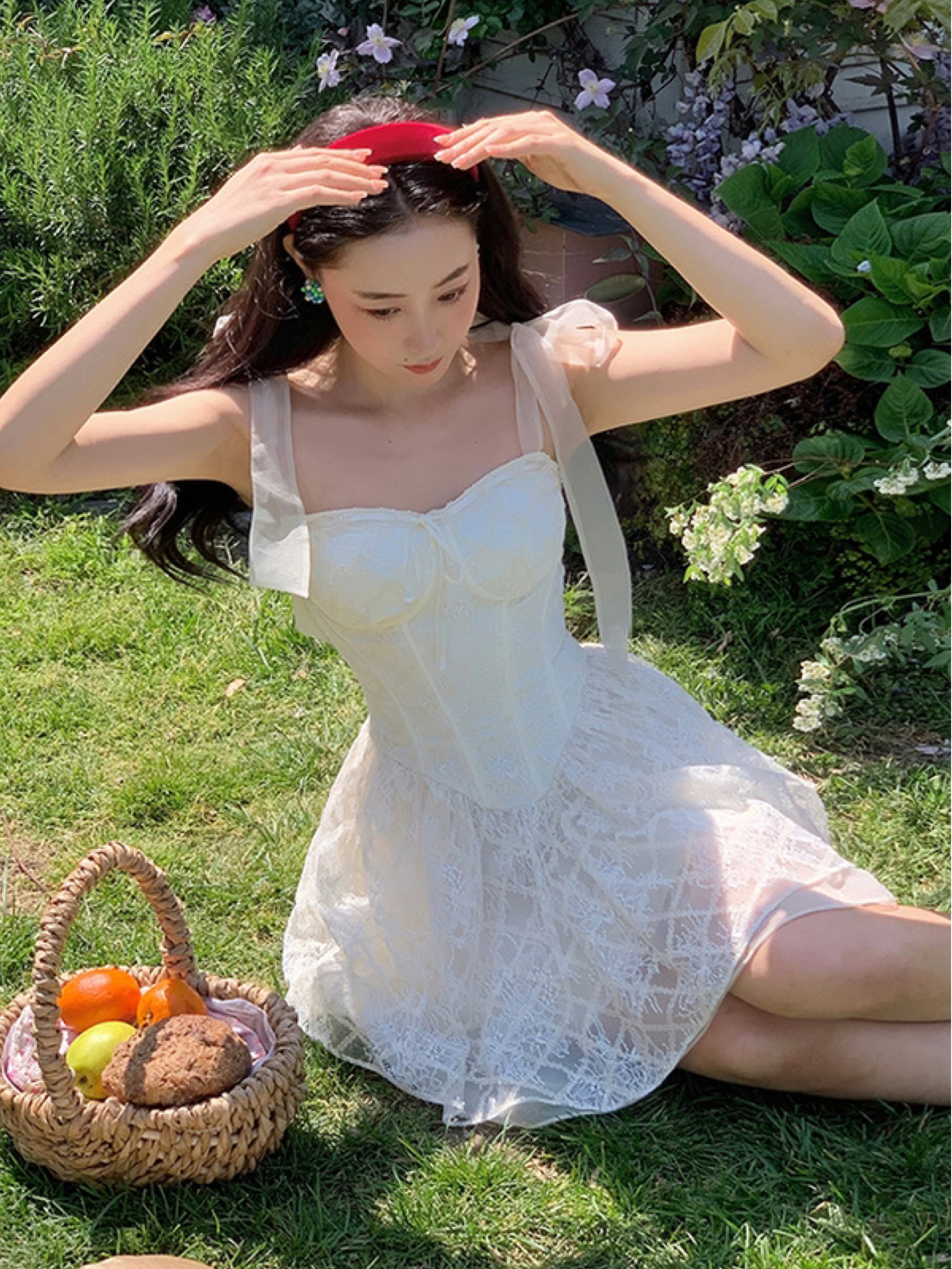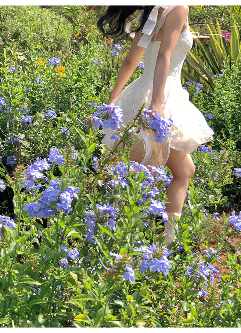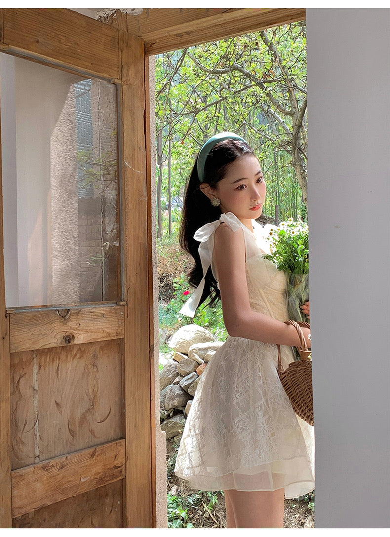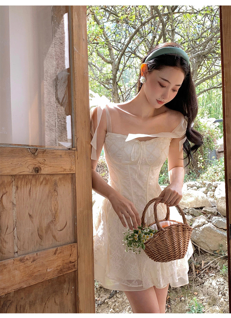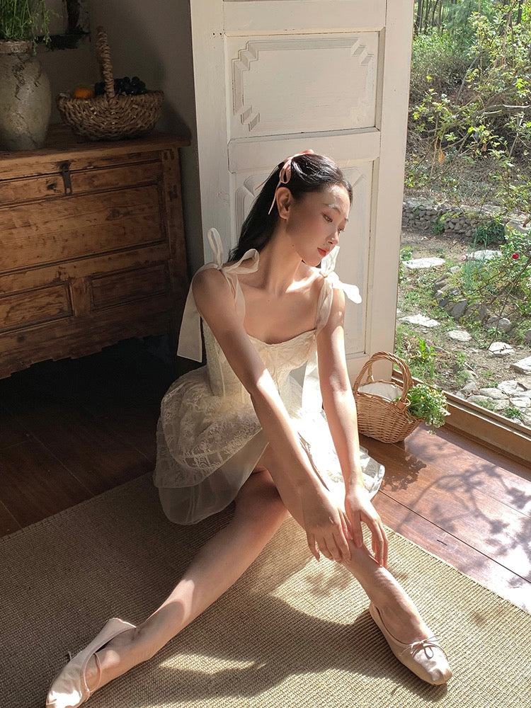 Lace intertwines with matching satin ribbons, forming sweet little bows that dance across the chest and back. The bodice is lightly padded for shape and support, while our signature fishbone design—eight lines in total—sculpts the waist and enhances that coveted hourglass silhouette.