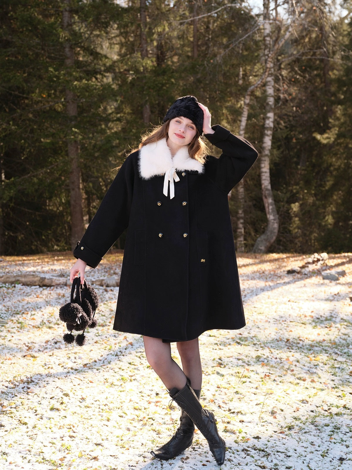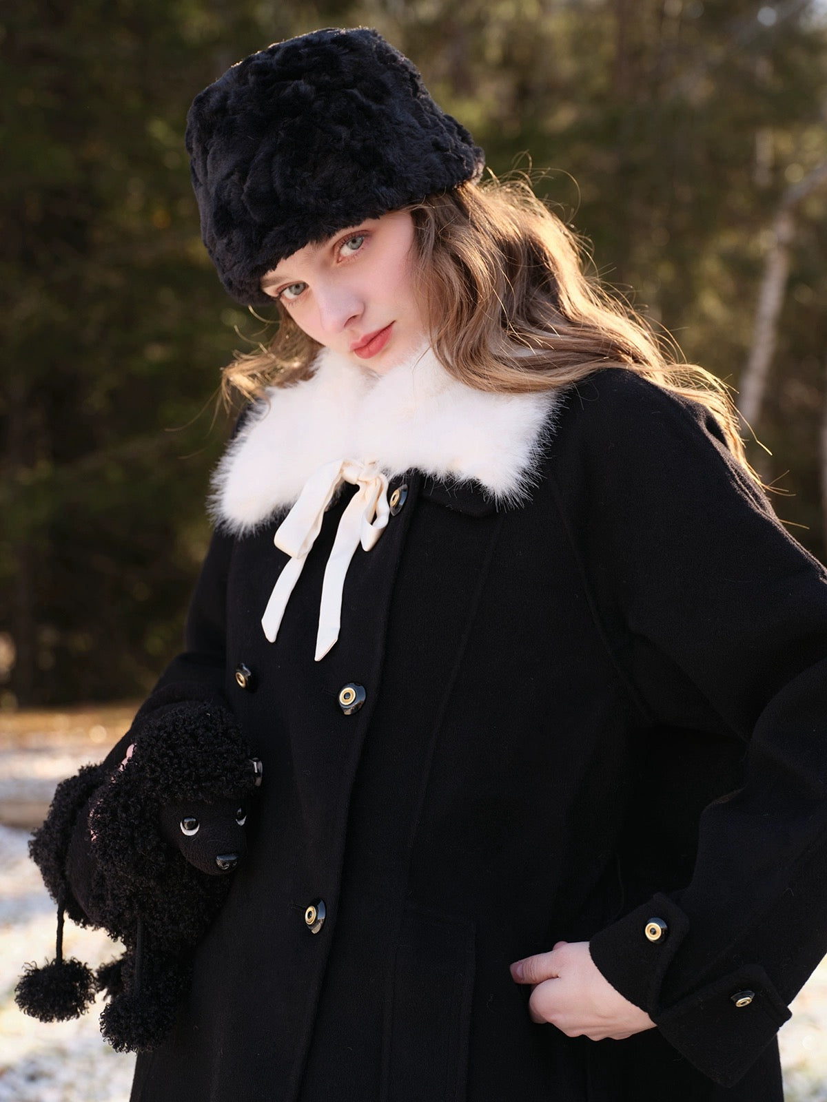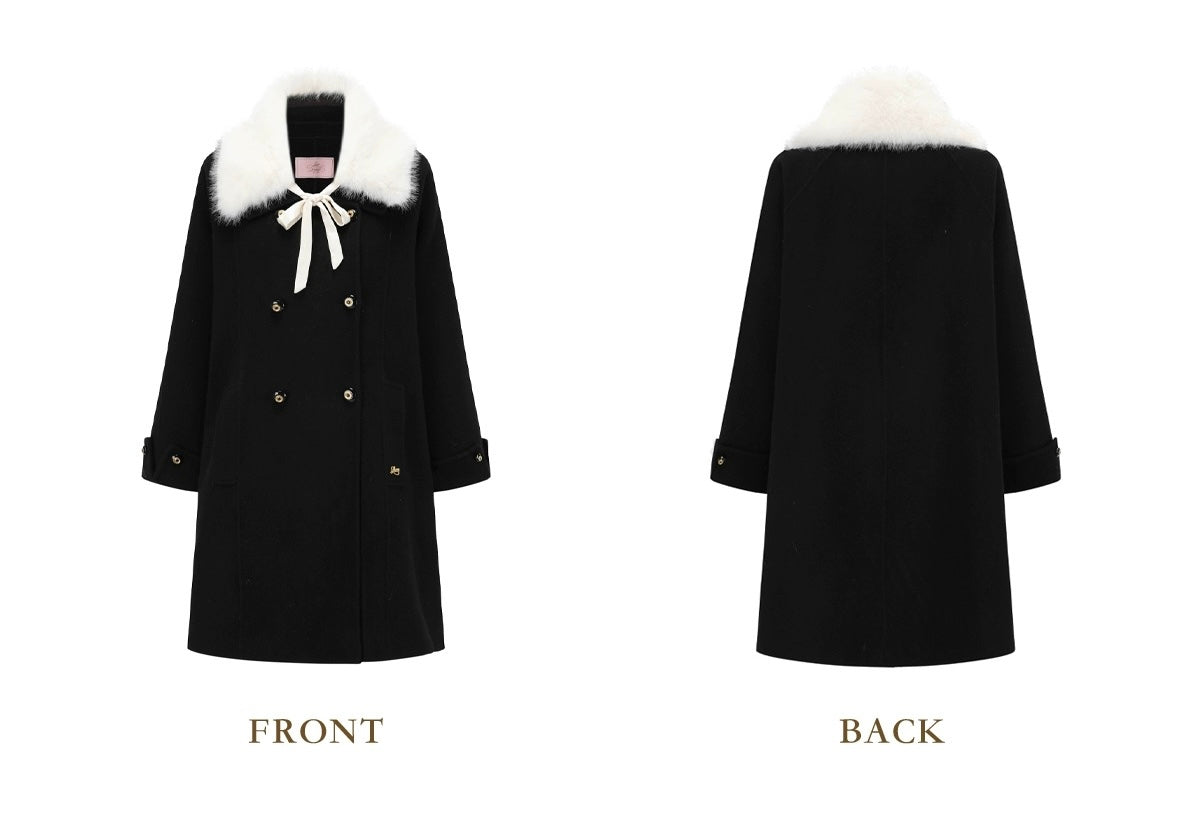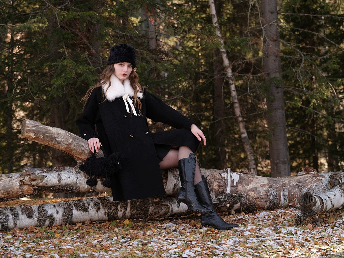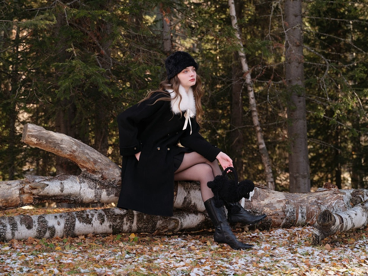 The classic lapel comes with a detachable faux fur collar, complete with a satin ribbon tie that adds just the right amount of soft drama. Whether you’re going full “old-money” or keeping things simple, ‘Pascalette’ suits any mood.