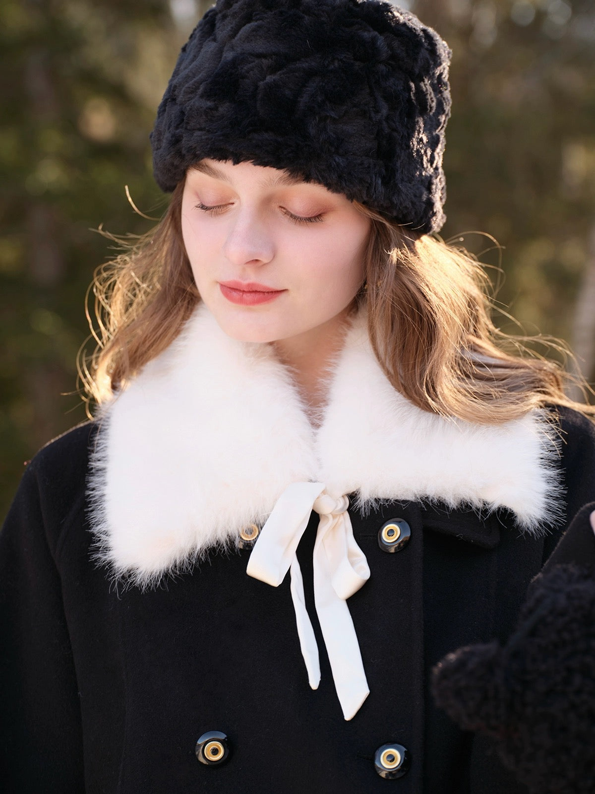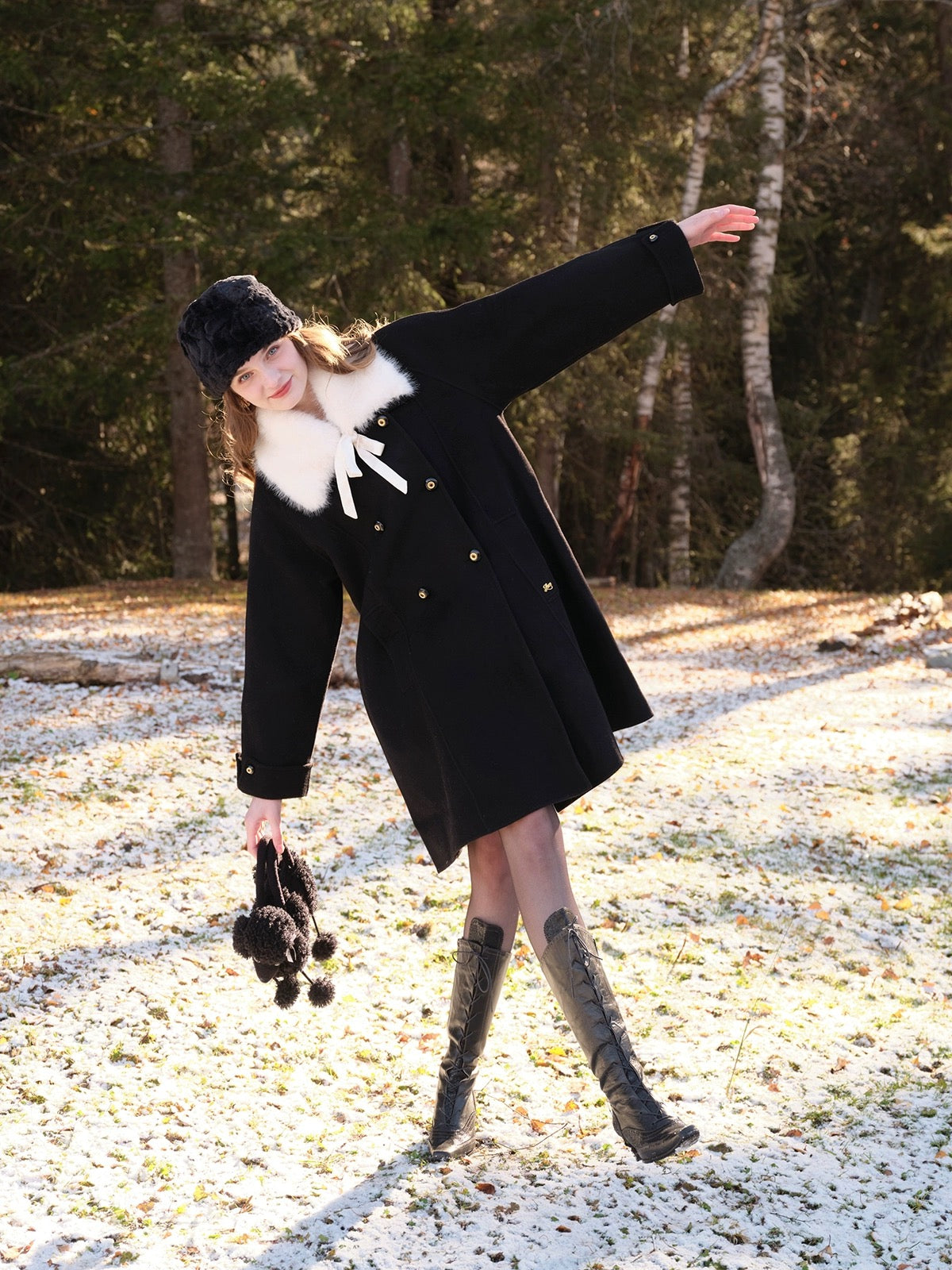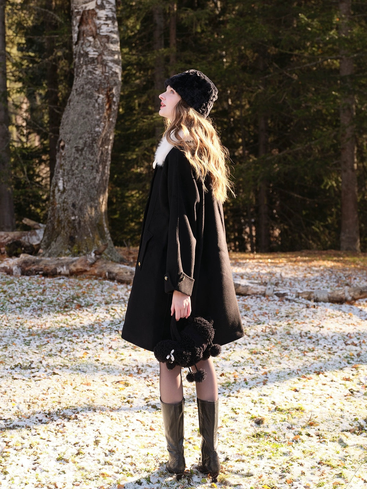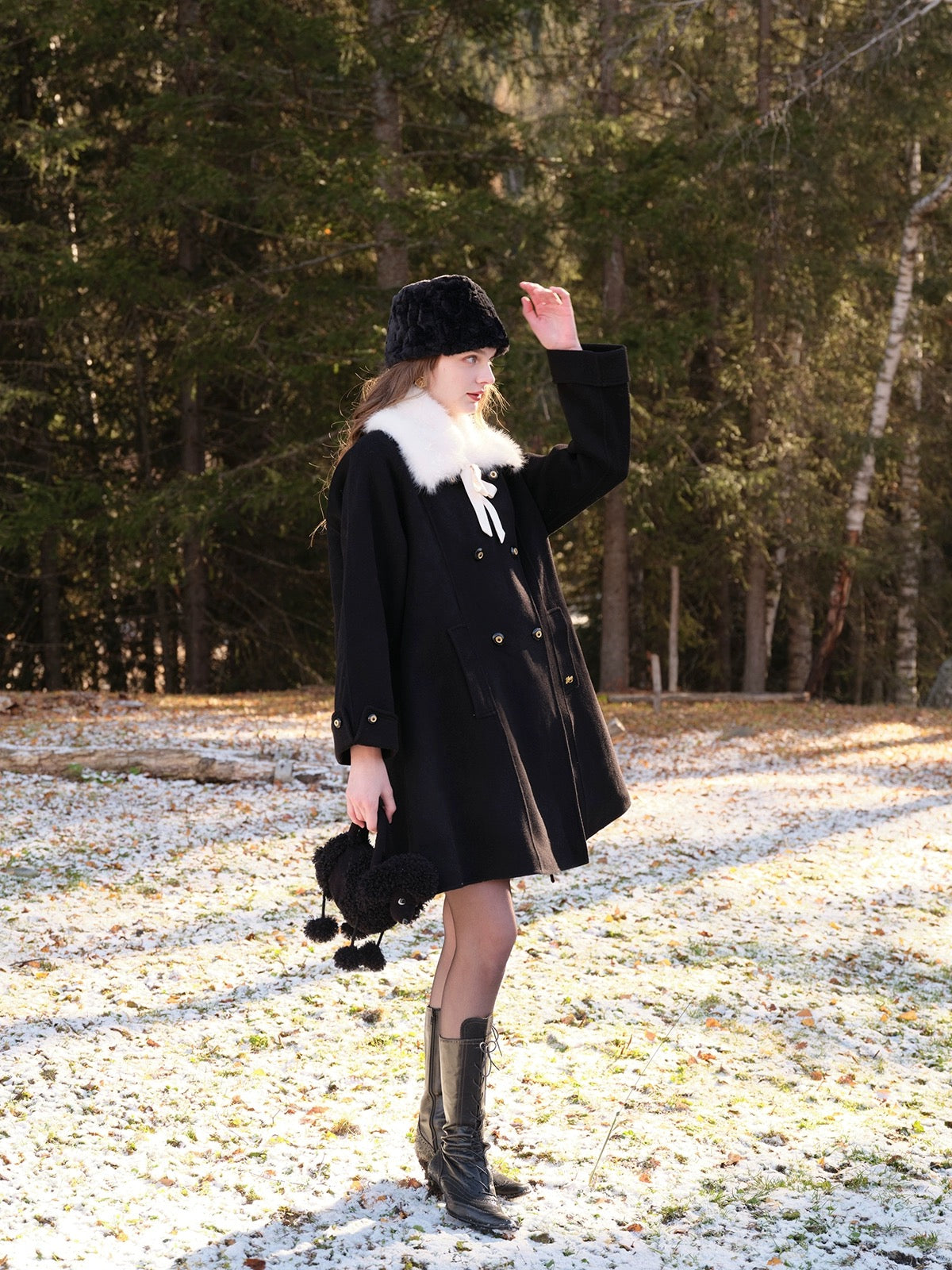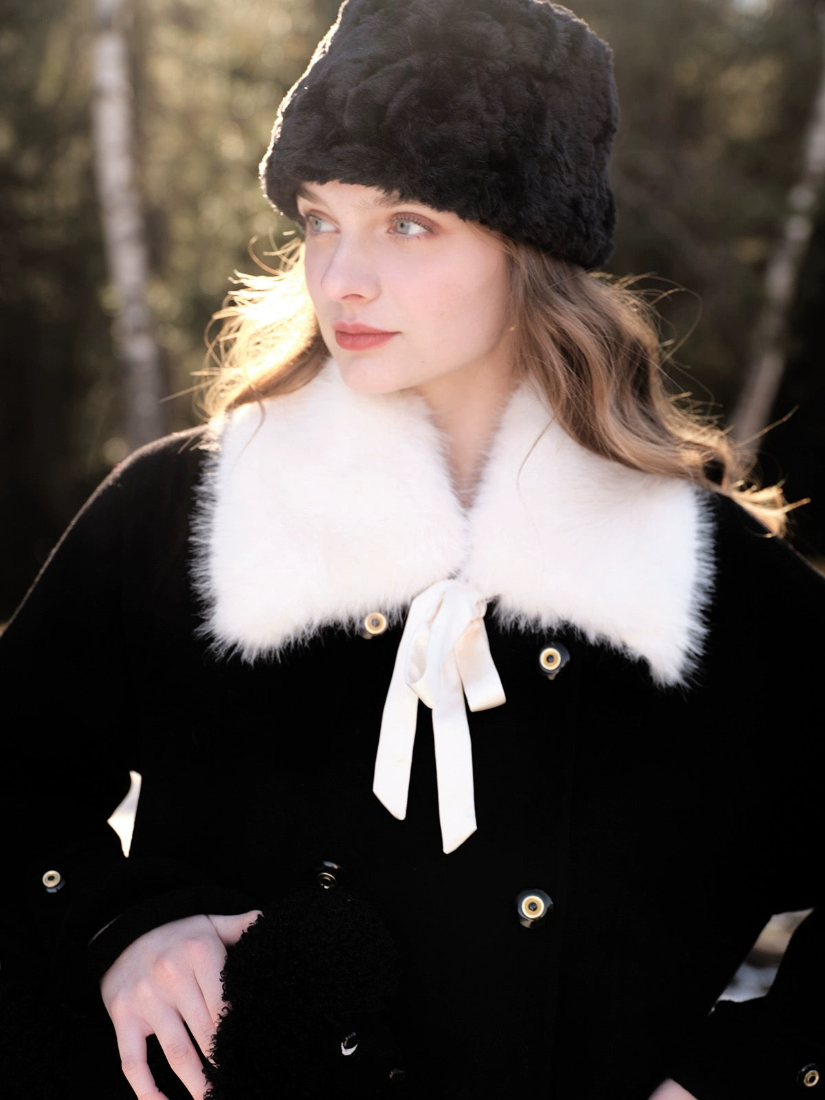 The classic lapel comes with a detachable faux fur collar, complete with a satin ribbon tie that adds just the right amount of soft drama. Whether you’re going full “old-money” or keeping things simple, ‘Pascalette’ suits any mood.