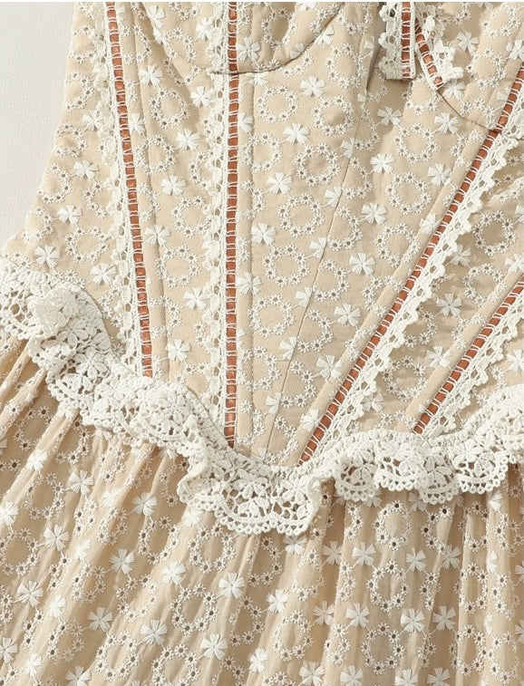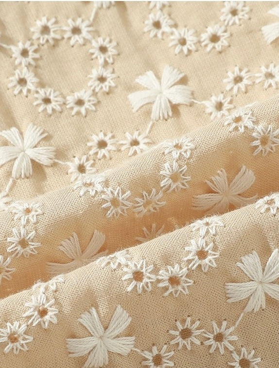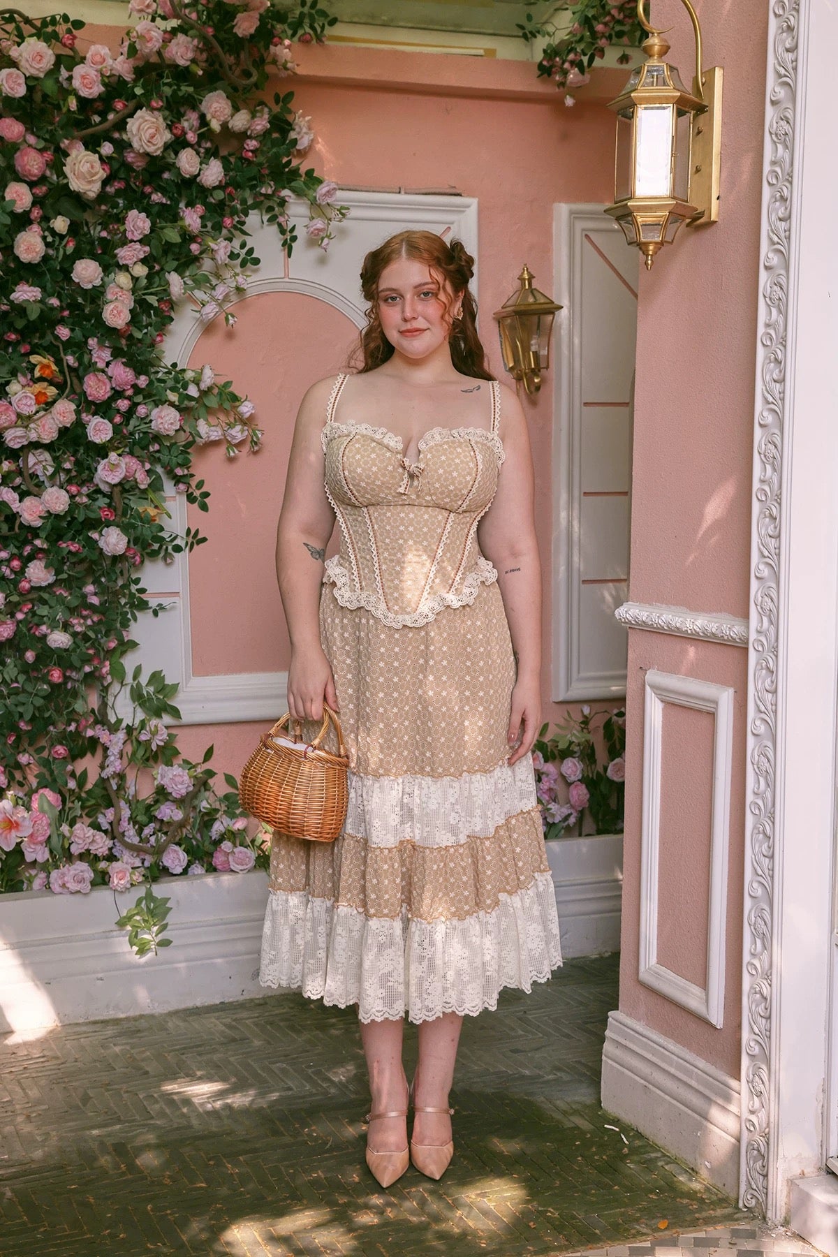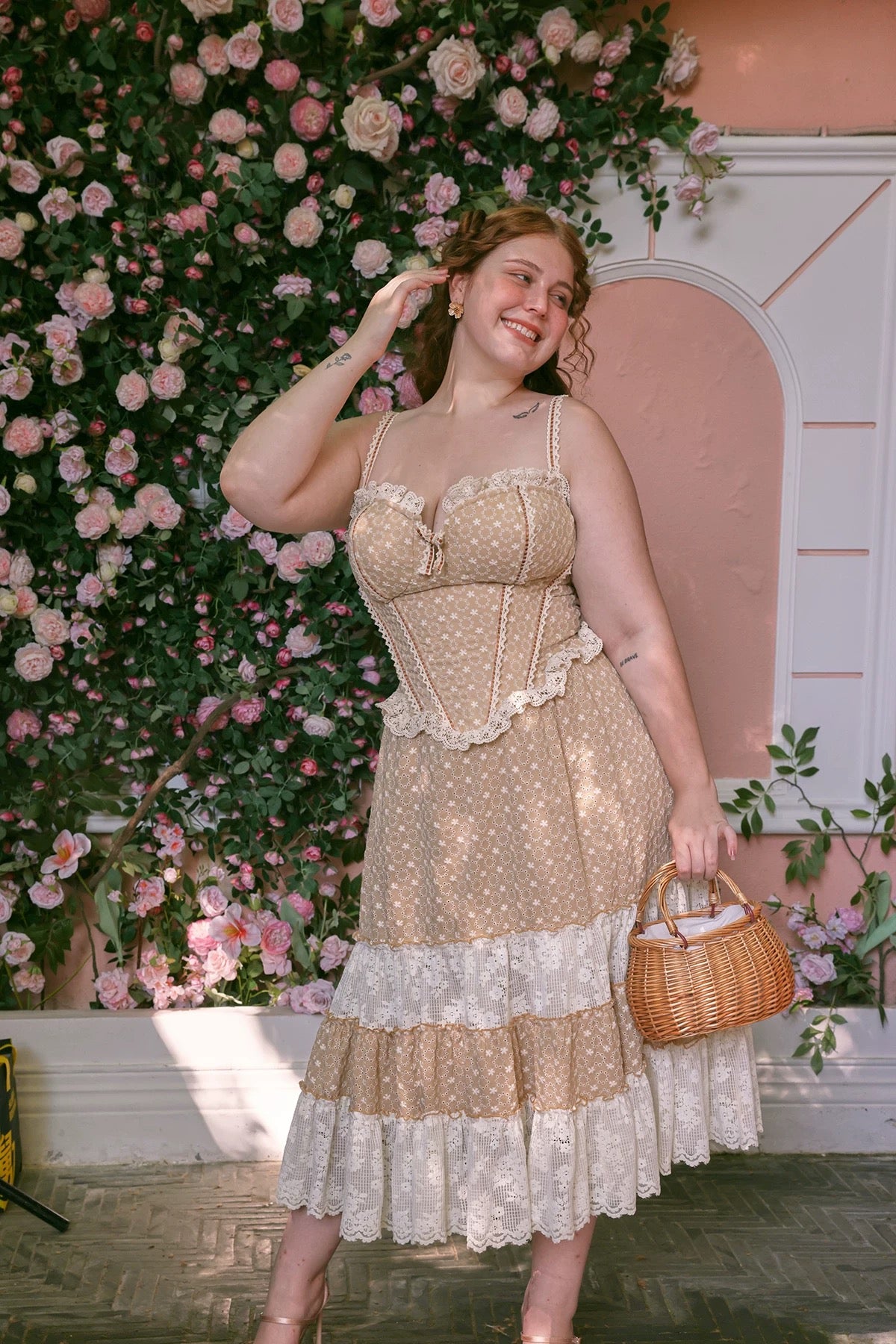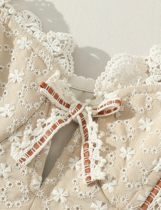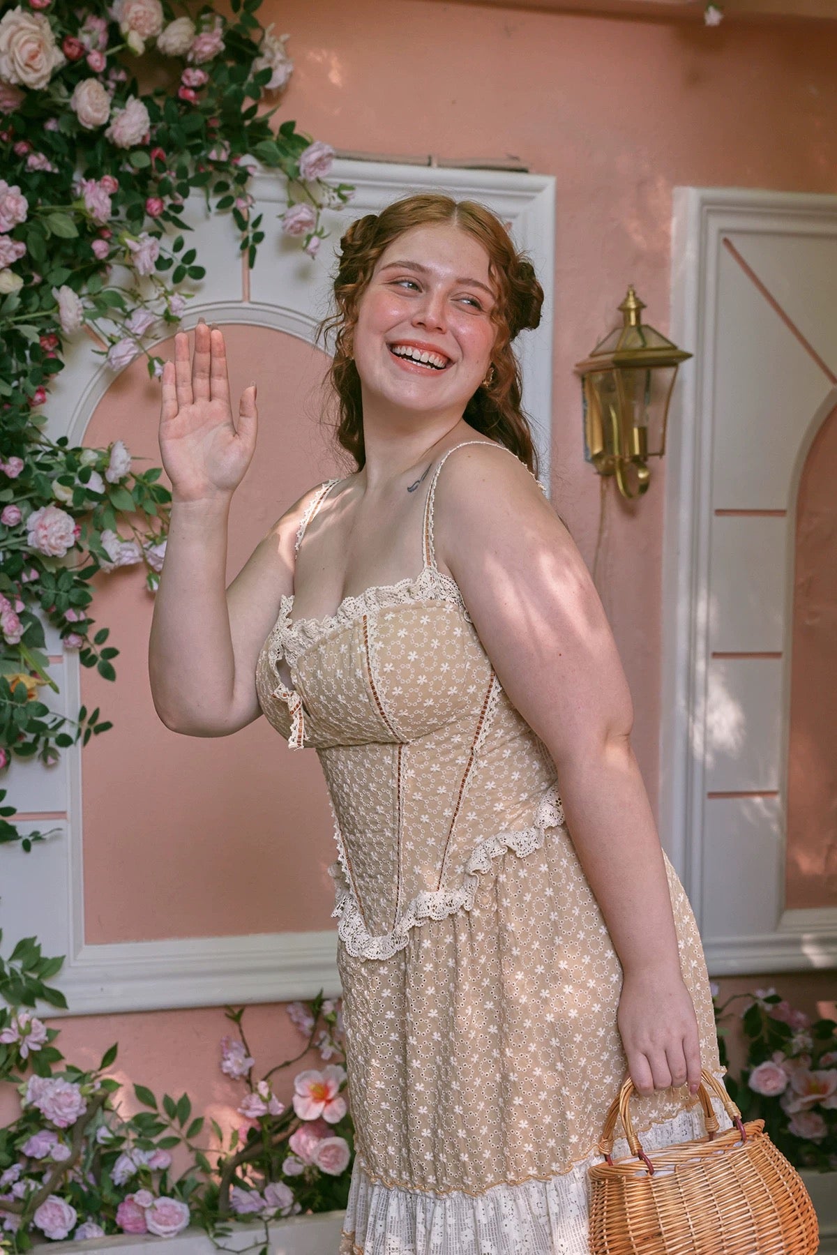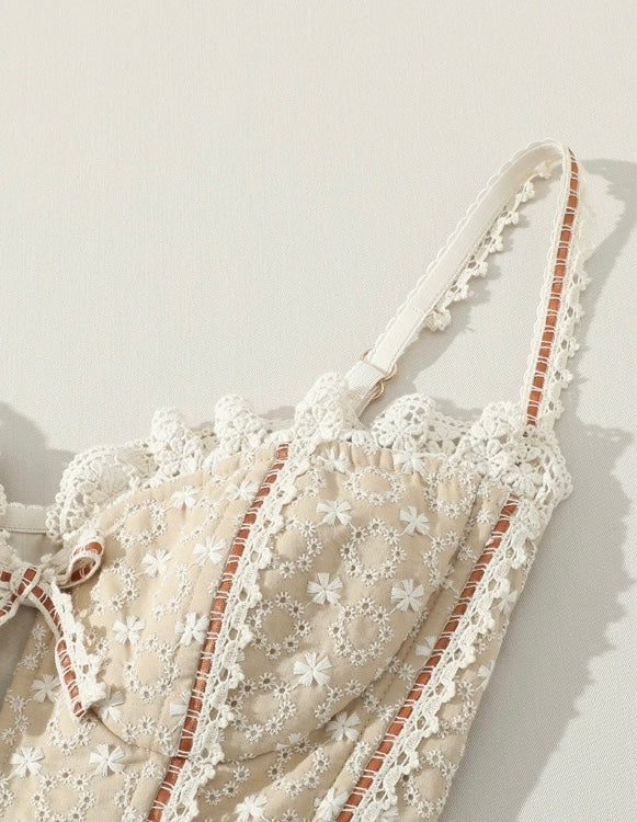 The Quinntina dress is vintage charm with a modern touch—crafted from custom embroidered cotton that’s soft, sculpted, and rich in texture. The lace-trimmed bust features delicate padding for shape, with a dainty bow and hidden V-support that keeps everything lifted and in place.