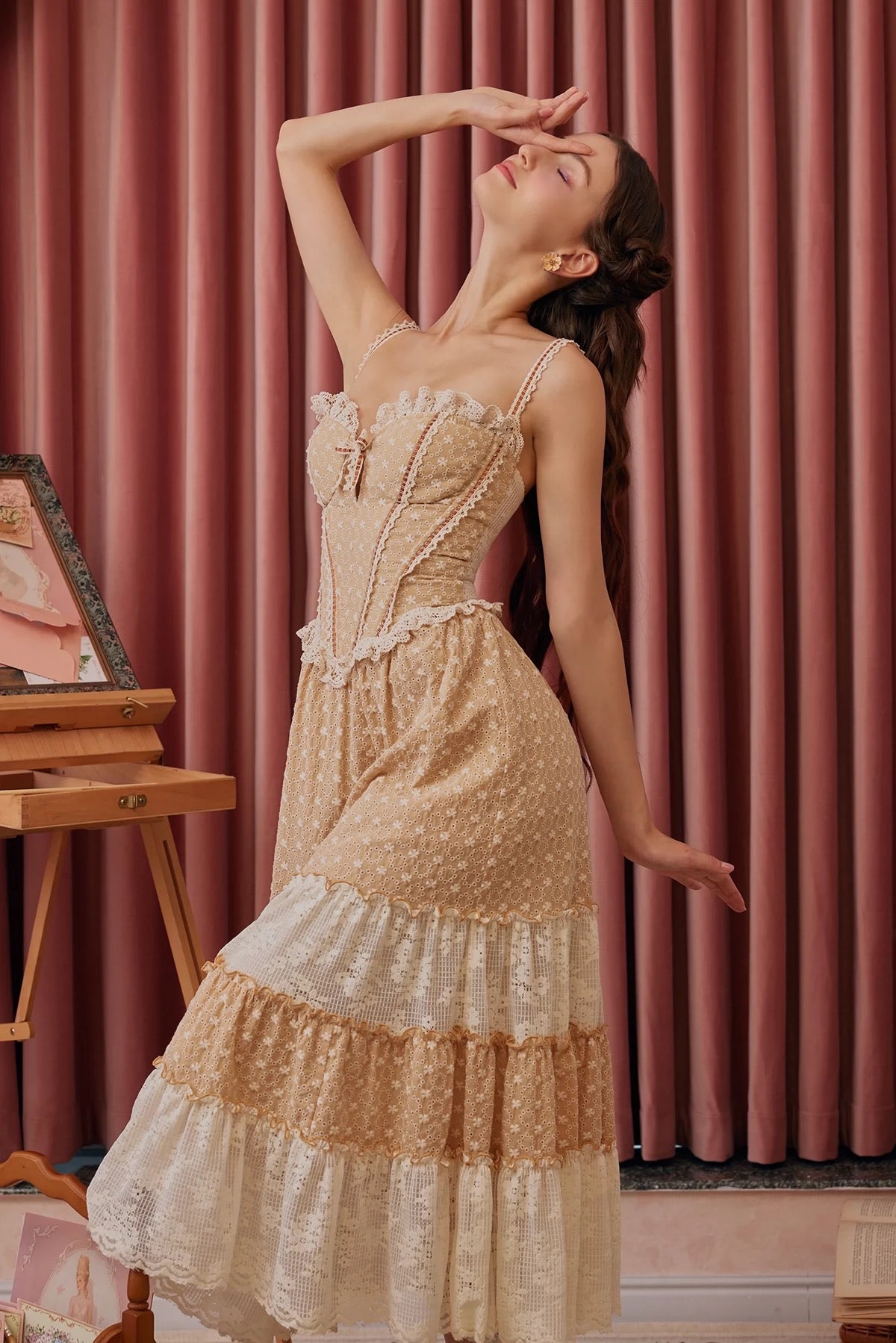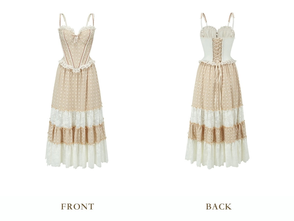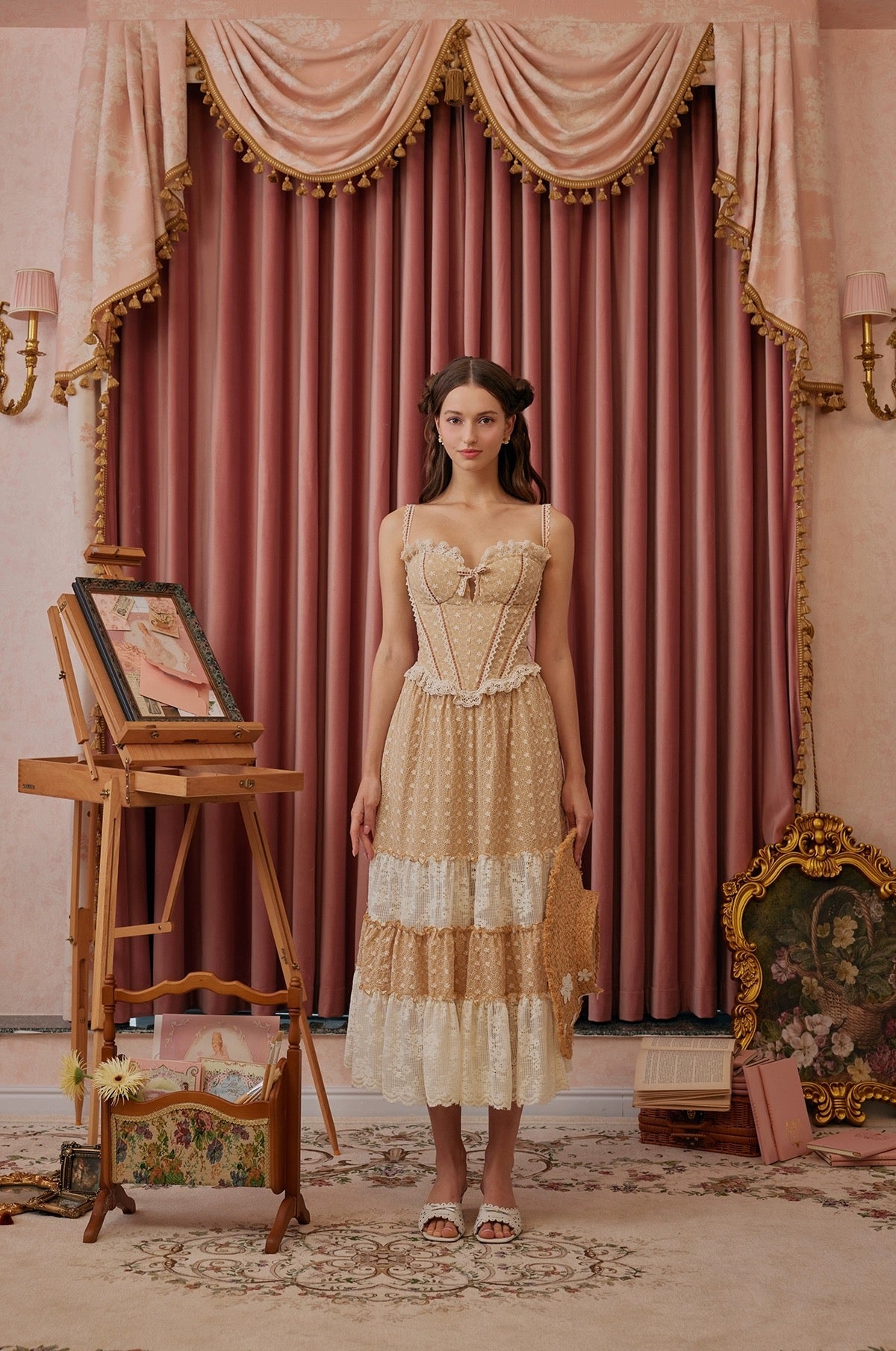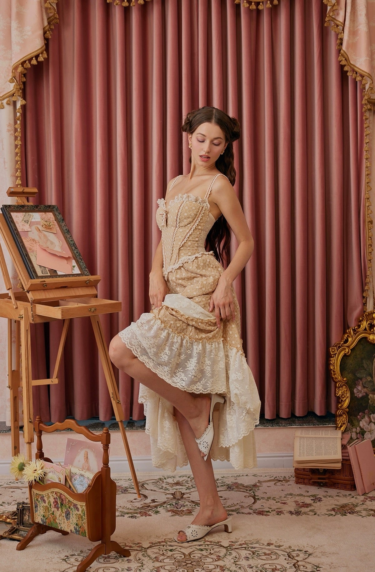 We added petal-shaped lace at the waist, layered over our signature fishbone design to highlight your curves effortlessly. The tiered lace skirt is full and flowy, with carefully placed cuts that give it a polished, high-end feel.