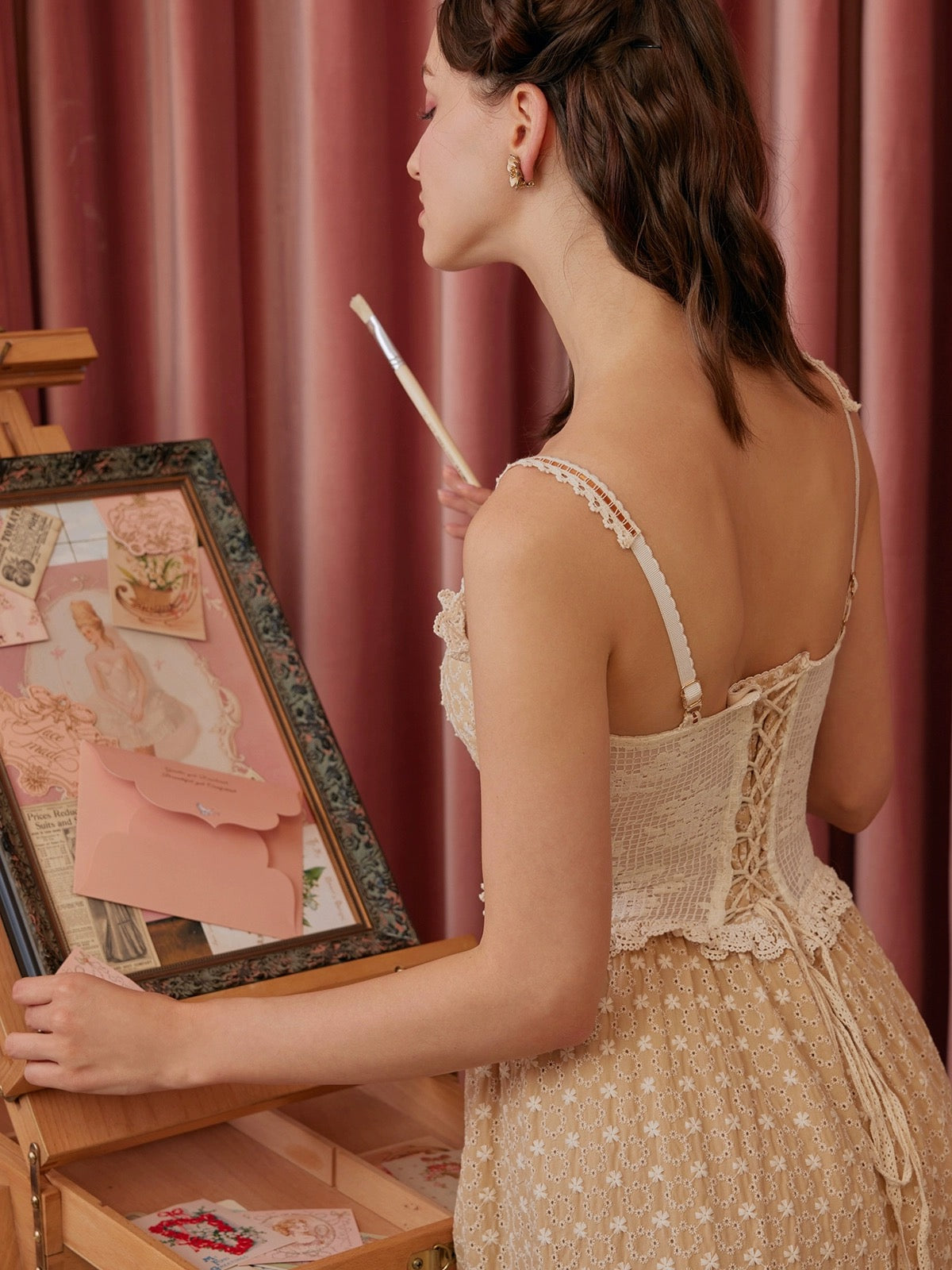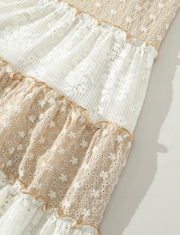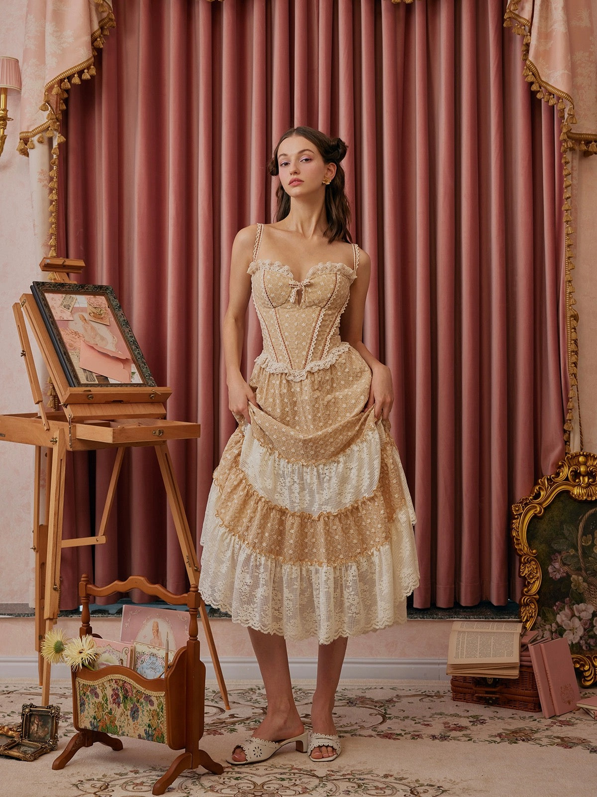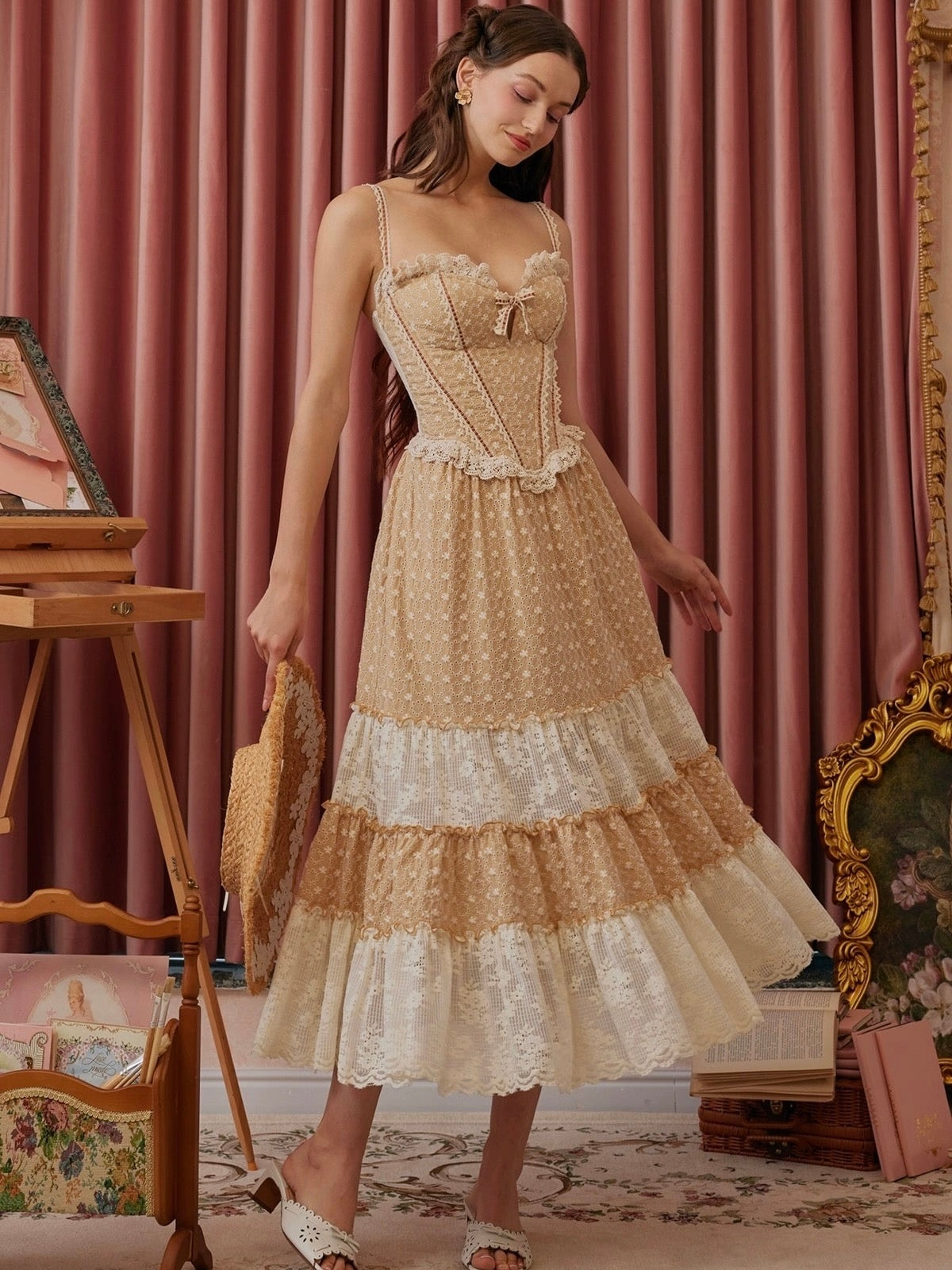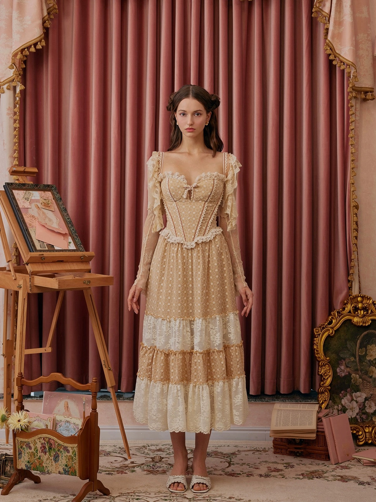 We added petal-shaped lace at the waist, layered over our signature fishbone design to highlight your curves effortlessly. The tiered lace skirt is full and flowy, with carefully placed cuts that give it a polished, high-end feel.