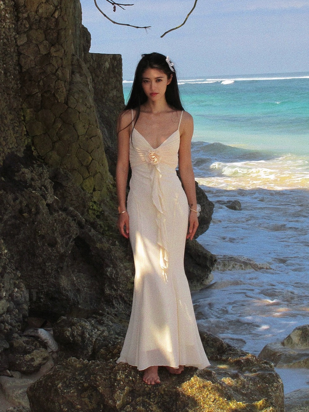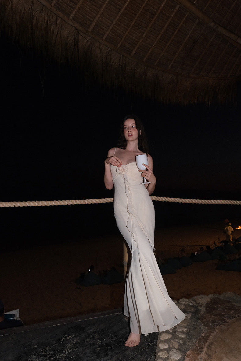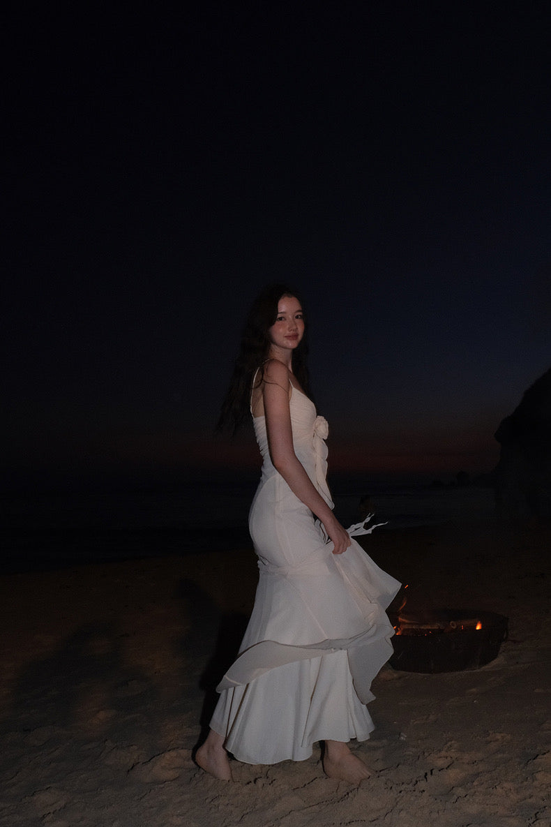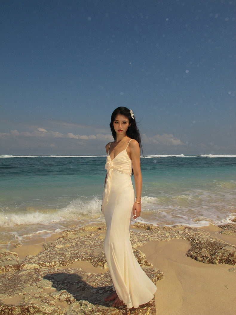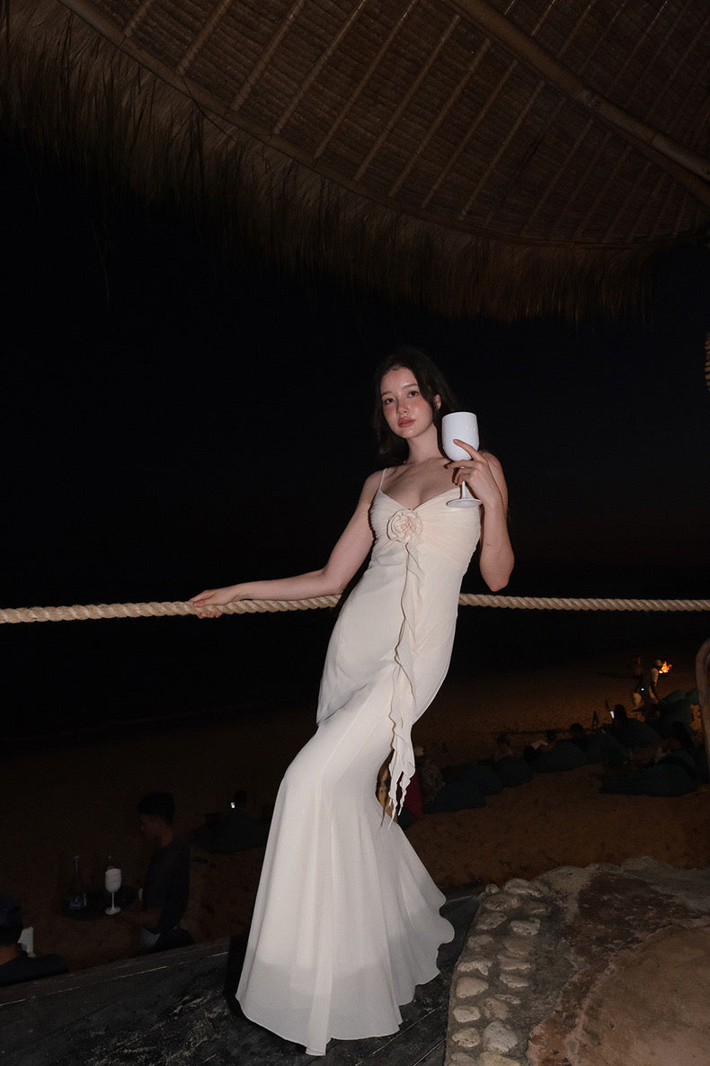 This elegant and romantic Owena dress is a perfect choice for vacations, blending style and sophistication effortlessly. Designed with just the right amount of skin exposure, the flowing fishtail skirt catches the breeze, creating a graceful silhouette with every step.