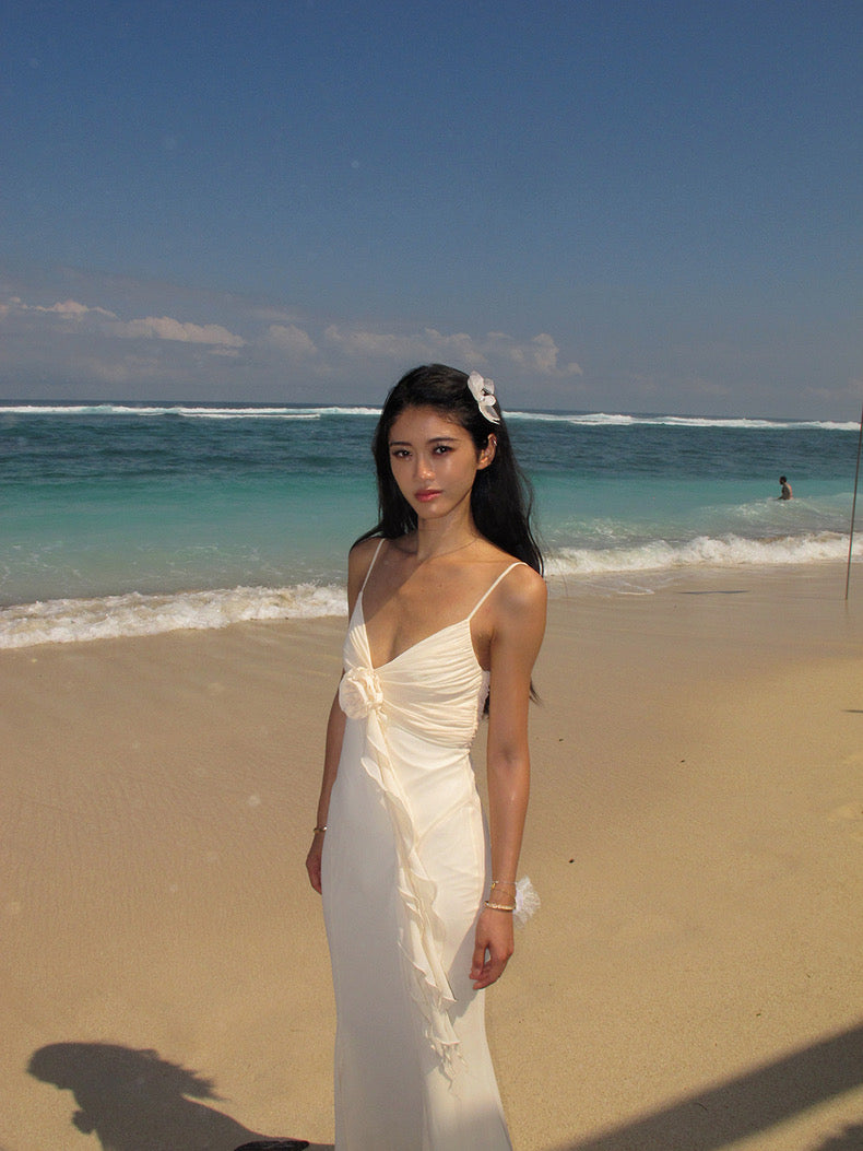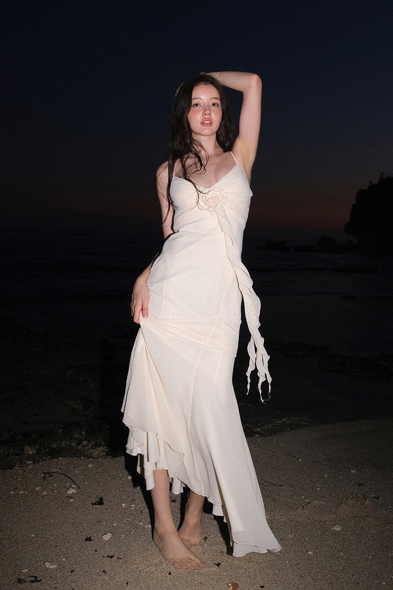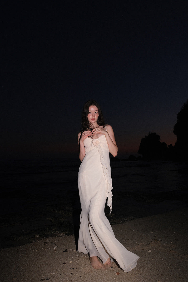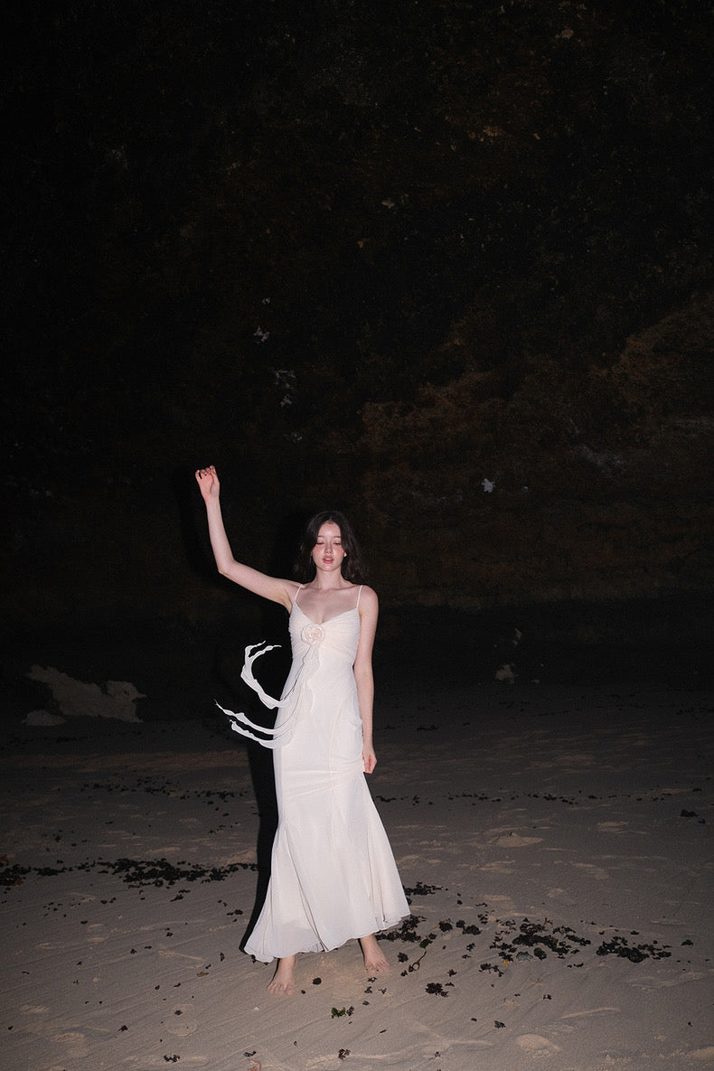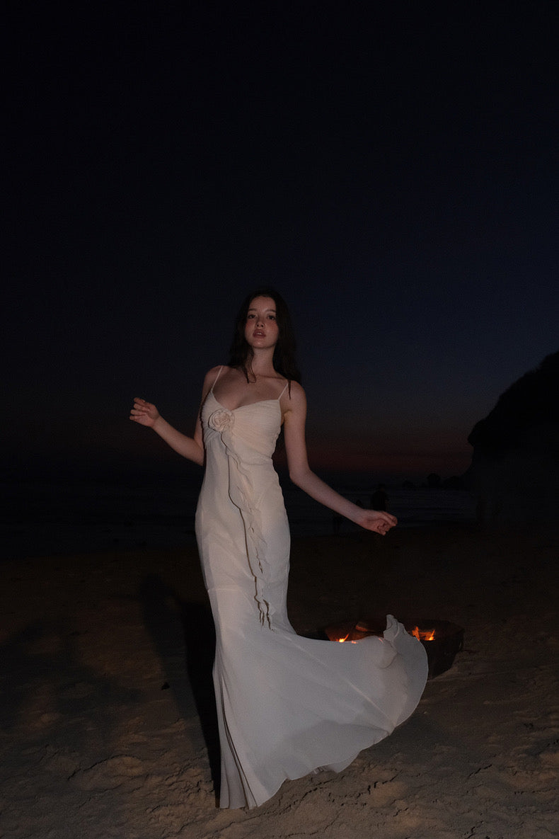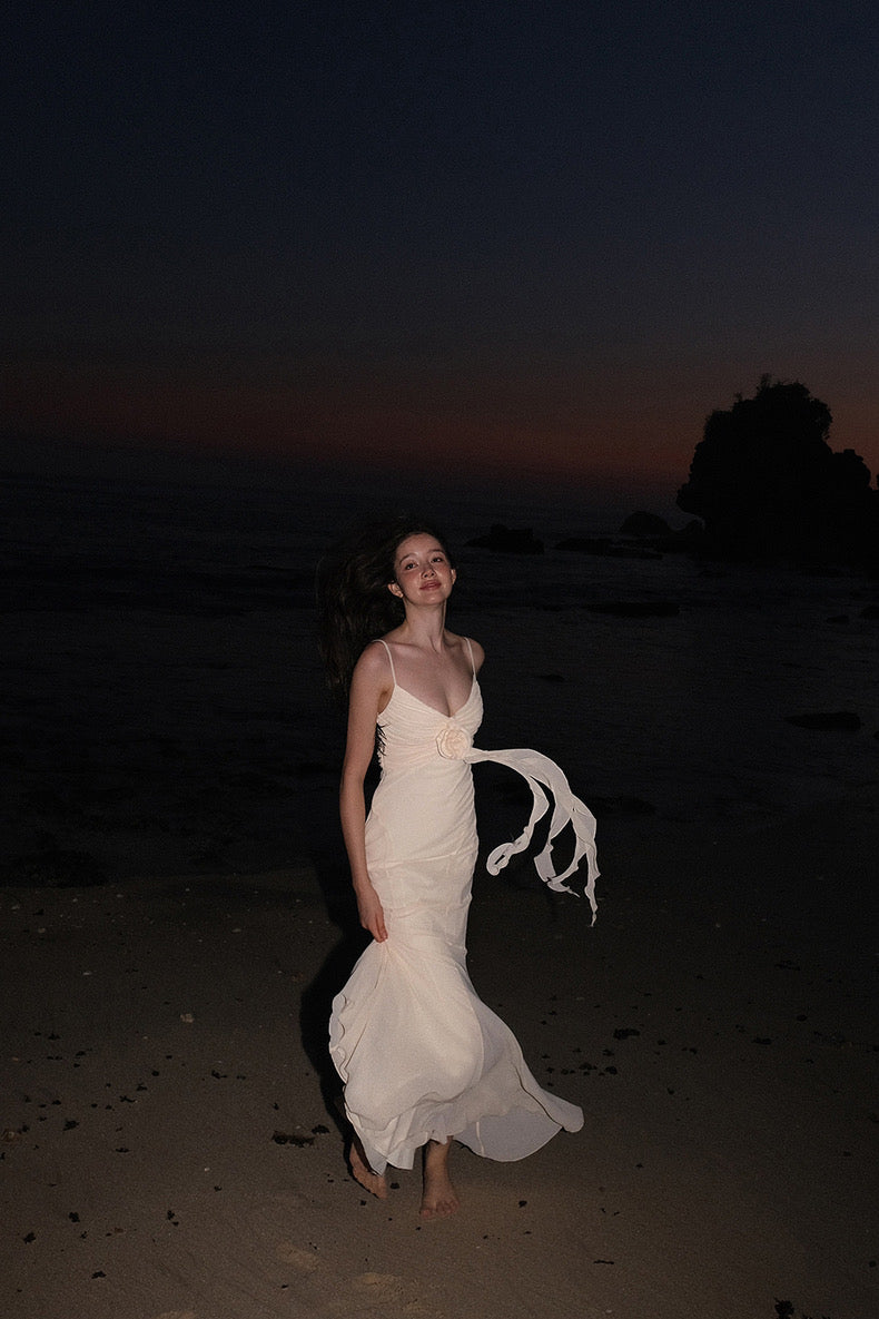 This elegant and romantic Owena dress is a perfect choice for vacations, blending style and sophistication effortlessly. Designed with just the right amount of skin exposure, the flowing fishtail skirt catches the breeze, creating a graceful silhouette with every step.