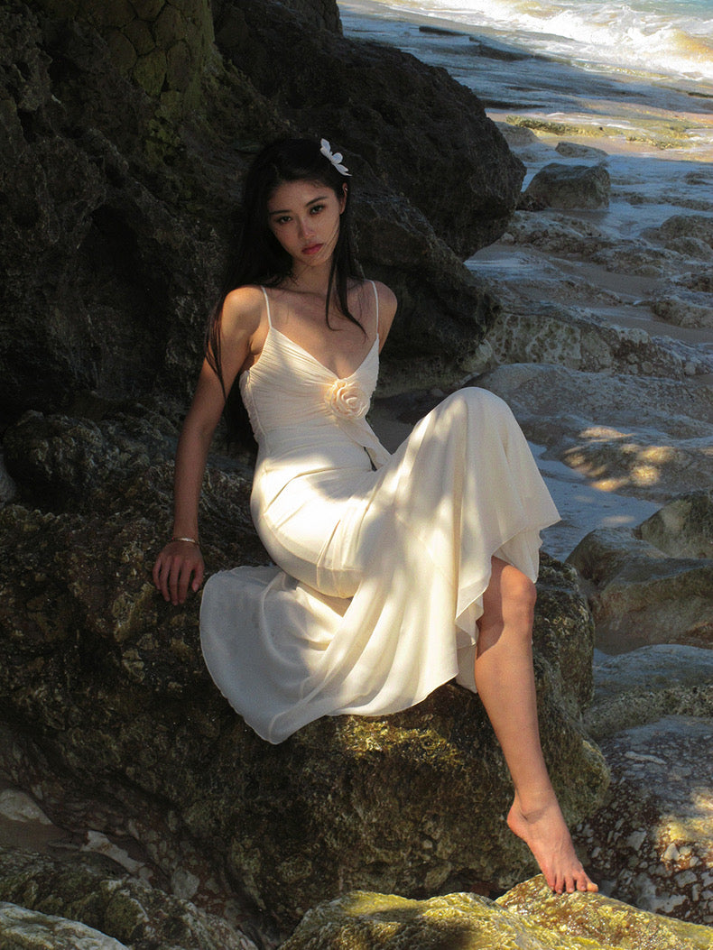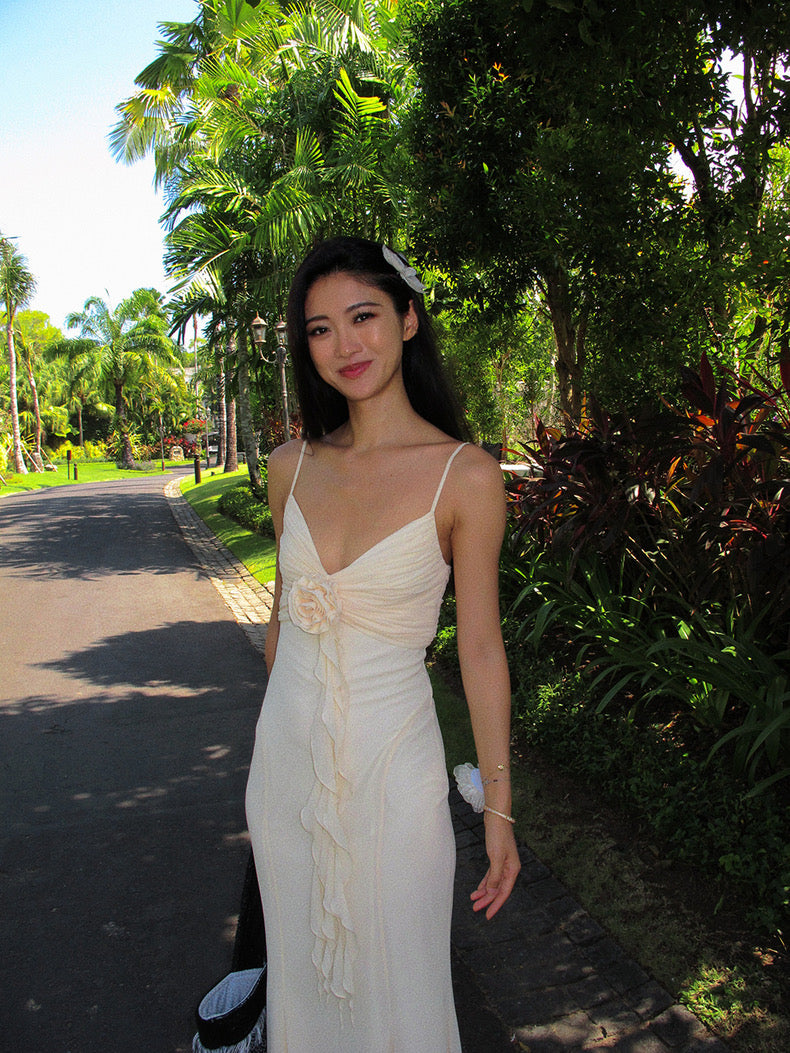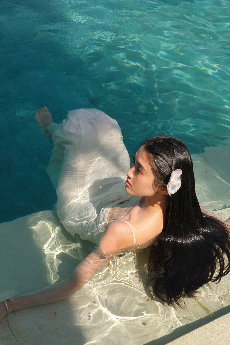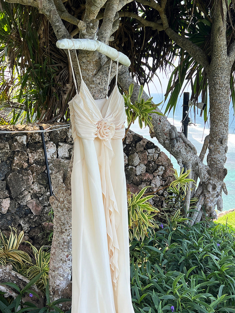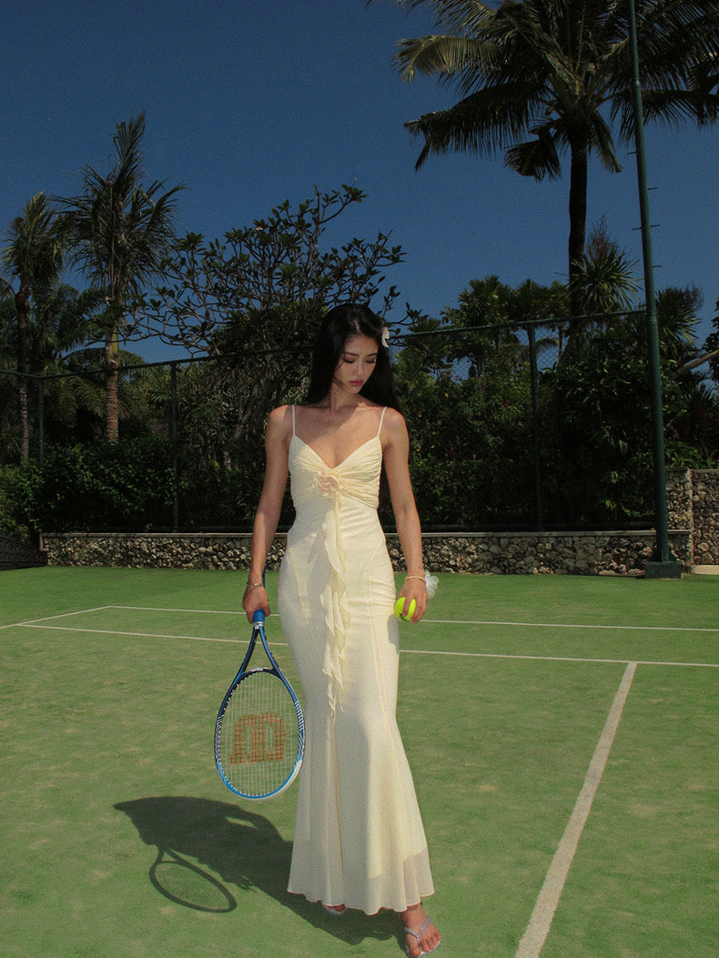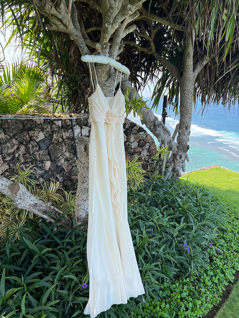 This elegant and romantic Owena dress is a perfect choice for vacations, blending style and sophistication effortlessly. Designed with just the right amount of skin exposure, the flowing fishtail skirt catches the breeze, creating a graceful silhouette with every step.
