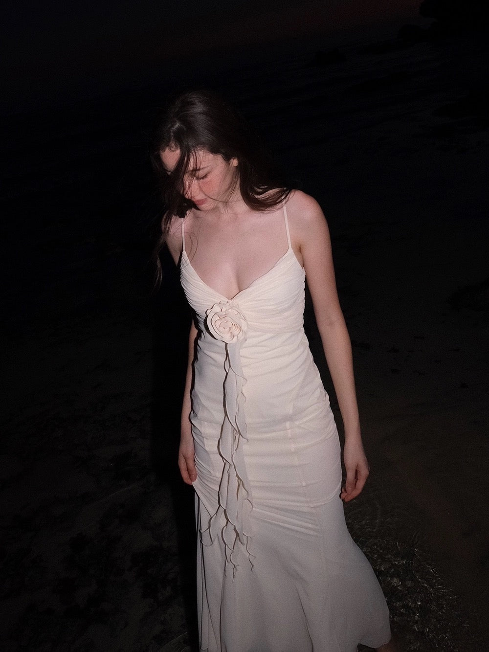 Delicate pleats across the chest lend depth and texture to the design, complemented by two charming ribbons and intricate, handmade three-dimensional roses. These roses, crafted by skilled artisans, exude a dreamy, romantic vibe. The detachable rose brooch adds a creative and versatile touch, making the dress adaptable to different occasions.