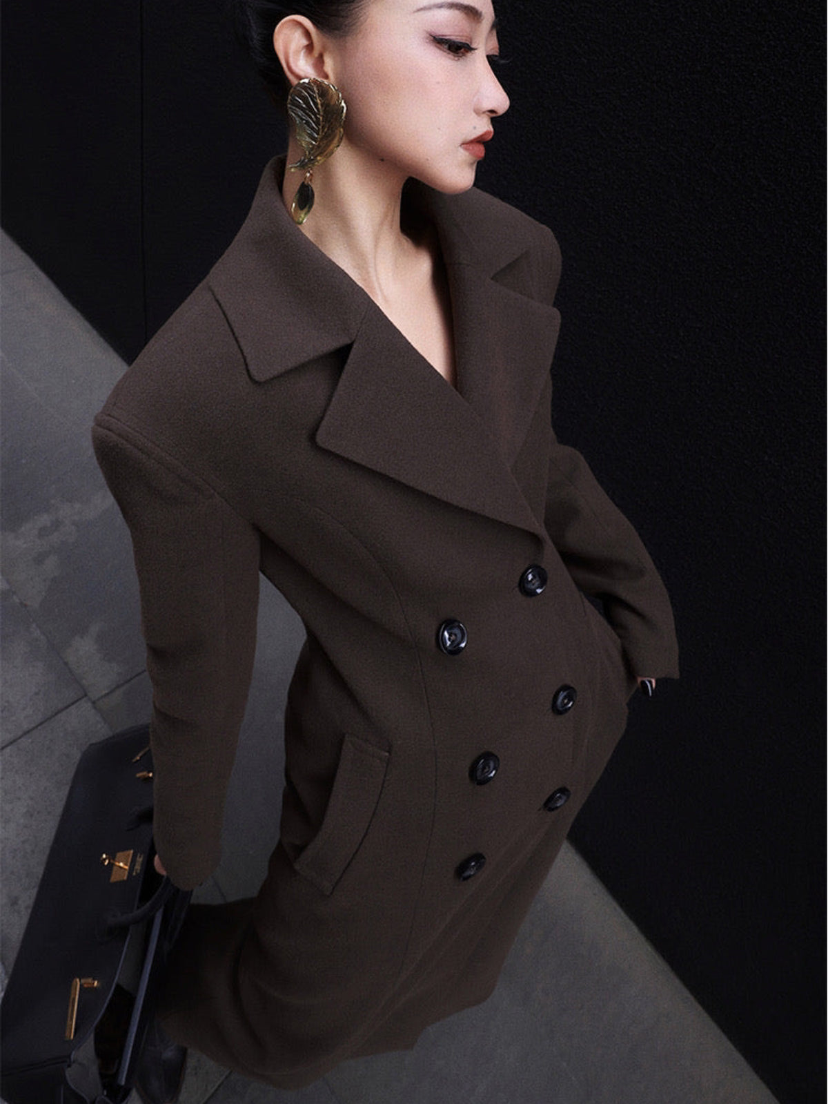 Tailored to perfection with a wide-shoulder silhouette and a softly nipped-in waist, this coat strikes the balance between sharp structure and casual elegance. The sculpted fit flatters every frame—yes, every frame—while the statement lapels and mid-calf length bring the drama.