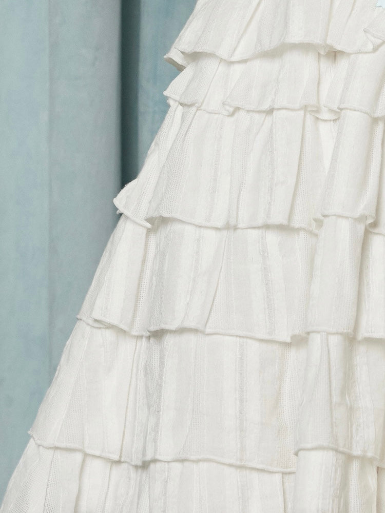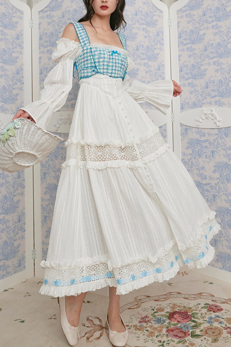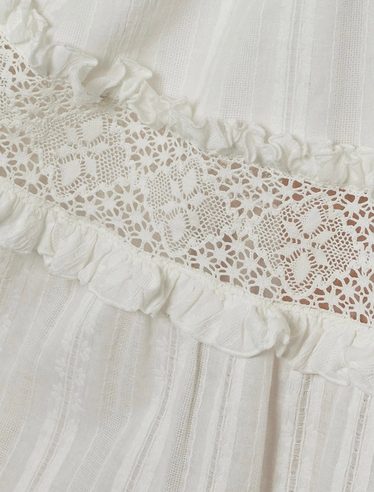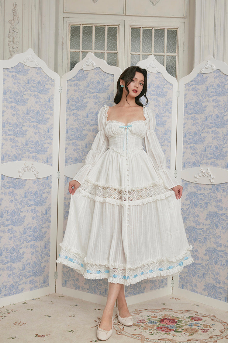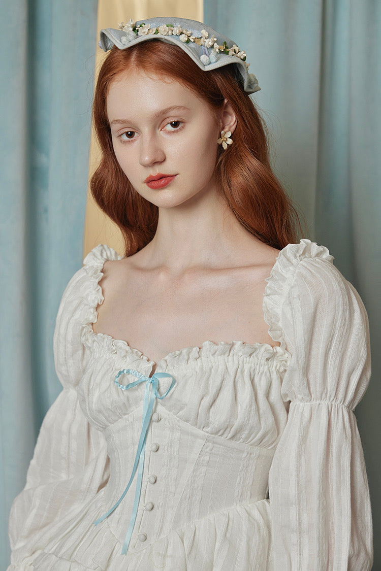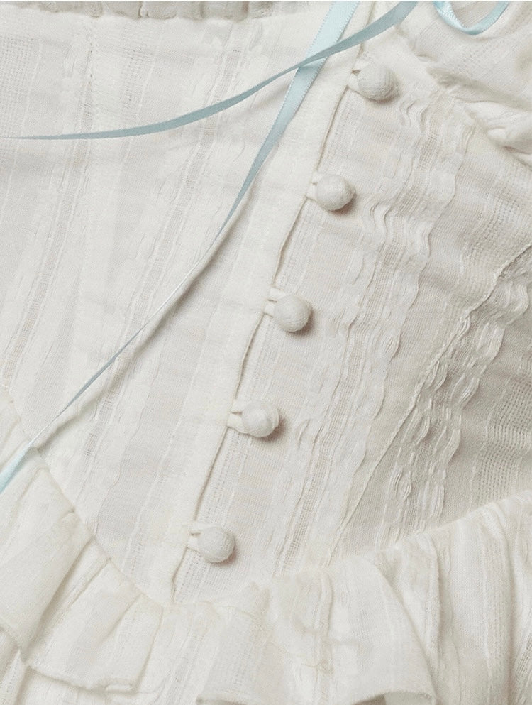 Thoughtful touches like fabric-covered mushroom buttons, scalloped lace trim at the hem, and a contrasting cotton ribbon you can tie to adjust the volume—every detail is designed to feel a little more special.