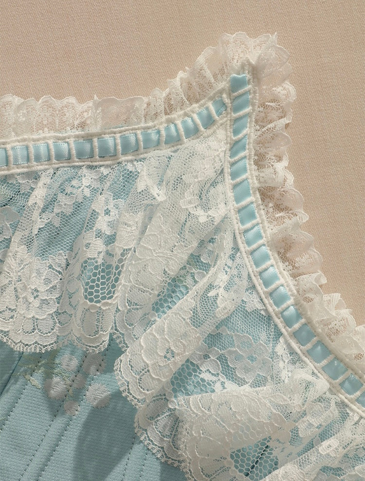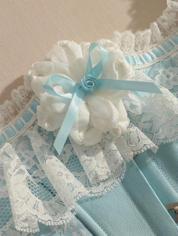 Every detail is thoughtfully placed—like the hand-stitched 3D blossoms and tonal satin ribbon flowers at the neckline, framed with triple-layered lace trims that echo vintage charm. At the hem, a detachable ruffled garter strap adds an extra dose of allure, finished with dainty handmade bows.