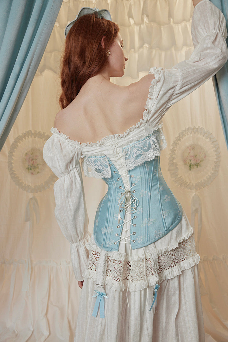 Inspired by the iconic S-bend silhouette of the early 20th century, ‘Waldena’ is crafted in a soft, powdery blue jacquard with a delicately raised floral weave that’s both rich in texture and dreamlike in appearance. The structured yet supple fabric is lined in tonal satin stretch duchesse, giving a silky-smooth feel against the skin and a subtle sheen that catches the light just right.