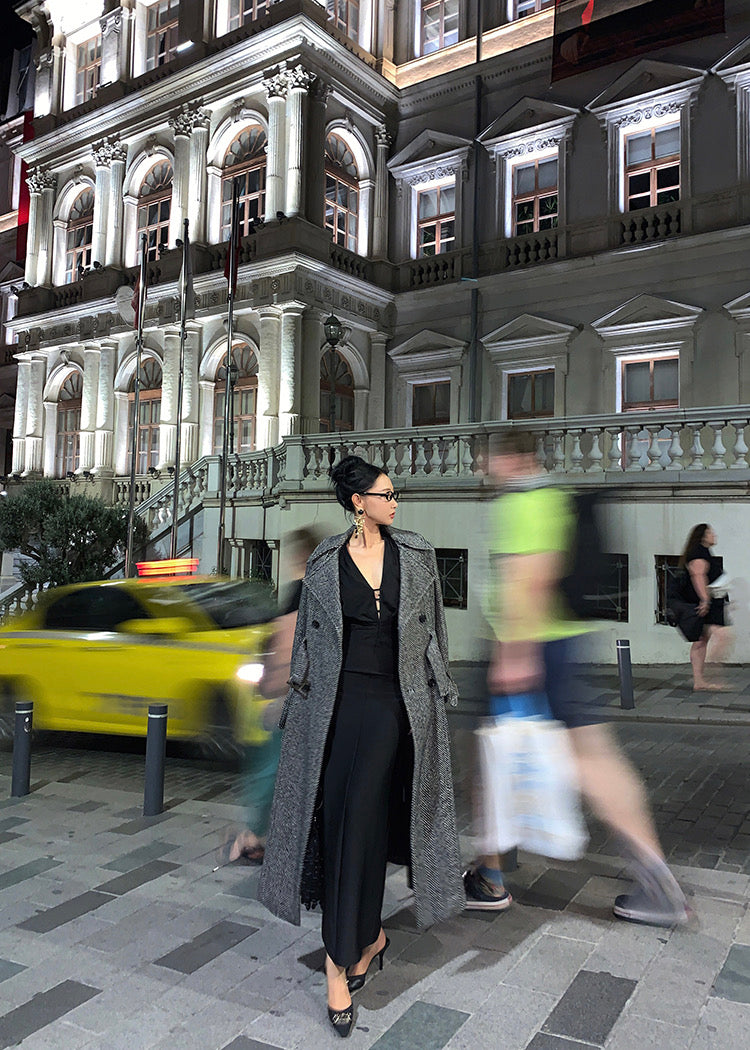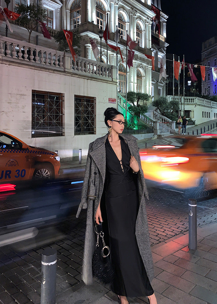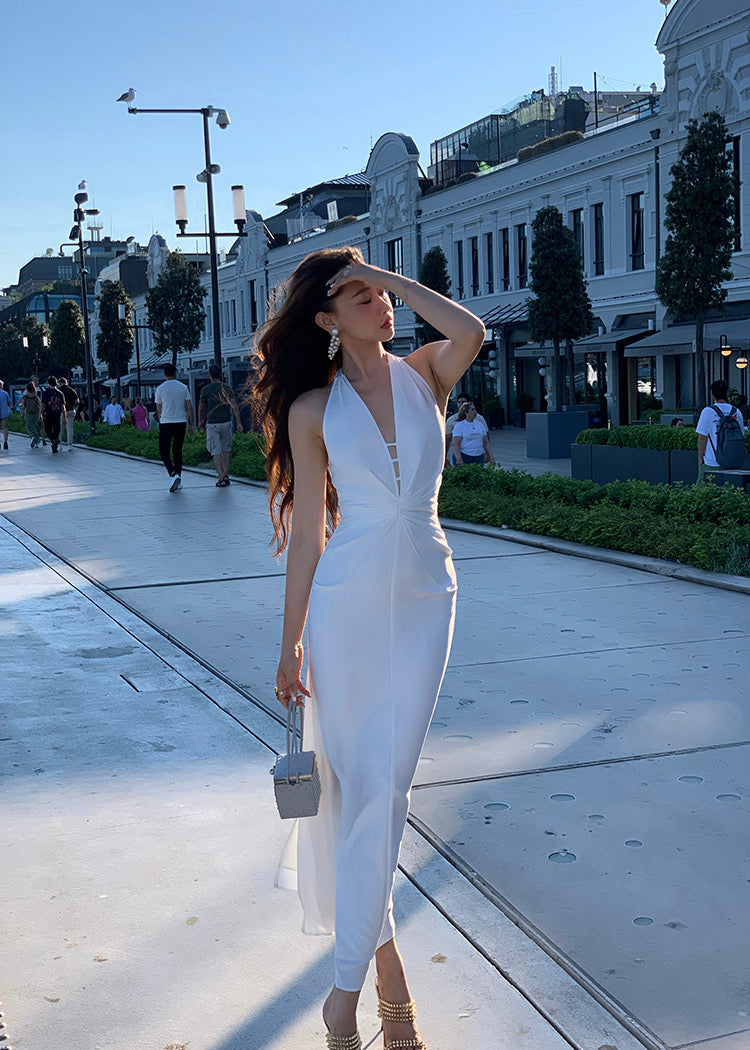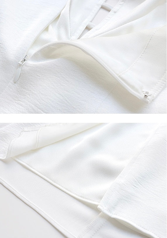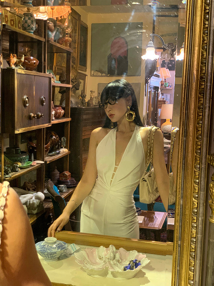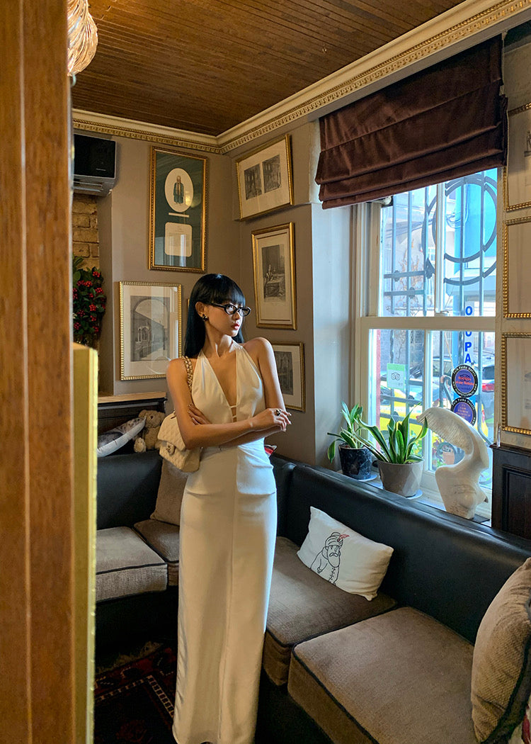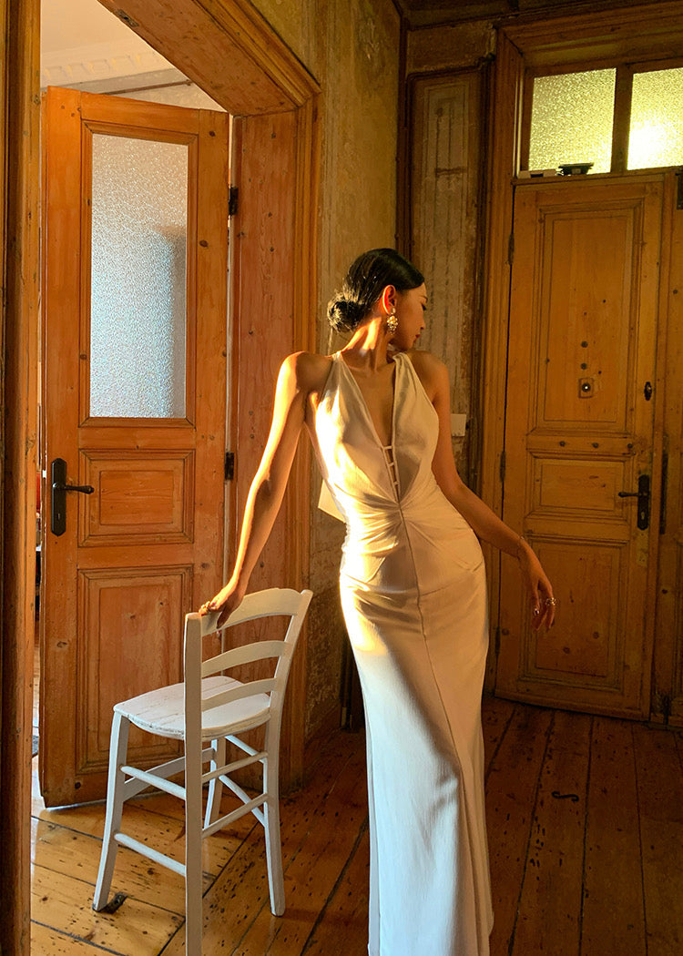At the waist, we crafted each pleat by hand directly on the mannequin — yes, really — then set them in place with high-temperature pressing to achieve that airy, fluid texture that flatters the midsection without ever feeling stiff. It’s tailoring with a light touch.